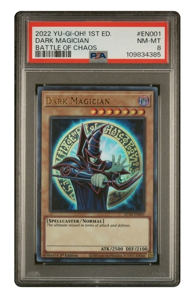 This 2022 YU-GI-OH! BACH-BATTLE OF CHAOS card features the iconic character, Dark Magician, in a stunning design. The card is a 1st Edition and has the card number EN001. It belongs to the Darkness attribute and is part of the Yu-Gi-Oh! TCG game. The card is manufactured in 2022 and has a PSA 8 rating. It is a must-have for any collectible card games enthusiast. Get your hands on this rare card and add it to your collection today.