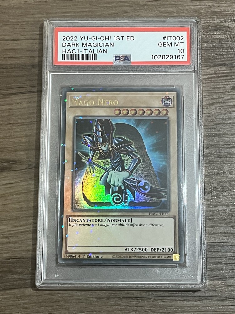 The product is a 2022 Italian Yu-Gi-Oh! Dark Magician (Mago Nero) trading card manufactured by Konami. This card features a holographic finish and is a Rare 1st Edition. It is in near mint condition and is in the Japanese card size. The card is not autographed and is not graded by PSA. The Dark Magician card falls under the Creature/Monster Type category and is part of the Yu-Gi-Oh! TCG game.