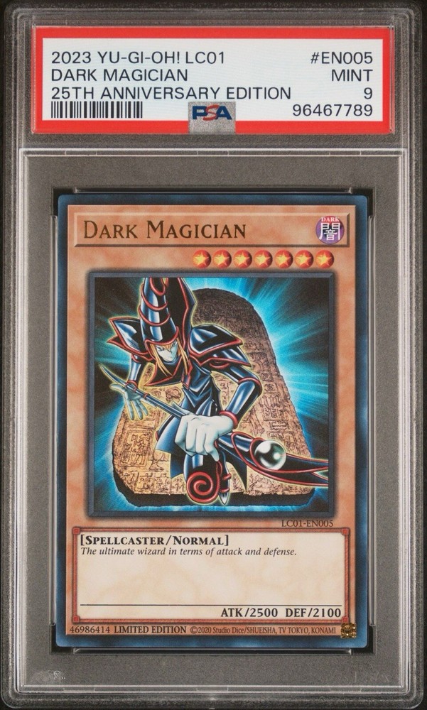 This Dark Magician card from the Legendary Collection: 25th Anniversary Edition is a must-have for any Yu-Gi-Oh! TCG collector. With its ultra rare status and limited edition features, this card is highly sought after by players and collectors alike. Featuring the iconic spellcaster monster type, this card has a defense/toughness of 2100 and an attack/power of 2500. Its dark attribute/color adds to its unique appeal. The card is in English language and has the card number LC01-EN005. Don't miss your chance to add this valuable card to your collection.