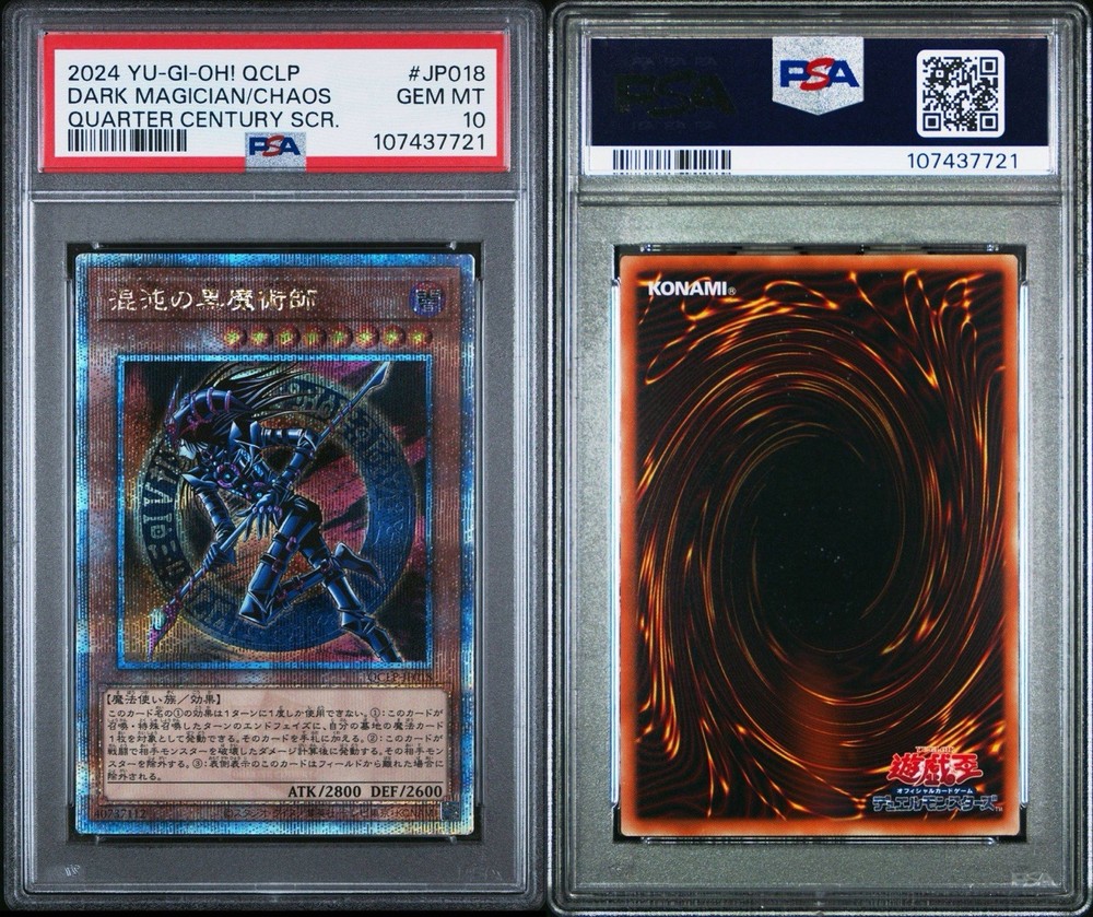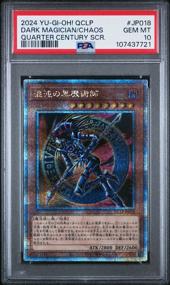 The product is a highly sought-after 2024 YUGIOH! Dark Magician of Chaos card from the Quarter Century 25th set, graded as a PSA 10. This Japanese-sized card features the character Dark Magician of Chaos in foil finish, making it a rare collectible for fans of the Yu-Gi-Oh! TCG. Produced by Konami and authenticated by Professional Sports Authenticator, this card is a valuable addition to any card collection, especially for those who appreciate dark-themed cards in pristine condition. Any questions just ask! Thanks for looking!