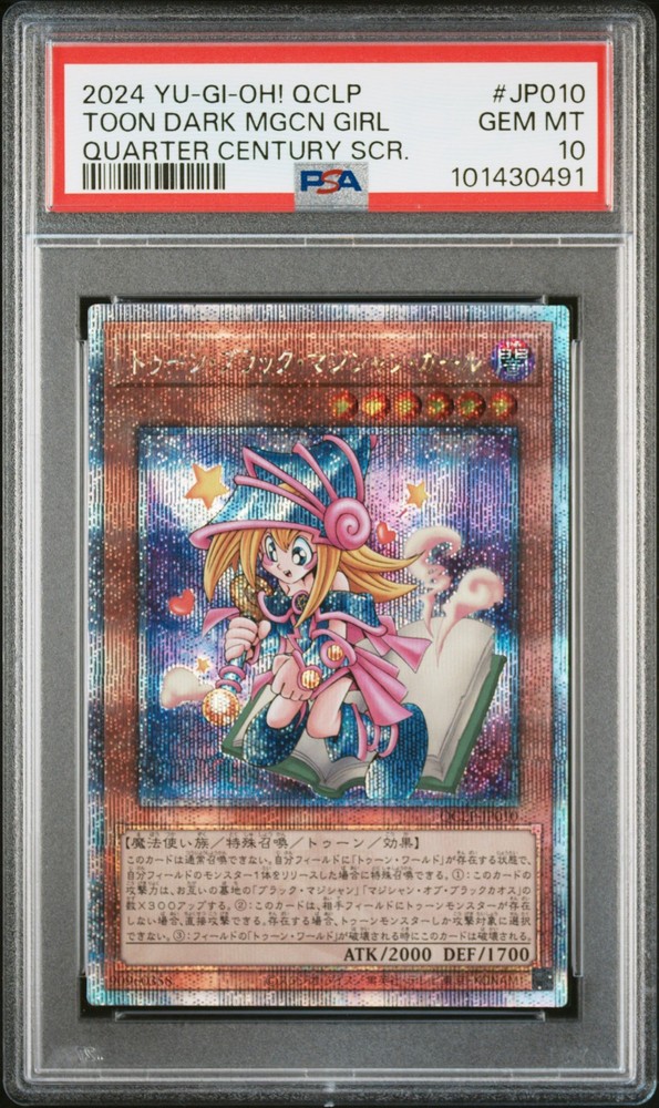 2024 YU-GI-OH! JAPANESE QCLP-QUARTER CENTURY LIMITED PACK QUARTER CENTURY SECRET RARE #JP010 TOON DARK MAGICIAN GIRL PSA 10 2024 YU-GI-OH! JAPANESE QCLP-QUARTER CENTURY LIMITED PACK QUARTER CENTURY SECRET RARE #JP010 TOON DARK MAGICIAN GIRL PSA 10 Purchase Info Thank you for your interest in this item consigned with PSA! By purchasing or making an offer on this item, you acknowledge and agree to the following terms: All sales are final. Returns not accepted. Payment must be made upon purchase of the item. All items are sold "as is" and without warranty of Collectors Universe, Inc. (d/b/a PSA), and ANY AND ALL IMPLIED WARRANTIES ARE DISCLAIMED AND EXCLUDED. Sales tax may apply depending on shipping address. PSA does not guarantee that another third-party grading company's authentication or certification of an item as genuine is correct or accurate. Neither a difference of opinion between third-party grading companies about authenticity, nor a company's subsequent reversal of its earlier authentication or certification of an item, will be a basis for rescinding a sale. Any dispute with another third-party grading company relating to the authenticity of an item must be resolved directly with that other company. Collectors' maximum liability in the event of loss or damage to an item during shipping will be the lesser of (a) the price paid for the item and (b) the change in fair market value of the item. You release Collectors from all other liability including for any claims of punitive damages, emotional distress, consequential damages, lost profits, or lost interest, except as prohibited by law. Shipping Purchased Items will be shipped directly from PSA Vault. You stay hands-free. PSA Vault When you purchase this item, you can save on sales tax and selling fees by keeping it in the PSA Vault, official Vault of eBay. Items already in PSA Vault and will be sent to PSA Vault will have no shipping charge Storage of any items with the PSA Vault will be subject to the PSA Vault Terms of Service. Consignment PSA has competitive rates on the world's largest collectibles marketplace with the option to list from the PSA Vault or immediately after PSA authentication and grading. Sale Price Under $100 $100 - $499 $500 - $999 $1,000 - $2,499 $2,500 - $4,999 $5,000+ Seller Fee 16% 14% 13% 10% 9% 7% Sellers pay a single fee as reflected above; no additional eBay fees are incurred. There is a $5 minimum fee on sold items.