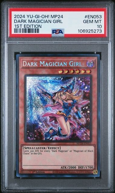 The 2024 YU-GI-OH! MP24-25TH ANV TIN: DUELING MIRRORS DARK MAGICIAN GIRL PSA 10 is a highly sought-after collectible card game item featuring the character Dark Magician Girl from the Yu-Gi-Oh! TCG. This 1st Edition card is part of the 2024 anniversary tin set and has been graded as a PSA 10, indicating it is in pristine condition. With its dark attribute and unique design, this card is sure to be a valuable addition to any collector's deck.