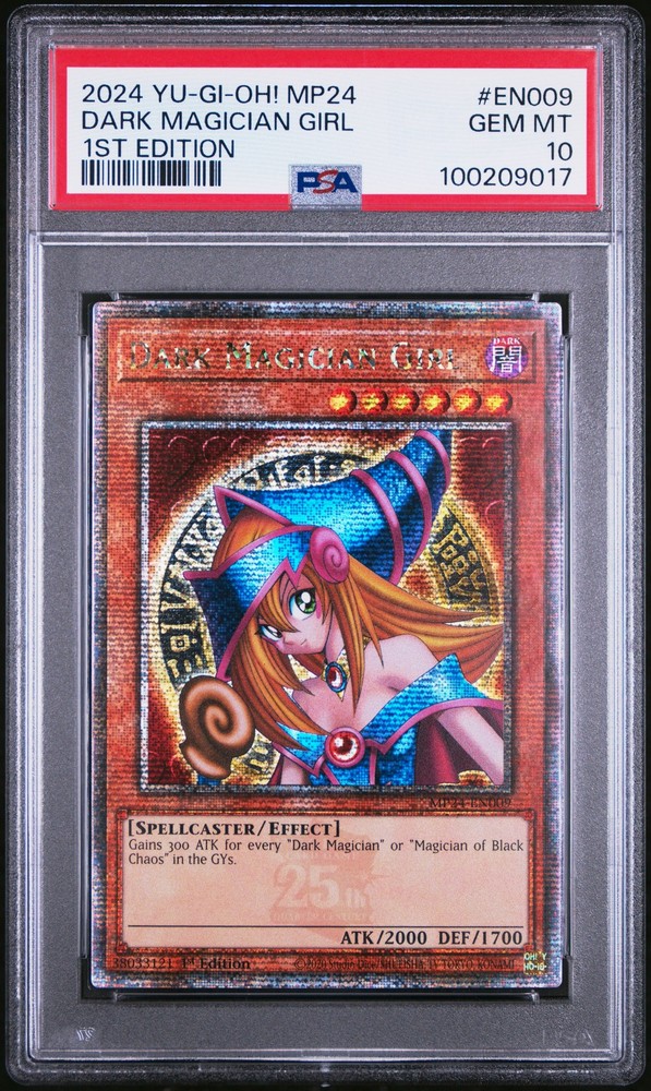 2024 YU-GI-OH! MP24-25TH ANNIVERSARY TIN: DUELING MIRRORS 1ST EDITION #EN009 DARK MAGICIAN GIRL PSA 10 2024 YU-GI-OH! MP24-25TH ANNIVERSARY TIN: DUELING MIRRORS 1ST EDITION #EN009 DARK MAGICIAN GIRL PSA 10 Purchase Info Thank you for your interest in this item consigned with PSA! By purchasing or making an offer on this item, you acknowledge and agree to the following terms: All sales are final. Returns not accepted. Payment must be made upon purchase of the item. All items are sold "as is" and without warranty of Collectors Universe, Inc. (d/b/a PSA), and ANY AND ALL IMPLIED WARRANTIES ARE DISCLAIMED AND EXCLUDED. Sales tax may apply depending on shipping address. PSA does not guarantee that another third-party grading company's authentication or certification of an item as genuine is correct or accurate. Neither a difference of opinion between third-party grading companies about authenticity, nor a company's subsequent reversal of its earlier authentication or certification of an item, will be a basis for rescinding a sale. Any dispute with another third-party grading company relating to the authenticity of an item must be resolved directly with that other company. Collectors' maximum liability in the event of loss or damage to an item during shipping will be the lesser of (a) the price paid for the item and (b) the change in fair market value of the item. You release Collectors from all other liability including for any claims of punitive damages, emotional distress, consequential damages, lost profits, or lost interest, except as prohibited by law. Shipping Purchased Items will be shipped directly from PSA Vault. You stay hands-free. PSA Vault When you purchase this item, you can save on sales tax and selling fees by keeping it in the PSA Vault, official Vault of eBay. Items already in PSA Vault and will be sent to PSA Vault will have no shipping charge Storage of any items with the PSA Vault will be subject to the PSA Vault Terms of Service. Consignment PSA has competitive rates on the world's largest collectibles marketplace with the option to list from the PSA Vault or immediately after PSA authentication and grading. Sale Price Under $100 $100 - $499 $500 - $999 $1,000 - $2,499 $2,500 - $4,999 $5,000+ Seller Fee 16% 14% 13% 10% 9% 7% Sellers pay a single fee as reflected above; no additional eBay fees are incurred. There is a $5 minimum fee on sold items.