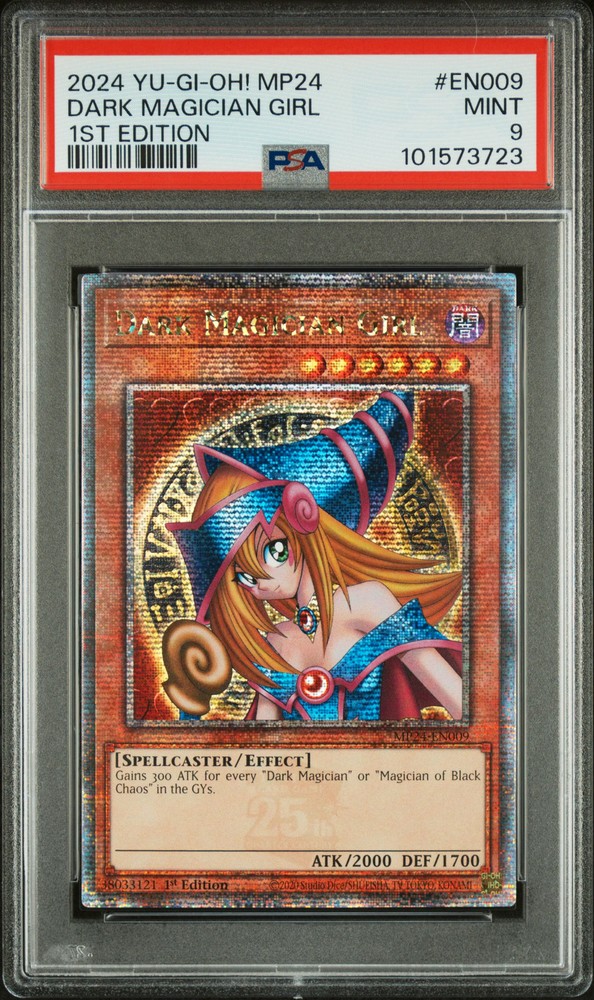 2024 YU-GI-OH! MP24-25TH ANNIVERSARY TIN: DUELING MIRRORS 1ST EDITION #EN009 DARK MAGICIAN GIRL PSA 9 2024 YU-GI-OH! MP24-25TH ANNIVERSARY TIN: DUELING MIRRORS 1ST EDITION #EN009 DARK MAGICIAN GIRL PSA 9 Purchase Info Thank you for your interest in this item consigned with PSA! By purchasing or making an offer on this item, you acknowledge and agree to the following terms: All sales are final. Returns not accepted. Payment must be made upon purchase of the item. All items are sold "as is" and without warranty of Collectors Universe, Inc. (d/b/a PSA), and ANY AND ALL IMPLIED WARRANTIES ARE DISCLAIMED AND EXCLUDED. Sales tax may apply depending on shipping address. PSA does not guarantee that another third-party grading company's authentication or certification of an item as genuine is correct or accurate. Neither a difference of opinion between third-party grading companies about authenticity, nor a company's subsequent reversal of its earlier authentication or certification of an item, will be a basis for rescinding a sale. Any dispute with another third-party grading company relating to the authenticity of an item must be resolved directly with that other company. Collectors' maximum liability in the event of loss or damage to an item during shipping will be the lesser of (a) the price paid for the item and (b) the change in fair market value of the item. You release Collectors from all other liability including for any claims of punitive damages, emotional distress, consequential damages, lost profits, or lost interest, except as prohibited by law. Shipping Purchased Items will be shipped directly from PSA Vault. You stay hands-free. PSA Vault When you purchase this item, you can save on sales tax and selling fees by keeping it in the PSA Vault, official Vault of eBay. Items already in PSA Vault and will be sent to PSA Vault will have no shipping charge Storage of any items with the PSA Vault will be subject to the PSA Vault Terms of Service. Consignment PSA has competitive rates on the world's largest collectibles marketplace with the option to list from the PSA Vault or immediately after PSA authentication and grading. Sale Price Under $100 $100 - $499 $500 - $999 $1,000 - $2,499 $2,500 - $4,999 $5,000+ Seller Fee 16% 14% 13% 10% 9% 7% Sellers pay a single fee as reflected above; no additional eBay fees are incurred. There is a $5 minimum fee on sold items.