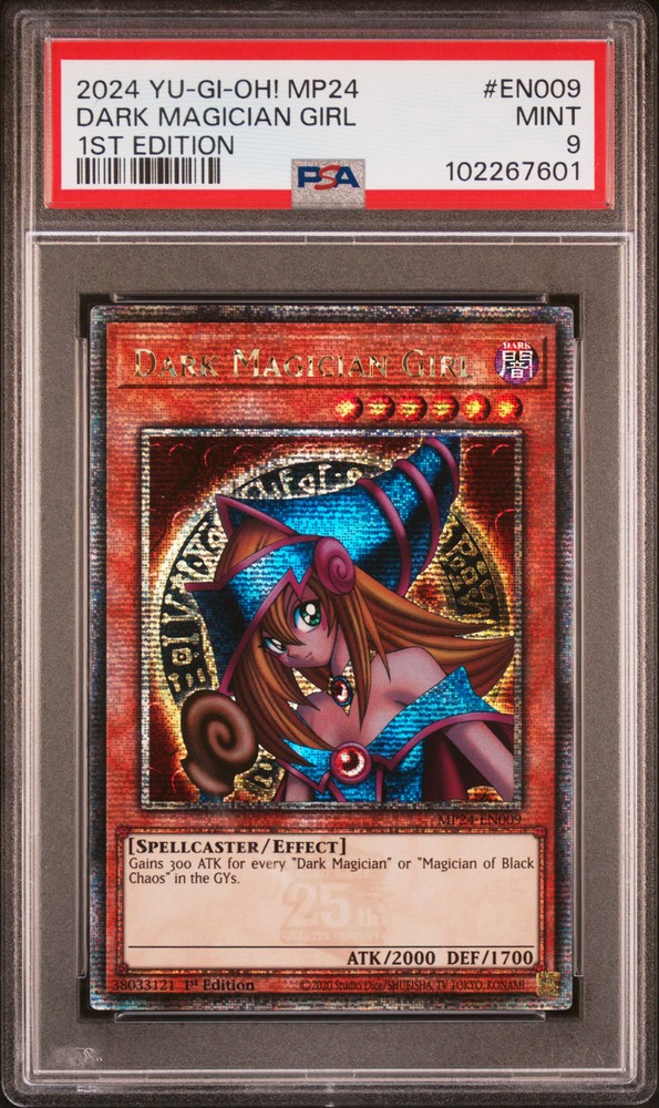2024 YU-GI-OH! MP24-25TH ANNIVERSARY TIN: DUELING MIRRORS 1ST EDITION #EN009 DARK MAGICIAN GIRL PSA 9 2024 YU-GI-OH! MP24-25TH ANNIVERSARY TIN: DUELING MIRRORS 1ST EDITION #EN009 DARK MAGICIAN GIRL PSA 9 Purchase Info Thank you for your interest in this item consigned with PSA! By purchasing or making an offer on this item, you acknowledge and agree to the following terms: All sales are final. Returns not accepted. Payment must be made upon purchase of the item. All items are sold "as is" and without warranty of Collectors Universe, Inc. (d/b/a PSA), and ANY AND ALL IMPLIED WARRANTIES ARE DISCLAIMED AND EXCLUDED. Sales tax may apply depending on shipping address. PSA does not guarantee that another third-party grading company's authentication or certification of an item as genuine is correct or accurate. Neither a difference of opinion between third-party grading companies about authenticity, nor a company's subsequent reversal of its earlier authentication or certification of an item, will be a basis for rescinding a sale. Any dispute with another third-party grading company relating to the authenticity of an item must be resolved directly with that other company. Collectors' maximum liability in the event of loss or damage to an item during shipping will be the lesser of (a) the price paid for the item and (b) the change in fair market value of the item. You release Collectors from all other liability including for any claims of punitive damages, emotional distress, consequential damages, lost profits, or lost interest, except as prohibited by law. Shipping Purchased Items will be shipped directly from PSA Vault. You stay hands-free. PSA Vault When you purchase this item, you can save on sales tax and selling fees by keeping it in the PSA Vault, official Vault of eBay. Items already in PSA Vault and will be sent to PSA Vault will have no shipping charge Storage of any items with the PSA Vault will be subject to the PSA Vault Terms of Service. Consignment PSA has competitive rates on the world's largest collectibles marketplace with the option to list from the PSA Vault or immediately after PSA authentication and grading. Sale Price Under $100 $100 - $499 $500 - $999 $1,000 - $2,499 $2,500 - $4,999 $5,000+ Seller Fee 16% 14% 13% 10% 9% 7% Sellers pay a single fee as reflected above; no additional eBay fees are incurred. There is a $5 minimum fee on sold items.