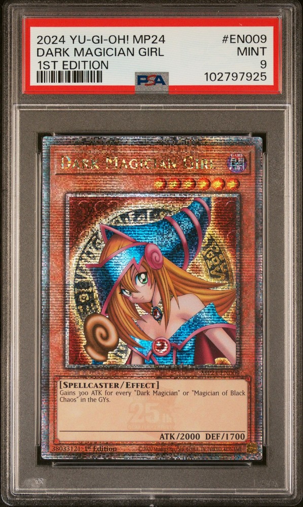 2024 YU-GI-OH! MP24-25TH ANNIVERSARY TIN: DUELING MIRRORS 1ST EDITION #EN009 DARK MAGICIAN GIRL PSA 9 2024 YU-GI-OH! MP24-25TH ANNIVERSARY TIN: DUELING MIRRORS 1ST EDITION #EN009 DARK MAGICIAN GIRL PSA 9 Purchase Info Thank you for your interest in this item consigned with PSA! By purchasing or making an offer on this item, you acknowledge and agree to the following terms: All sales are final. Returns not accepted. Payment must be made upon purchase of the item. All items are sold "as is" and without warranty of Collectors Universe, Inc. (d/b/a PSA), and ANY AND ALL IMPLIED WARRANTIES ARE DISCLAIMED AND EXCLUDED. Sales tax may apply depending on shipping address. PSA does not guarantee that another third-party grading company's authentication or certification of an item as genuine is correct or accurate. Neither a difference of opinion between third-party grading companies about authenticity, nor a company's subsequent reversal of its earlier authentication or certification of an item, will be a basis for rescinding a sale. Any dispute with another third-party grading company relating to the authenticity of an item must be resolved directly with that other company. Collectors' maximum liability in the event of loss or damage to an item during shipping will be the lesser of (a) the price paid for the item and (b) the change in fair market value of the item. You release Collectors from all other liability including for any claims of punitive damages, emotional distress, consequential damages, lost profits, or lost interest, except as prohibited by law. Shipping Purchased Items will be shipped directly from PSA Vault. You stay hands-free. PSA Vault When you purchase this item, you can save on sales tax and selling fees by keeping it in the PSA Vault, official Vault of eBay. Items already in PSA Vault and will be sent to PSA Vault will have no shipping charge Storage of any items with the PSA Vault will be subject to the PSA Vault Terms of Service. Consignment PSA has competitive rates on the world's largest collectibles marketplace with the option to list from the PSA Vault or immediately after PSA authentication and grading. Sale Price Under $100 $100 - $499 $500 - $999 $1,000 - $2,499 $2,500 - $4,999 $5,000+ Seller Fee 16% 14% 13% 10% 9% 7% Sellers pay a single fee as reflected above; no additional eBay fees are incurred. There is a $5 minimum fee on sold items.