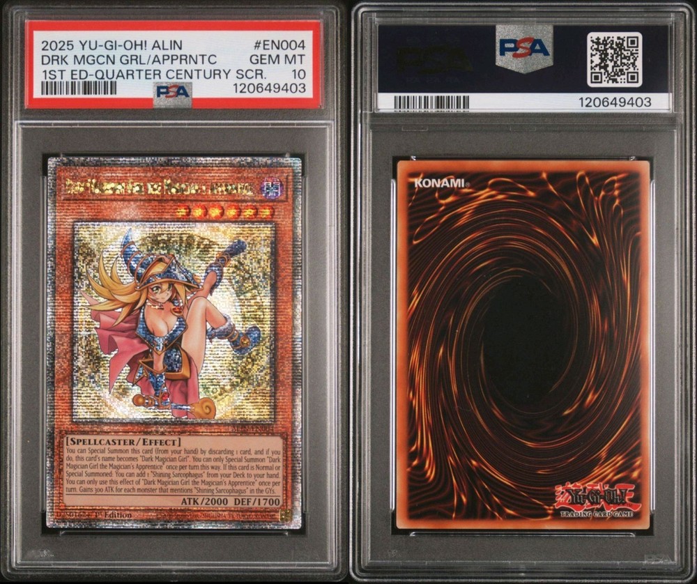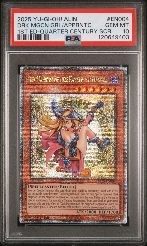 2025 YU-GI-OH! ALIN-ALLIANCE INSIGHT 1ST EDITION-QUARTER CENTURY SECRET RARE #EN004 DARK MAGICIAN GIRL THE MAGICIAN'S APPRENTICE PSA 9 2025 YU-GI-OH! ALIN-ALLIANCE INSIGHT 1ST EDITION-QUARTER CENTURY SECRET RARE #EN004 DARK MAGICIAN GIRL THE MAGICIAN'S APPRENTICE PSA 9 Purchase Info Thank you for your interest in bidding on this item consigned with PSA! By bidding on this item, you acknowledge and agree to the following terms: All sales are final. Returns not accepted. Payment must be made within 7 days of auction close. All items are sold "as is" and without warranty of Collectors Universe, Inc. (d/b/a PSA), and ANY AND ALL IMPLIED WARRANTIES ARE DISCLAIMED AND EXCLUDED. Sales tax may apply depending on shipping address. PSA does not guarantee that another third-party grading company's authentication or certification of an item as genuine is correct or accurate. Neither a difference of opinion between third-party grading companies about authenticity, nor a company's subsequent reversal of its earlier authentication or certification of an item, will be a basis for rescinding a sale. Any dispute with another third-party grading company relating to the authenticity of an item must be resolved directly with that other company. Collectors' maximum liability in the event of loss or damage to an item during shipping will be the lesser of (a) the price paid for the item and (b) the change in fair market value of the item. You release Collectors from all other liability including for any claims of punitive damages, emotional distress, consequential damages, lost profits, or lost interest, except as prohibited by law. Shipping Purchased Items will be shipped directly from PSA Vault. You stay hands-free. PSA Vault When you purchase this item, you can save on sales tax and selling fees by keeping it in the PSA Vault, official Vault of eBay. Items already in PSA Vault and will be sent to PSA Vault will have no shipping charge Storage of any items with the PSA Vault will be subject to the PSA Vault Terms of Service. Consignment PSA has competitive auction rates on the world's largest collectibles marketplace with the option to list from the PSA Vault or immediately after PSA authentication and grading. Sale Price Under $100 $100 - $499 $500 - $999 $1,000 - $2,499 $2,500 - $4,999 $5,000+ Seller Fee 13% + $3 flat 13% 12% 10% 9% 7% Sellers pay a single fee as reflected above; no additional eBay fees are incurred.