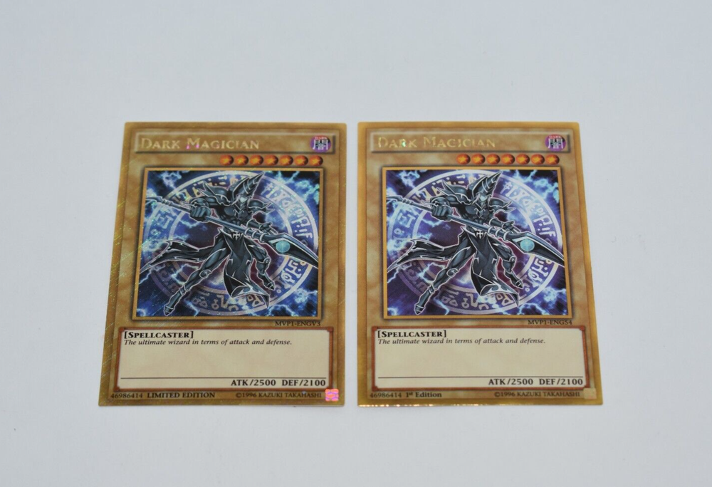 This listing Includes: Dark Magician (MVP1-ENGV3) Limited Edition Dark Magician (MVP1-ENG54) 1ST Edition From the Dark Side Of Dimensions Movie Pack Gold Secret Rares in moderately played condition with light surface scratches. (STOCK# A0539-B2-102)