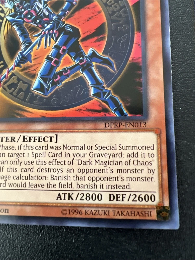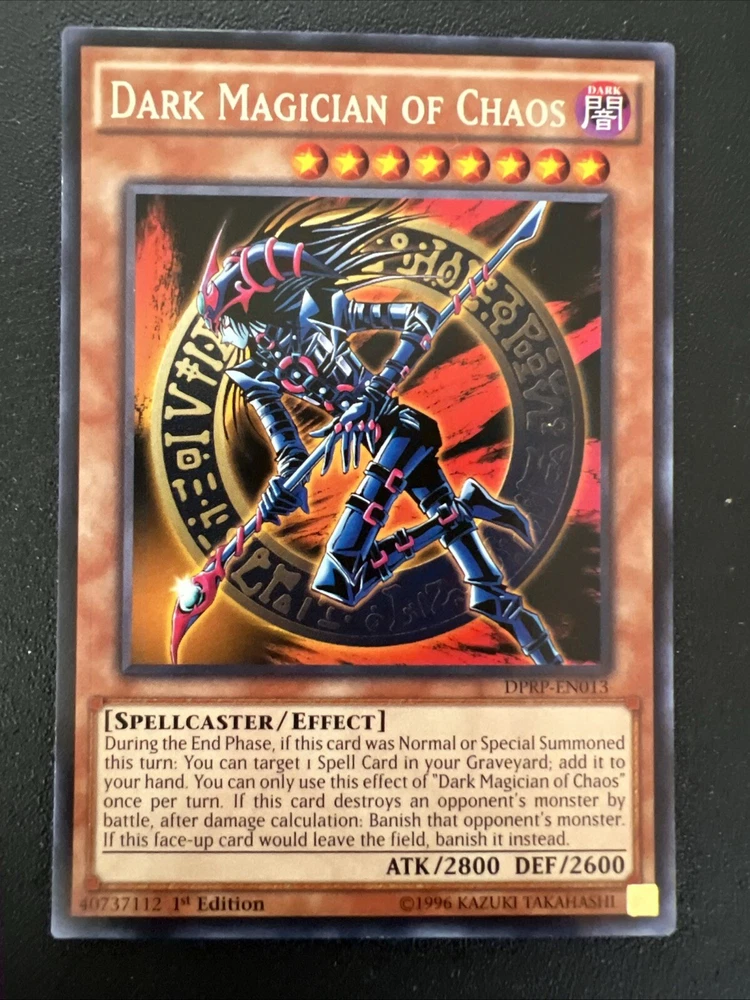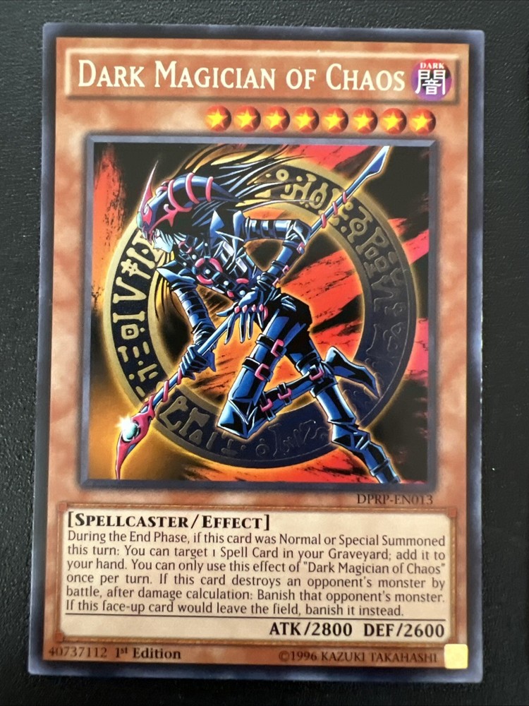 Explore the mystical realms of the Yu-Gi-Oh! TCG with the vintage Dark Magician of Chaos card, a classic addition to any collection. Dating back to 1996, this 1st Edition card, numbered DPRP – EN013, is a nostalgic piece from the early days of the game. Its regular finish and standard size make it a timeless collectible for enthusiasts and players alike. In English and suited for ages 6 and up, this card brings the iconic 'Dark Magician of Chaos' character to your deck or display. The card's vintage status adds to its collectibility, making it a must-have for those who appreciate the history and evolution of the Yu-Gi-Oh! trading card game. Best offer wanted!! The listing price is just a number. Your offer is most important so please do not hesitate to give me your best offer. Thank you for your interest. God bless!