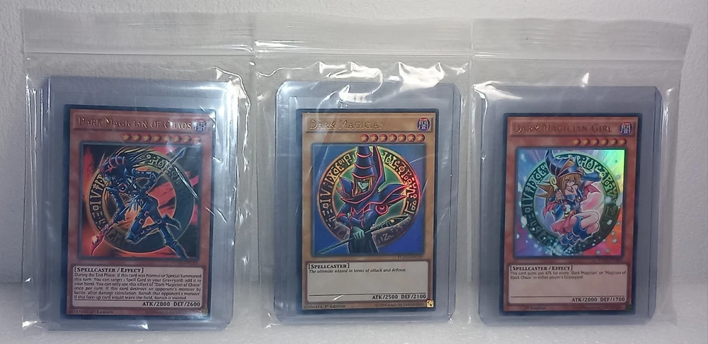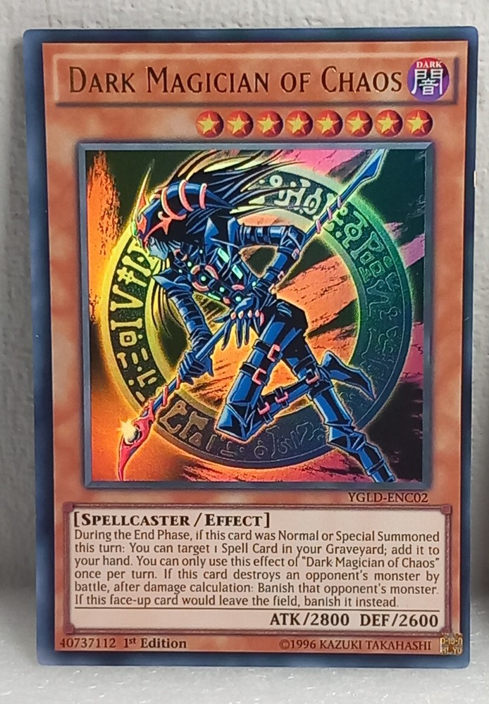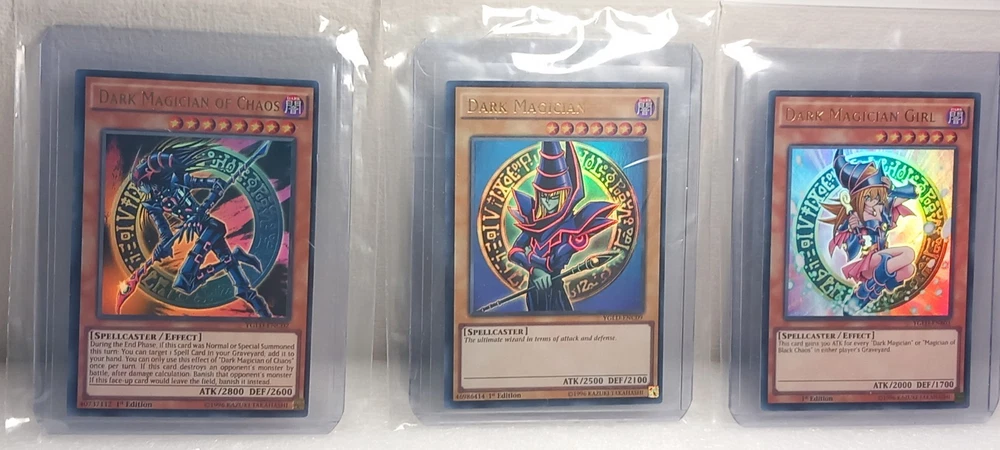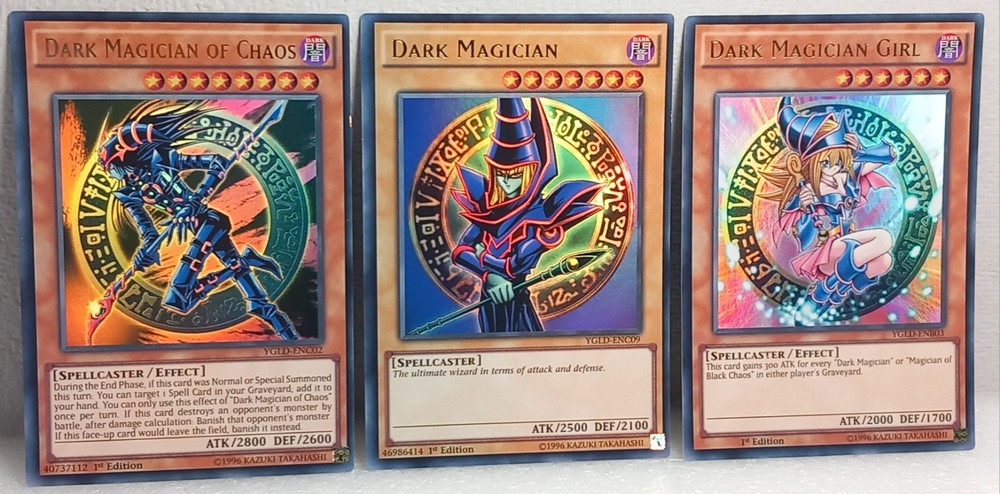 3 Yu-Gi-Oh cards YGLD-ENC09 Dark Magician ENB03Dark Magician Girl and ENC02 Dark Magician of Chaos. From 2015. Cards are dated 1996 . Condition: couple of edge nicks otherwise Near Mint with no play visible, just been sleeved and stored. Sold as Pictured. . . please refer to photos. Will be shipped in a sleeved and rigid saver and bagged as per photo. See the last picture. Please refer to the pictures provided as this is part of the description. Thank you. Postage within United Kingdom £2.80 tracked delivery. Worldwide shipping available. E.U. - £14.75 Tracked and signed BOXED R.O.W. - £18.75 Tracked and signed BOXED RETURNS POLICY AS FOLLOWS: NO RETURNS ON USED AND SECOND HAND ITEMS AS SIGNS OF WEAR AND TEAR WILL BE EVIDENT MOST OF THE TIME AND RETURNS ARE ONLY ACCEPTED IF THE WRONG ITEM IS SENT OR IT DOES NOT MATCH THE DESCRIPTION AND PHOTOS PROVIDED. . . Thank you for your interest and for stopping by to view items on offer. . . .