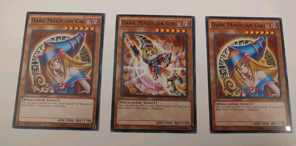 The product is a set of three Yu-Gi-Oh! cards featuring the Dark Magician Girl. The cards are of Common rarity and have unlimited editions. The Dark Magician Girl is a spellcaster/effect card with the attribute of Darkness. The card names are YGLD-ENA04, YGLD-ENC10, and SDMY-EN011. These cards are sought after by collectors and players of the Yu-Gi-Oh! trading card game for their strategic value and iconic character design. Shipping will be via USPS and will include tracking