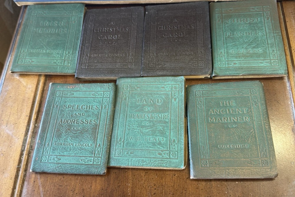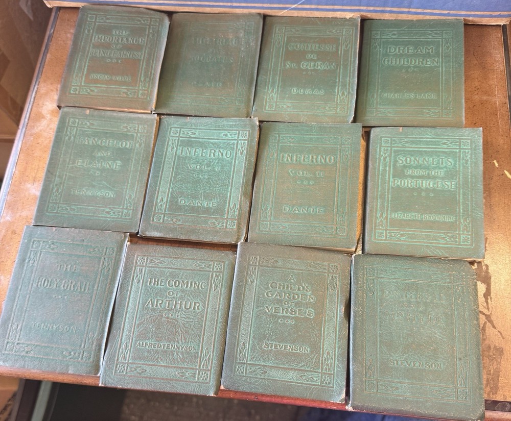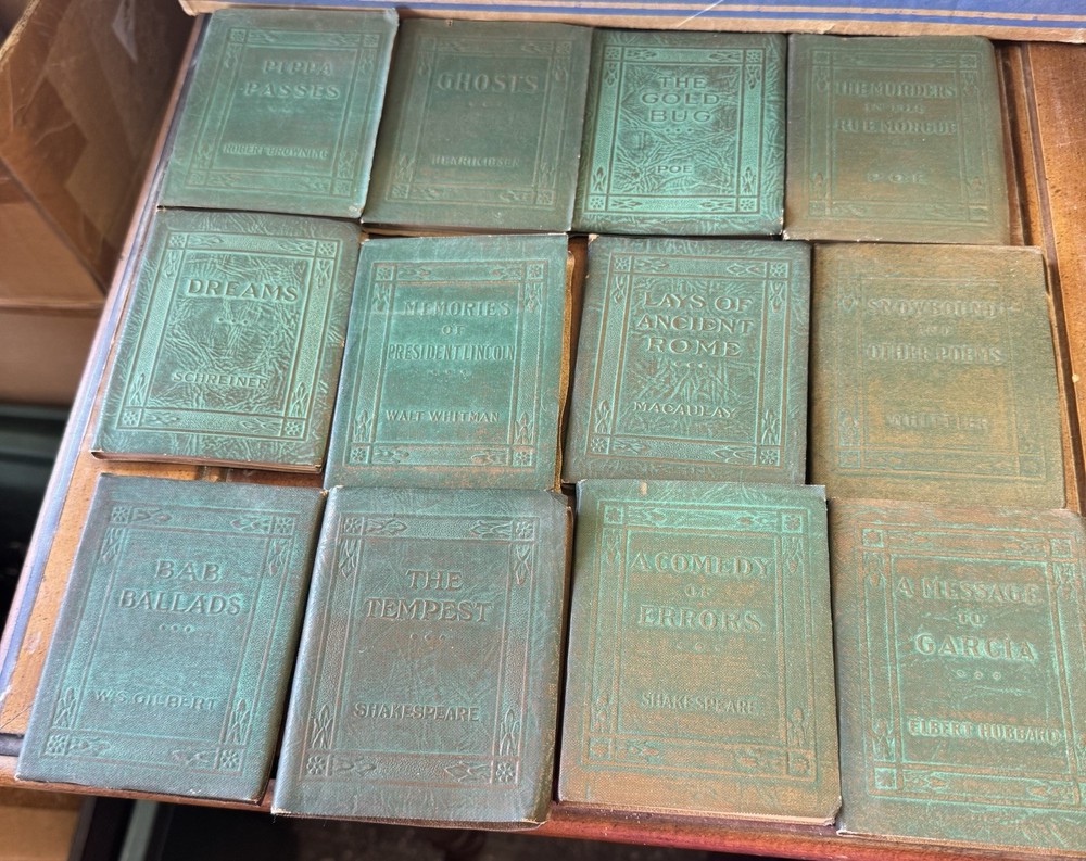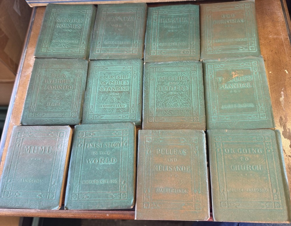 No return refund or replacement Ebay has a moneyback guarantee if damage in shipping Sold as is Absolutely! Here’s a clean, alphabetized list of the titles you provided (some normalized for spelling and consistency). These are all from the Little Leather Library series: ⸻ 📚 Alphabetical List of Books 1. A Christmas Carol – Charles Dickens (x2) 2. A Man Without a Country – Edward Everett Hale 3. Ancient Mariner – Samuel Taylor Coleridge 4. BAB Ballads – W. S. Gilbert 5. Children’s Dreams – Charles Lamb 6. Christ in Flanders – Honoré de Balzac 7. A Children’s Garden of Verses – Robert Louis Stevenson 8. Comtesse de St. Geran – Alexandre Dumas 9. Dr. Jekyll and Mr. Hyde – Robert Louis Stevenson 10. Dreams – Olive Schreiner 11. The Coming of Arthur – Alfred Lord Tennyson 12. The Gold-Bug – Edgar Allan Poe 13. Ghosts – Henrik Ibsen 14. Hiawatha, Vol. I – Henry Wadsworth Longfellow 15. Hiawatha, Vol. II – Henry Wadsworth Longfellow 16. Inferno, Vol. I – Dante Alighieri 17. Inferno, Vol. II – Dante Alighieri 18. Irish Melodies – Thomas Moore 19. Land of Heart’s Desire – W. B. Yeats 20. Lancelot and Elaine – Alfred Lord Tennyson 21. Memoirs of President Lincoln – Walt Whitman 22. Mumu – Ivan Turgenev 23. Old Christmas – Washington Irving 24. On Going to Church – George Bernard Shaw 25. Pelleas and Melisande – Maurice Maeterlinck 26. Pippa Passes – Robert Browning 27. Sherlock Holmes – Arthur Conan Doyle 28. Snowbound and Other Poems – John Greenleaf Whittier 29. Sonnets from the Portuguese – Elizabeth Barrett Browning 30. Speeches and Addresses – Abraham Lincoln 31. Speeches and Letters – George Washington 32. The Comedy of Errors – William Shakespeare 33. The Holy Grail – Alfred Lord Tennyson 34. The Importance of Being Earnest – Oscar Wilde 35. The Murder in the Rue Morgue – Edgar Allan Poe 36. The Tempest – William Shakespeare 37. The Trail of Socrates – Plato 38. Tillyloss Scandal – J. M. Barrie 39. The Lay of Ancient Rome – Thomas Babington Macaulay 40. The Courtship of Miles Standish – Henry Wadsworth Longfellow 41. The Man Without a Country – Edward Everett Hale 42. Find a Story in the World – Rudyard Kipling (likely “The Finest Story in the World”) ⸻ Let me know if you’d like this grouped by author, publication order (approximate), or formatted for printing/inventory.