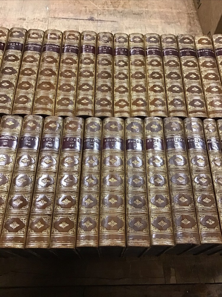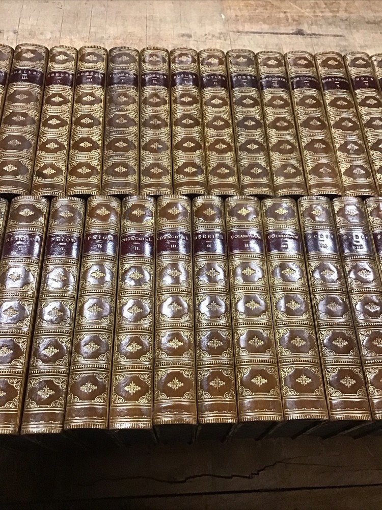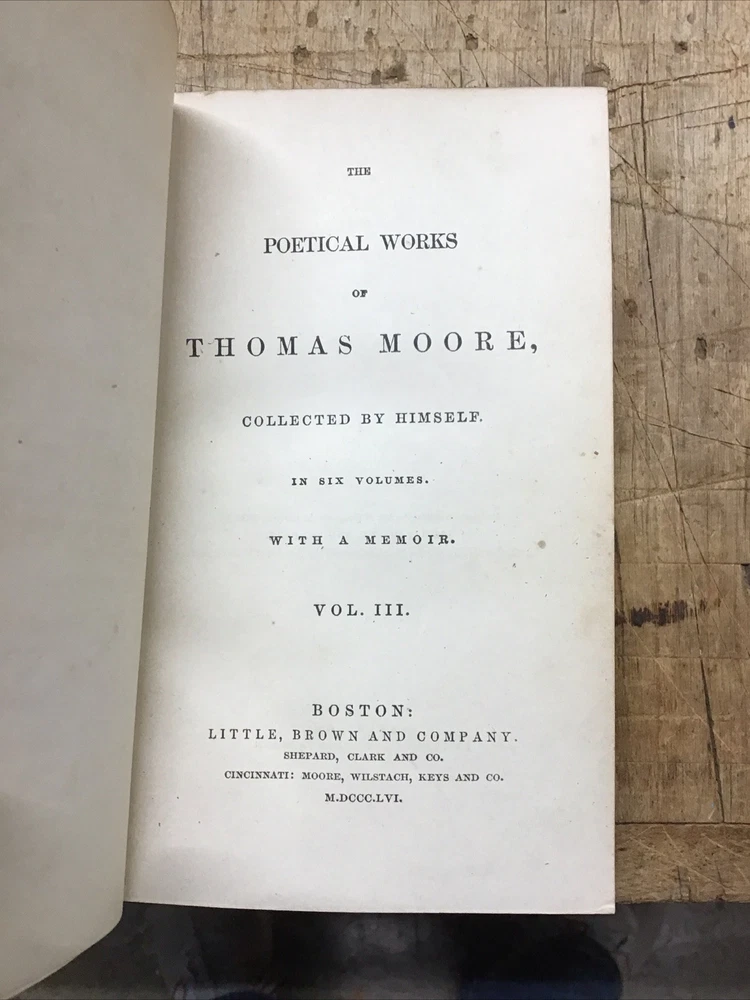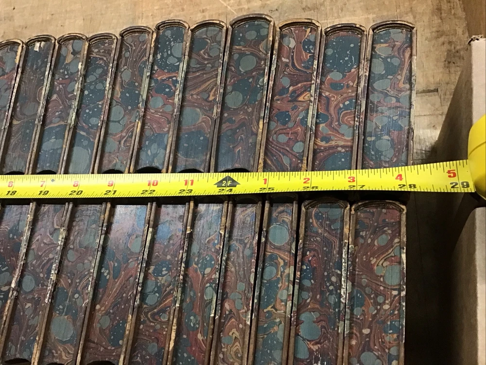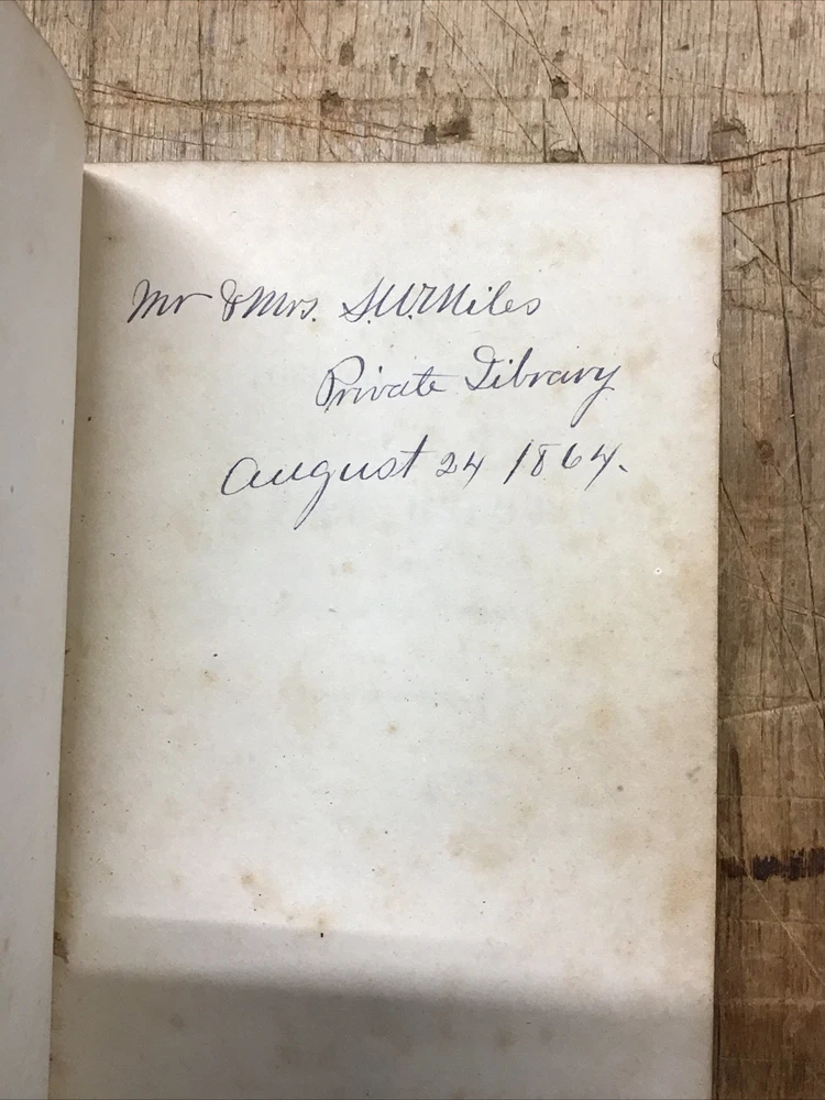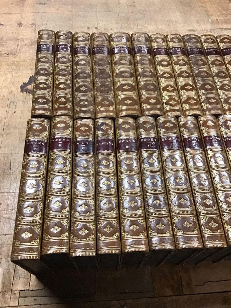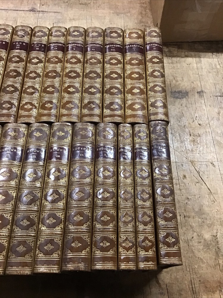 (51) 1856-64 Beautiful Leather Matched Leather Poetry Books By Little, Brown and Company, Boston, dated from 1856 to 1864. Each book penned before the title page as "Mr. & Mrs. S. W. Miles - Private Library - August 24th 1864". Titles (writers) include Lord Byron, Thomas Moore, John Skelton, Robert Burns, Thomas Hood, Robert Southey, Percy Bysshe Shelley, Matthew Prior, James Mongomery, William Wordsworth, S. T. Coleridge, William Cowper, Charles Churchill, Thomas Chatterton, Edward Young, James Thomson, Robert Herrick, John Gay and Samuel Butler. All matching with golden leather around the marbleized end bords with matching page edges. Size 4.5 x 6.7/8” They will take up approximately 56” of book shelf space. Possible information on previous owner found on internet Submitted by Kerry Patrick The late Stephen W. Miles, who died in the year 1872, is deserving of a place among the list of biographies included in this work, no less for his qualities as a prominent business man and an exemplary member of the community, as for his connection with some of the old families of the American Bottom. By his mother he was connected with the Shook family - one of the earliest to settle in Moredock precinct, and his father whose name was also Stephen W. Miles, was a resident of Monroe county as early as the year 1819. The Miles family is probably of Welsh descent. Its first members emigrated to America at a period previous to the Revolutionary war. Some of them took part in that conflict and did their share toward securing the independence of the colonies. Thomas Miles was the grandfather, and married Sarah Fish. Stephen W. Miles, the father was a son by this marriage. He was born at Cazenovia, Madison county, New York, on the thirtieth of November, 1795. He emigrated to Illinois, and settled at Eagle Cliffs in the year 1819. He was at this time a young man of twenty-four. He married Lucretia Shook, and spent the remainder of his life in the American Bottom, where he died. In the year 1858 he built a tomb as a burial place for himself, family and descendants, "to whose use," according to the inscription, "it is freely dedicated under the care of the oldest male heir of his family in succession, in trust for the above purpose." Here rest the remains of the deceased members of the family. The spot is the site of an old burying ground occupying the brow of the Bluff just south of where the Duck Hollow road leads out into the Bottom, overlooking for miles the fertile valley below. The Shook family is of Virginian descent, and was prominent in the settling of the Bottom, where Lucretia Shook, the wife of Stephen W. Miles, sen., was born and raised. Stephen W. Miles, jun., the subject of this biography, was born in the year 1828, in the month of June. Two sisters and a half-brother were other members of the family. The schools in the neighborhood of where he was born gave him advantages for securing his early education. He was under the instruction of a good teacher, and his natural aptitude for learning was so great and he was so industrious in his habits that he made rapid progress. His attainments were far better than ordinary. Through his life he kept up a taste for reading, and acquired thorough scholarship and extended literary culture. He was raised on a farm, and in his youthful years he was employed in agricultural labor, and indeed, though he followed other occupations, he kept up this pursuit through life. In January, of the year 1853, when in the twenty-fifth year of his age, he married Mary E. Tyrrell, then a resident of Monroe county. Mrs. Miles was born in Hancock county, Illinois. Her father was a native of Ohio, and her mother of Pennsylvania. After the occurrence of this event, Mr. Miles went into partnership with his father in the merchandising business, at which he had been previously employed. After a residence in the County of about seven years from the date of this marriage, he removed with his family to St. Louis on account of the great prevalence of sickness in the vicinity of where he lived. While a resident of St. Louis, he carried on business operations in that city, though at the same time his business interests were still largely in the American Bottom. See our other beautiful books Keep in mind the shipping price also covers handling fees, packaging materials & time, not just postage. See our eBay store for thousands of our other items. B16