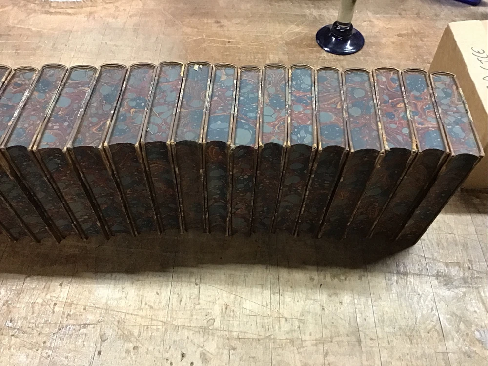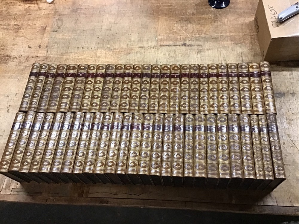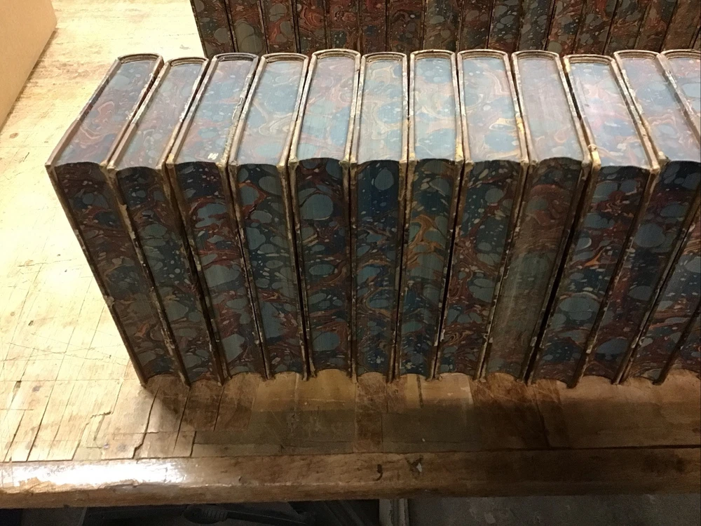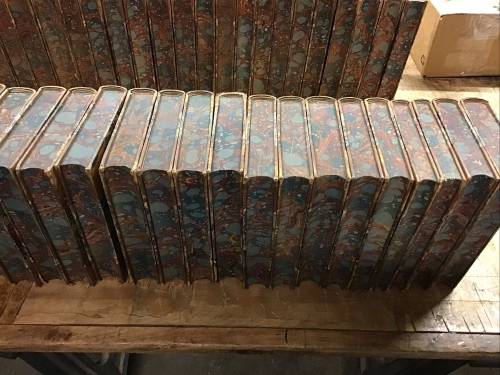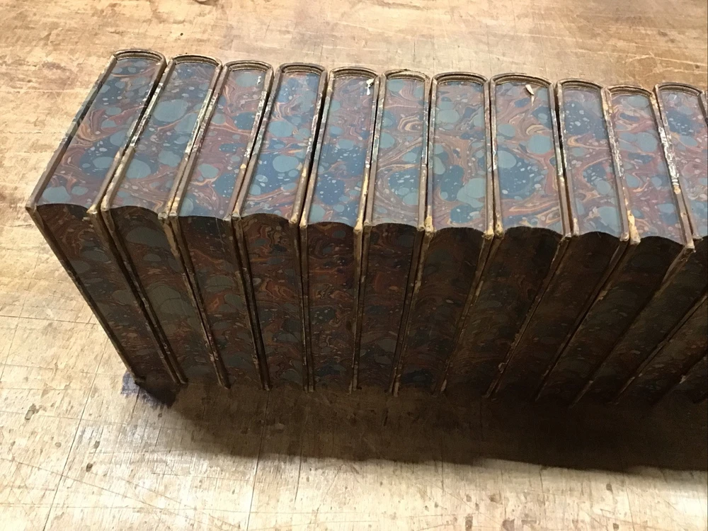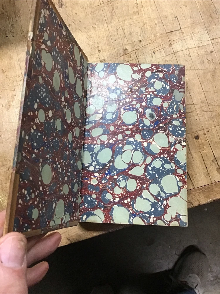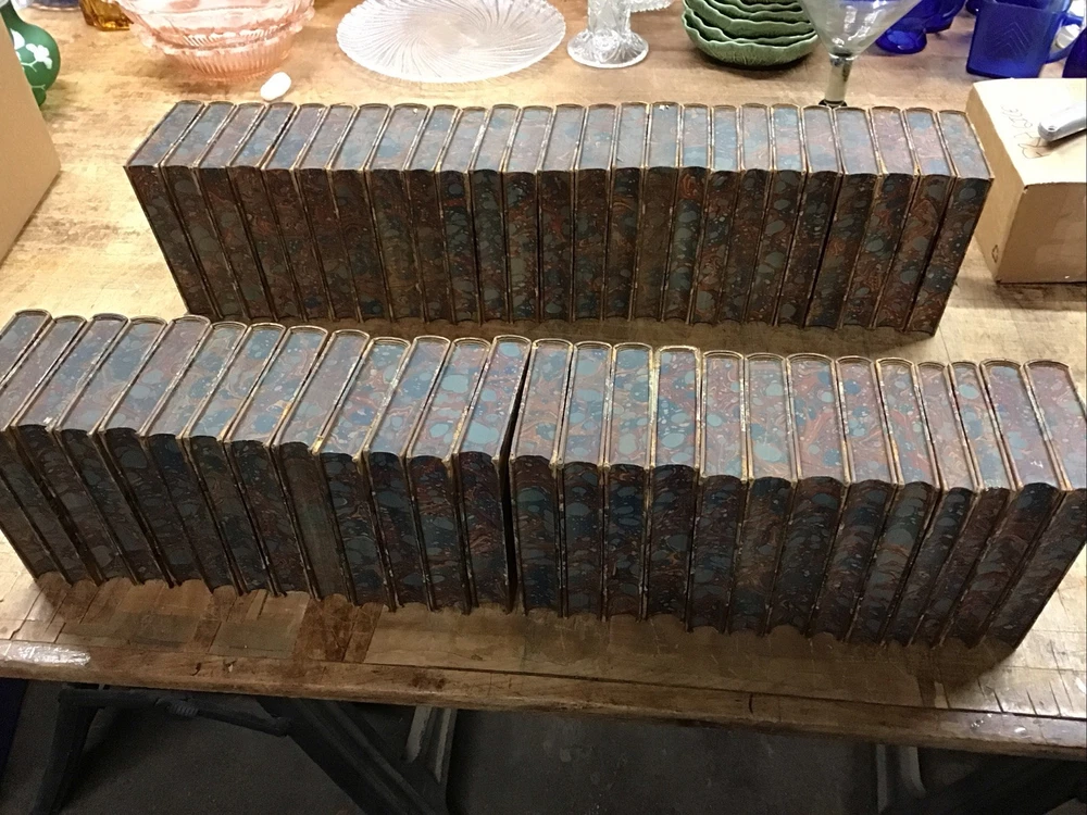 (51) 1856-64 Beautiful Leather Matched Leather Poetry Books By Little, Brown and Company, Boston, dated from 1856 to 1864. Each book penned before the title page as "Mr. & Mrs. S. W. Miles - Private Library - August 24th 1864". Titles (writers) include Lord Byron, Thomas Moore, John Skelton, Robert Burns, Thomas Hood, Robert Southey, Percy Bysshe Shelley, Matthew Prior, James Mongomery, William Wordsworth, S. T. Coleridge, William Cowper, Charles Churchill, Thomas Chatterton, Edward Young, James Thomson, Robert Herrick, John Gay and Samuel Butler. All matching with golden leather around the marbleized end bords with matching page edges. Size 4.5 x 6.7/8” They will take up approximately 56” of book shelf space. Possible information on previous owner found on internet Submitted by Kerry Patrick The late Stephen W. Miles, who died in the year 1872, is deserving of a place among the list of biographies included in this work, no less for his qualities as a prominent business man and an exemplary member of the community, as for his connection with some of the old families of the American Bottom. By his mother he was connected with the Shook family - one of the earliest to settle in Moredock precinct, and his father whose name was also Stephen W. Miles, was a resident of Monroe county as early as the year 1819. The Miles family is probably of Welsh descent. Its first members emigrated to America at a period previous to the Revolutionary war. Some of them took part in that conflict and did their share toward securing the independence of the colonies. Thomas Miles was the grandfather, and married Sarah Fish. Stephen W. Miles, the father was a son by this marriage. He was born at Cazenovia, Madison county, New York, on the thirtieth of November, 1795. He emigrated to Illinois, and settled at Eagle Cliffs in the year 1819. He was at this time a young man of twenty-four. He married Lucretia Shook, and spent the remainder of his life in the American Bottom, where he died. In the year 1858 he built a tomb as a burial place for himself, family and descendants, "to whose use," according to the inscription, "it is freely dedicated under the care of the oldest male heir of his family in succession, in trust for the above purpose." Here rest the remains of the deceased members of the family. The spot is the site of an old burying ground occupying the brow of the Bluff just south of where the Duck Hollow road leads out into the Bottom, overlooking for miles the fertile valley below. The Shook family is of Virginian descent, and was prominent in the settling of the Bottom, where Lucretia Shook, the wife of Stephen W. Miles, sen., was born and raised. Stephen W. Miles, jun., the subject of this biography, was born in the year 1828, in the month of June. Two sisters and a half-brother were other members of the family. The schools in the neighborhood of where he was born gave him advantages for securing his early education. He was under the instruction of a good teacher, and his natural aptitude for learning was so great and he was so industrious in his habits that he made rapid progress. His attainments were far better than ordinary. Through his life he kept up a taste for reading, and acquired thorough scholarship and extended literary culture. He was raised on a farm, and in his youthful years he was employed in agricultural labor, and indeed, though he followed other occupations, he kept up this pursuit through life. In January, of the year 1853, when in the twenty-fifth year of his age, he married Mary E. Tyrrell, then a resident of Monroe county. Mrs. Miles was born in Hancock county, Illinois. Her father was a native of Ohio, and her mother of Pennsylvania. After the occurrence of this event, Mr. Miles went into partnership with his father in the merchandising business, at which he had been previously employed. After a residence in the County of about seven years from the date of this marriage, he removed with his family to St. Louis on account of the great prevalence of sickness in the vicinity of where he lived. While a resident of St. Louis, he carried on business operations in that city, though at the same time his business interests were still largely in the American Bottom. See our other beautiful books Keep in mind the shipping price also covers handling fees, packaging materials & time, not just postage. See our eBay store for thousands of our other items. B16
