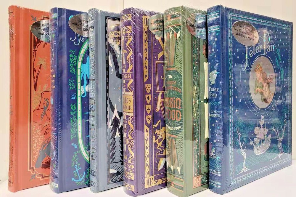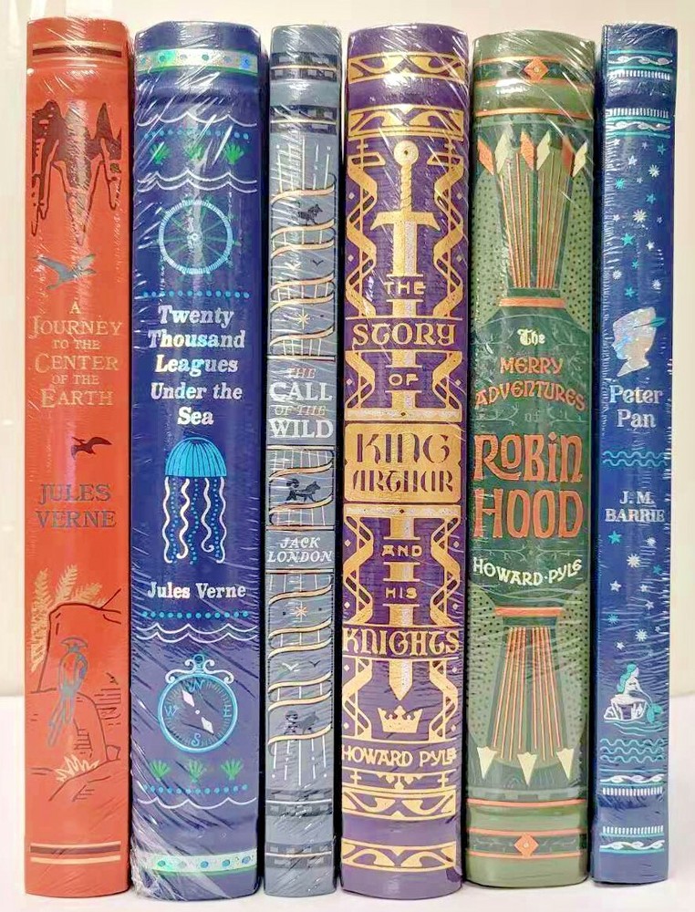 Set of 6 beautiful Bonded Leather classics: Peter Pan by J.M. Barrie The Call of the Wild by Jack London Twenty Thousand Leagues Under the Sea by Jules Verne A Journey to the Center of the Earth by Jules Verne The Merry Adventures of Robin Hood by Howard Pyle The Story of King Arthur and his Knights by Howard Pyle Brand New in their original shrinkwrap. Gift giving condition.