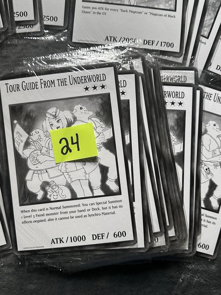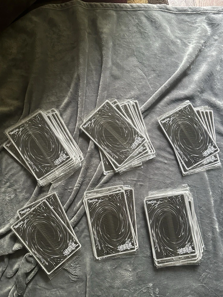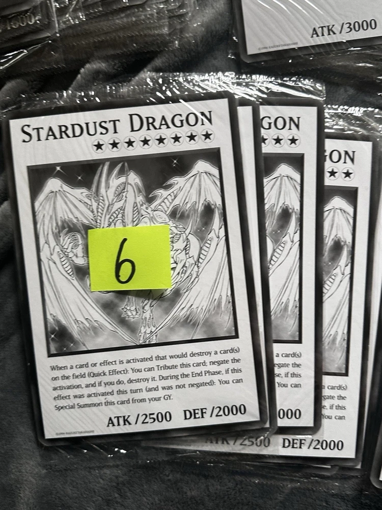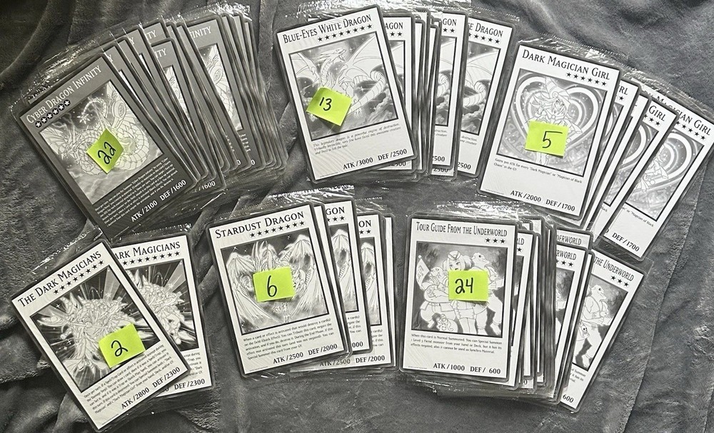 The plastic might not be perfect on all cards please do keep this in mind. 22x Cyber Dragon Infinity 13x Blue Eyes White Dragon 5x Dark Magician Girl 2x The Dark Magicians 6x Stardust Dragon 24x Tour Guide From The Underworld