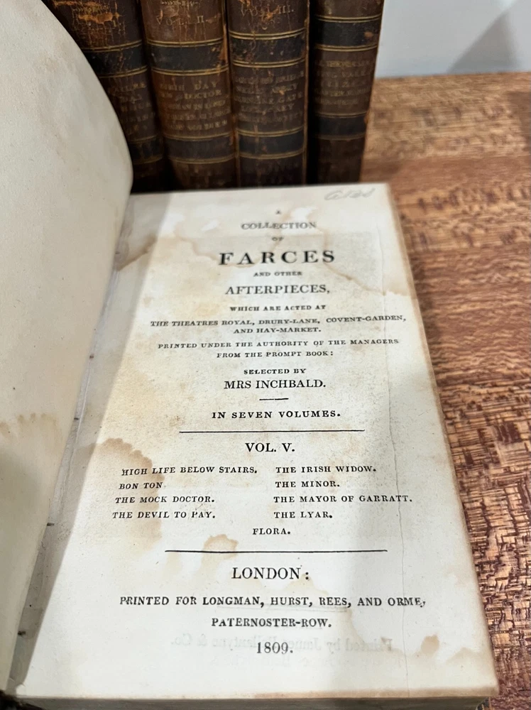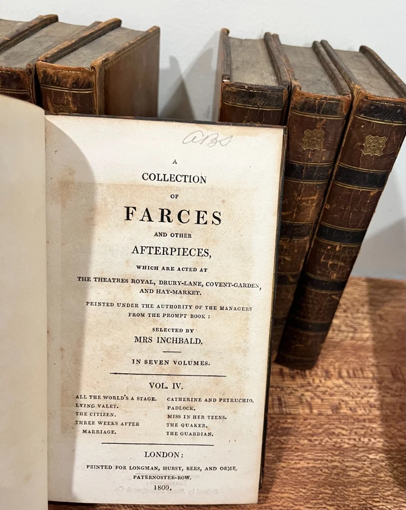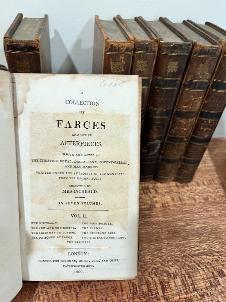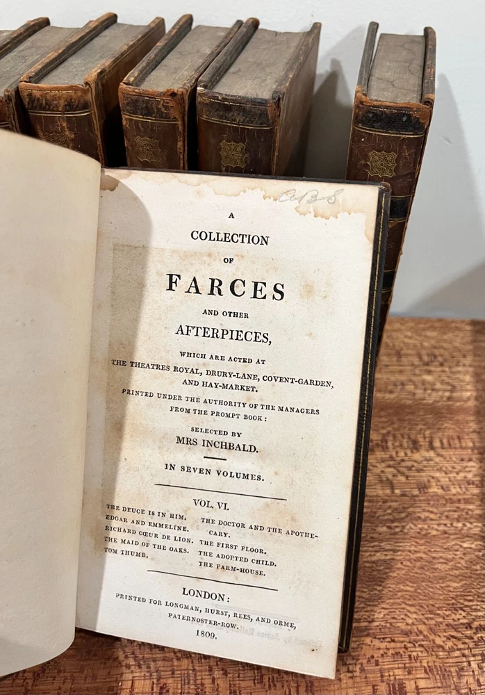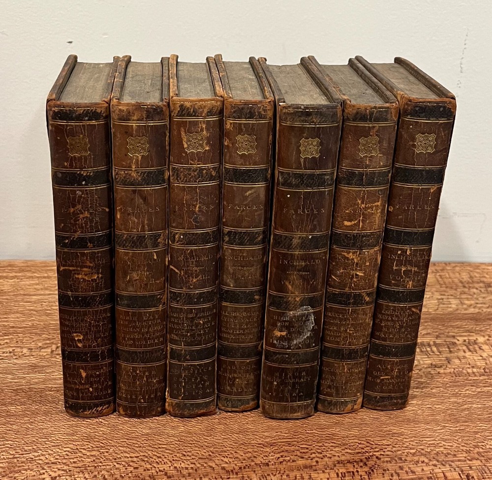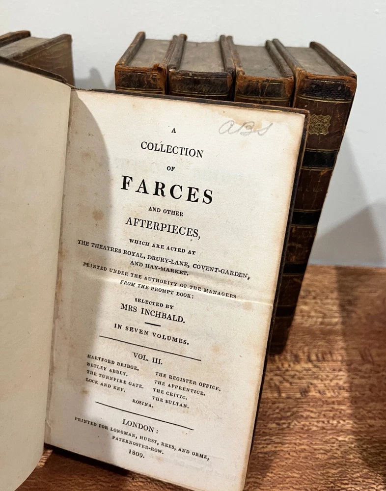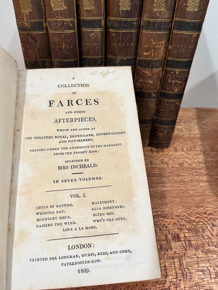 Title: A Collection of Farces and other Afterpieces Publisher: Longman, Hurst, Rees and Orme, London Publication Date: 1809 Binding: Leather Illustrator: None Condition: Very Good Edition: First edition. Book Type: book Description (from AbeBooks): A complete seven volume set of A Collection of Farces and other Afterpieces, which are acted at Theatres Royal, Drury Lane, Covent-Garden and Hay-Market.Each volume contains plays which are comic farces using buffoonery and horseplay typically including crude characterization and improbable situations. Some of the plays that appear across these volumes include Child of Nature, a Drama, The Birth Day, The Critic, Lying Valet, Bon Ton, The First Floor and Midas. Condition: Faded, leather is cracking, paper is very worn (consistent with age)