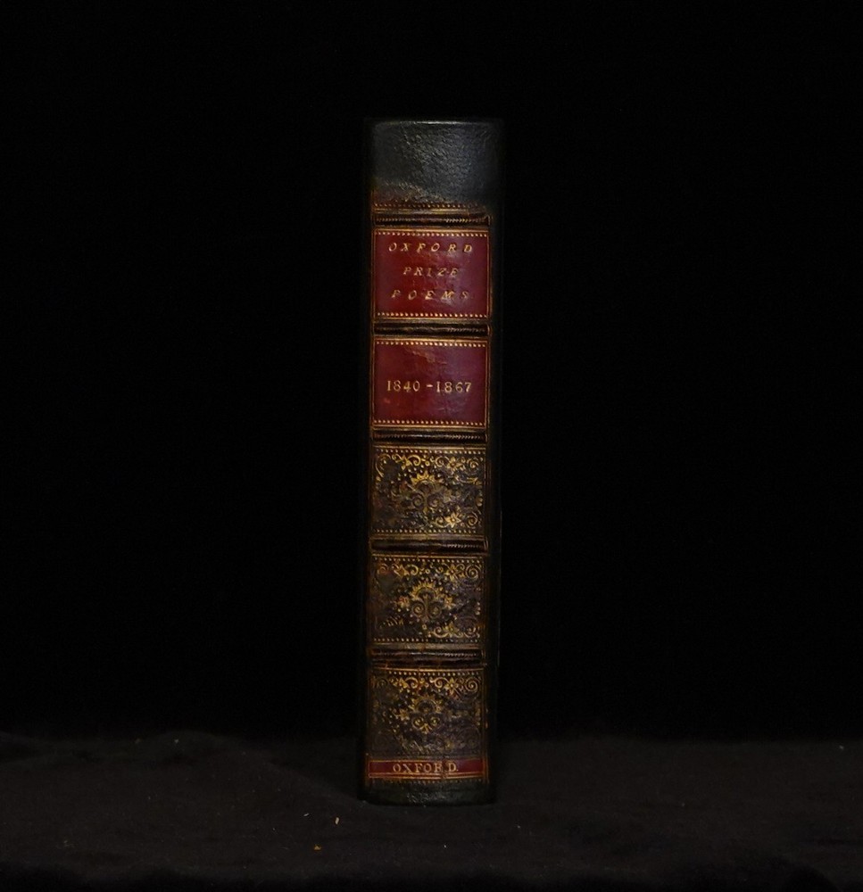 A Collection of 26 Oxford Prize Poems by Oxford: T. and G. Shrimpton / Francis MacPheson, 1867. 8vo . Hardcover. A collection of twenty-six prize poems issued for the years 1840-1867. Mostly first editions except for a handful of the early poems. Bound in a full leather period binding. In Very Good condition 85650 P34 Shipping: All of our books are carefully wrapped, packaged and promptly shipped. We ship via media mail unless otherwise requested. Overseas shipments will be sent by Priority Mail International. Please contact us before bidding for cost. Combined shipping is always used for multiple purchases. Payment: We accept Paypal, Visa, Master Card, American Express, and checks. Payment must be received within seven days of the close of auction. Returns: All books are returnable within thirty days of receipt. Our express goal is your satisfaction. About Us: Rain Dog Books, located in Bloomington, Il., has been in the rare book trade since 1989. We carry a select inventory of rare, scholarly, and collectible books, ephemera, prints and artwork. Our specialties include fine bindings, the fine arts, press books, literature, history, and travel. We also stock an extensive inventory of decorative leather and clothbound sets. Please check out our website for a complete listing of our inventory. We are always interested in purchasing libraries or individual books of interest. Please call or email us if you are interested in selling your collection. Richard Vokoun Rain Dog Books P.O. Box 3003 Bloomington, Il. 61702