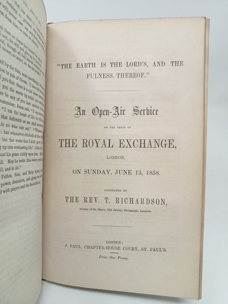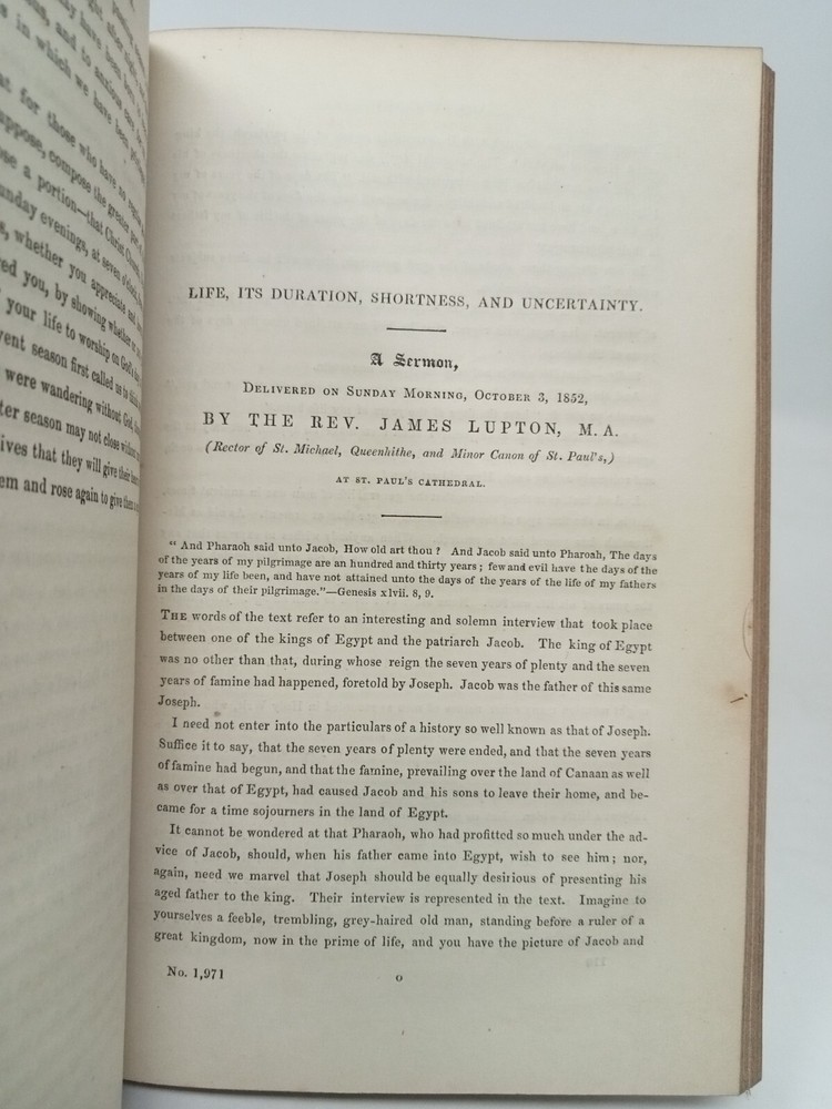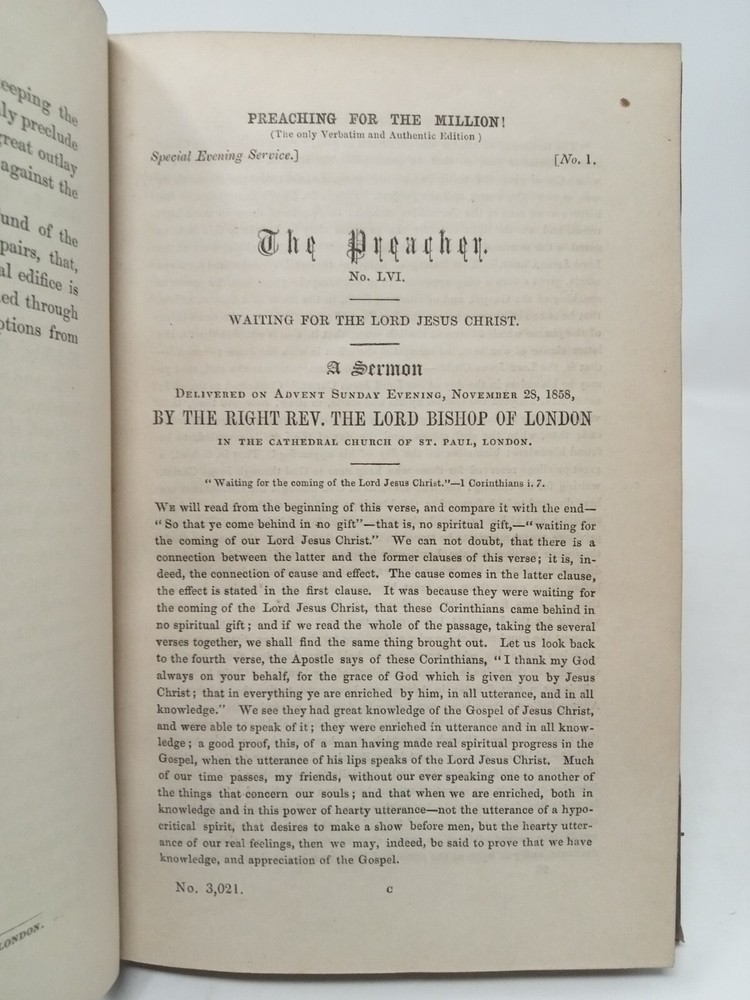 37 sermons bound in one. Octavo. Approx. 400 pages. Contemporary half leather over marbled boards with gilt spine titles. Slight rubbing to covers, otherwise very good indeed. Sermons collected from various sources, many numbers from The Preacher, many delivered at St. Paul's, London. C218427