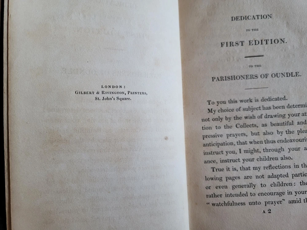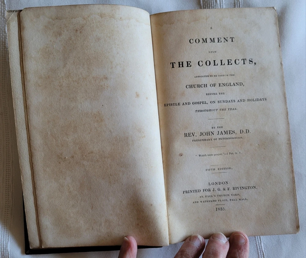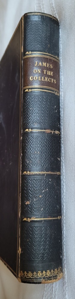 A Comment upon the Collects: Apppointed to be Used in the Church of England Before the Epistle and Gospel, on Sundays and Holidays Throughout the Year by the Rev. John James, D.D., Prebendary of Peterborough - 1835 (5th Edition). This leather bound book is in good condition for its age and measures approximately 7 1/4" x 4 1/2" x 1 3/8". The edges and corners are worn but the gilt decorations are most undamaged. Both covers are securely attached. The pages are tightly bound. The first few pages and the inside front cover show signs of water damage at the top (which doesn't interfere with readability). Every effort has been made to accurately document the condition of this item, so please examine the photos closely before purchasing. Carefully packaged and shipped to you in a box via USPS Priority Mail. FAST SHIPPING!!! jcourt2508