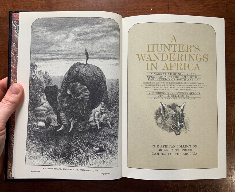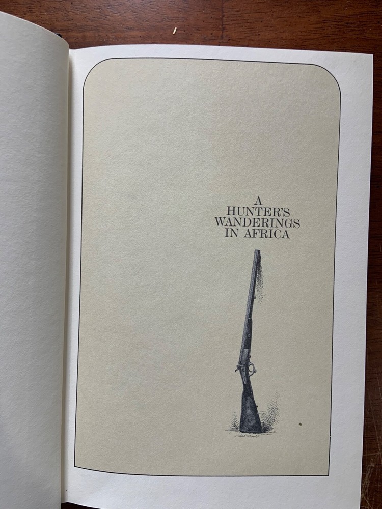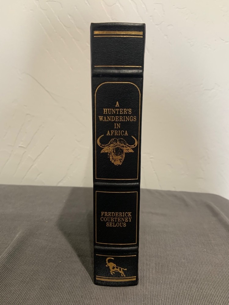 'A Hunter's Wanderings in Africa' by F.C. Selous. Leather-bound, gold-leaf edition, published as part of the 1986 African Collection by Briar Patch Press. Novel originally published in 1881....
