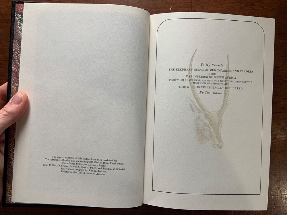 'A Hunter's Wanderings in Africa' by F.C. Selous. Leather-bound, gold-leaf edition, published as part of the 1986 African Collection by Briar Patch Press. Novel originally published in 1881.