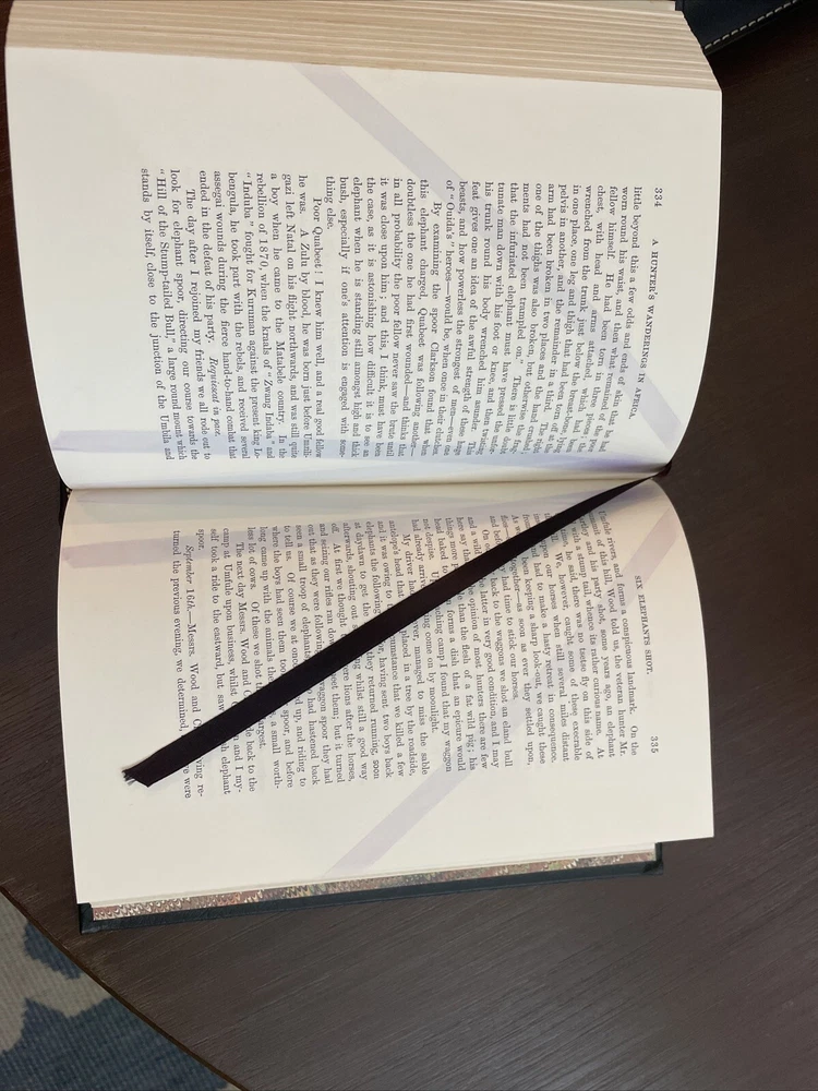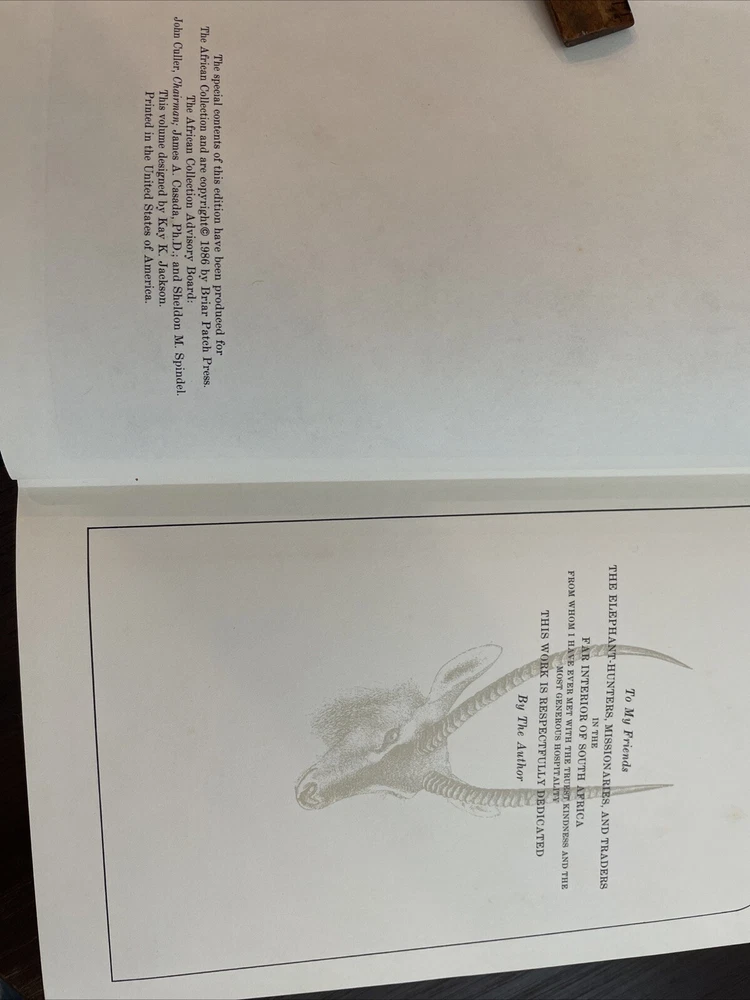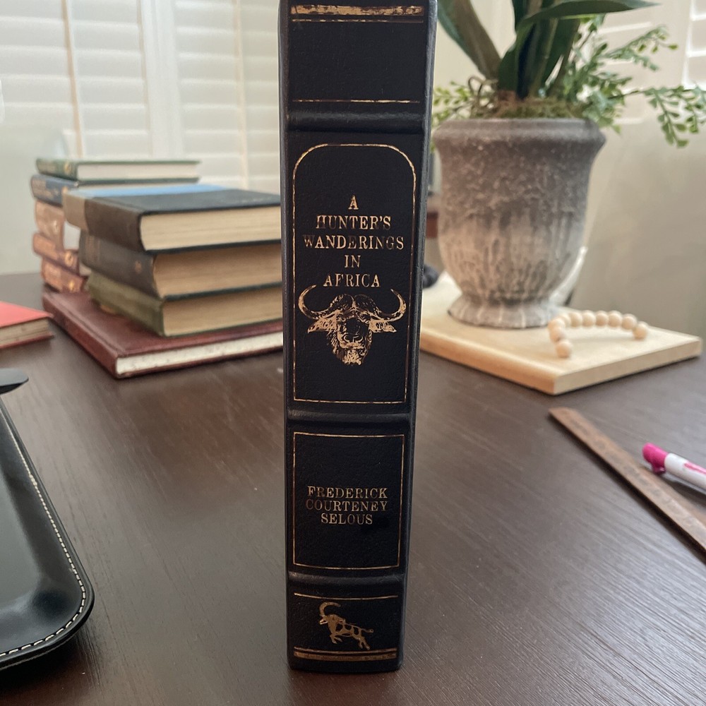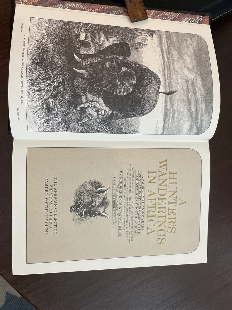 Explore the adventurous African wilderness through the pages of A Hunter's Wanderings in Africa by F.C. Selous. This remarkable nonfiction narrative takes you on a journey through Selous' experiences with African wildlife during the late 1800s. The luxury edition hardcover is a part of The African Collection published by Briar Patch Press in 1986.This leather-bound book is a collectible that is perfect for adults who enjoy history and naturalism. Its features and format make it a unique addition to any avid reader's collection. The book is written in English and is not inscribed. Get your hands on this amazing piece of literature that showcases the author's passion for the African wilderness. This volume is in very good condition. The bookmark has left discoloring on 5 pages as shown in pics.