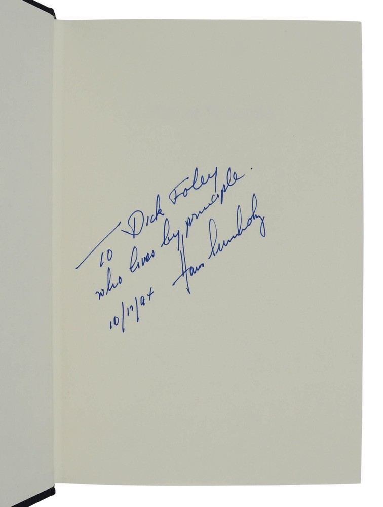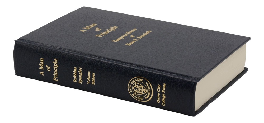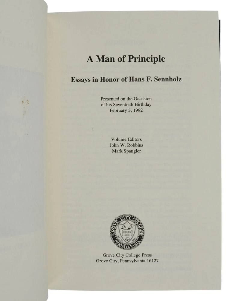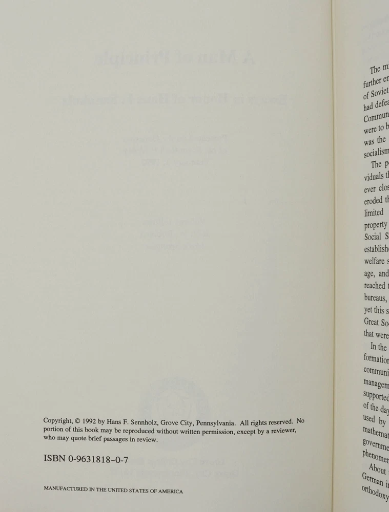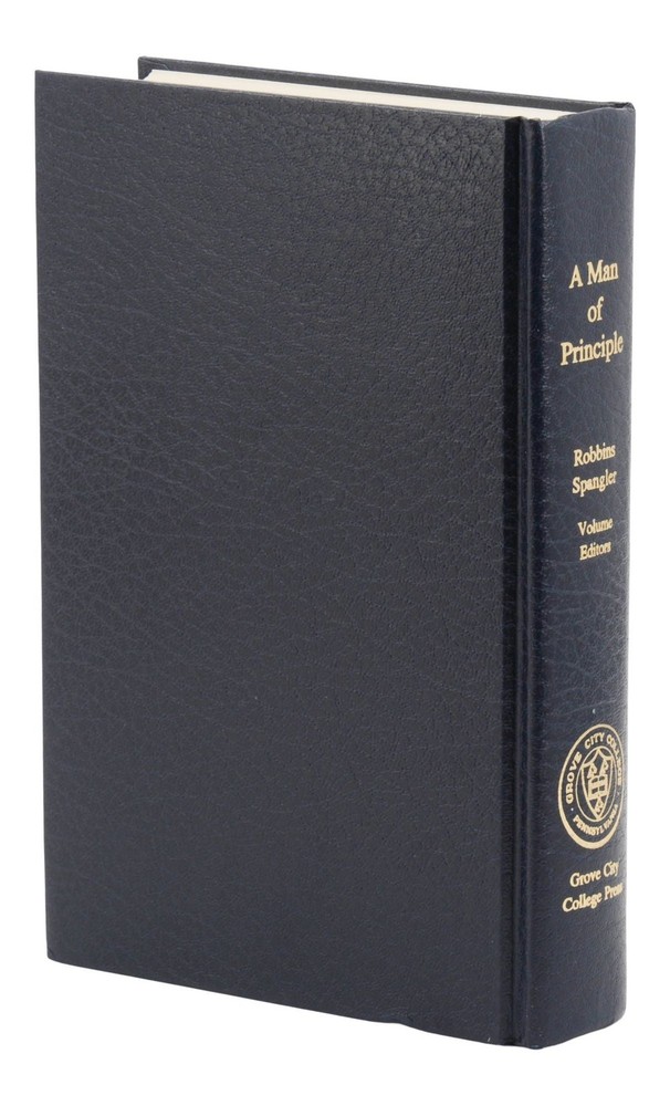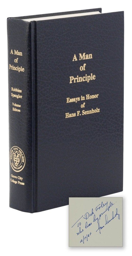 A Man of Principle: Essays in Honor of Hans F. Sennholz edited by John W. Robbins and Mark Spangler First edition inscribed by Hans F. Sennholz to a contributing author Grove City, PA: Grove City College Press, 1992. First and only edition. Association copy signed by Hans F. Sennholz on the front free endpaper and warmly inscribed to Ridgeway "Dick" Foley, who contributed the essay "The Anonymous Life" to this work. xvi, [2], 571 pp. Bound in publisher's navy blue bonded leather lettered in gilt. Near Fine with pinhole to spine leather, slight dent to lower edge of rear board, and light soiling to blank page facing title. An anthology of essays by admirers of Hans F. Sennholz, an Austrian School economist whose first extended stay in the United States was spent in a prisoner of war camp in Arkansas. After taking his degrees back in Germany, the former Luftwaffe pilot returned to study at New York University. He became Ludwig von Mises' first PhD student in the United States and served as president of the Foundation for Economic Freedom after a long career in academia. Sennholz was an influence on former Congressman Ron Paul, who regarded him as a personal friend.