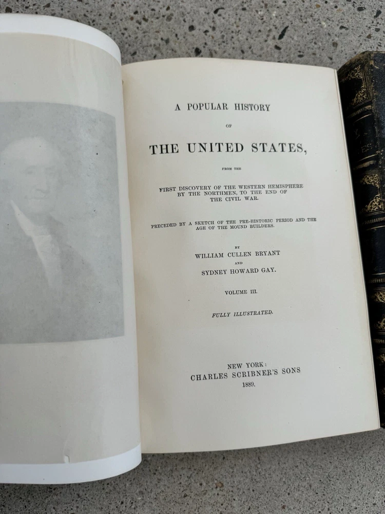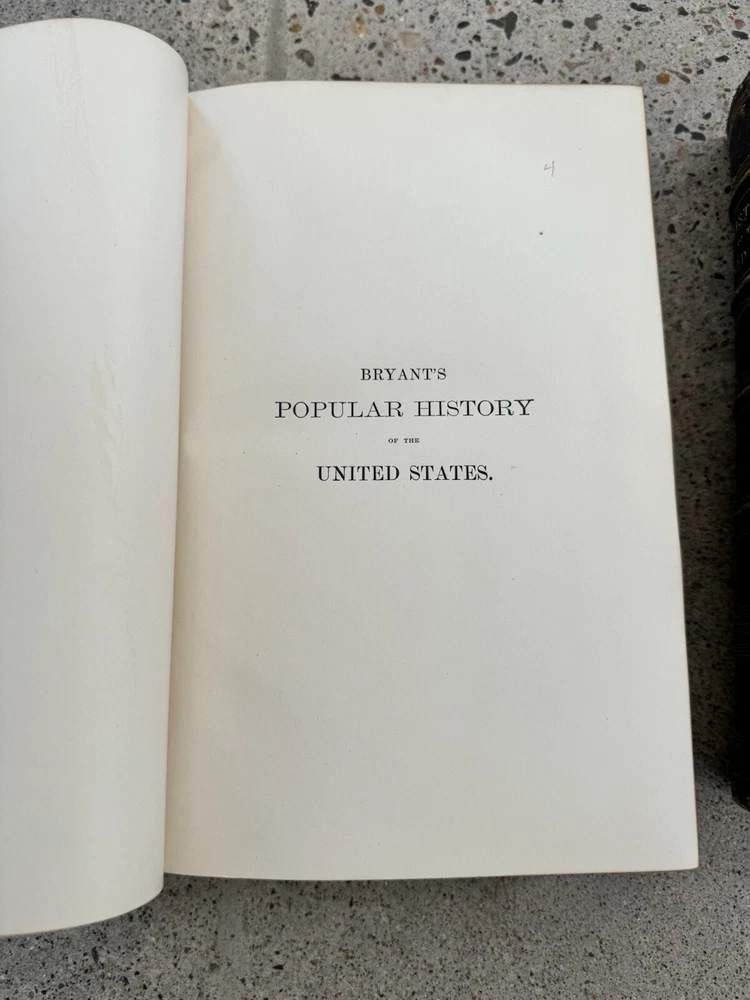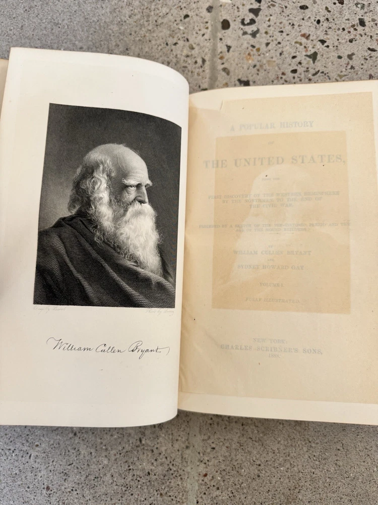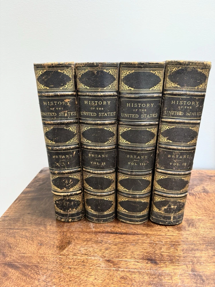 Offered here is a handsome and substantial 4-volume set of A Popular History of the United States by William Cullen Bryant and Sydney Howard Gay, published in 1888. Bound in richly decorated leather with gilt tooling and all edges gilt (3-sided gold gilding), this set presents a distinguished shelf appearance. Lavishly illustrated throughout with portraits, engravings, and historical scenes, these volumes capture the sweep of early American history in a highly visual and accessible way. Bryant, one of America’s foremost 19th-century poets, partnered with journalist Sydney Howard Gay to create a work that was both literary and scholarly, appealing to a wide audience of readers in the post-Civil War era. Condition: Well cared for set, showing expected age wear to bindings but still sound and attractive. Gilt edges remain bright, illustrations crisp, interiors clean overall. Please see images for the actual books you will receive; additional photographs are available upon request. Author: William Cullen Bryant, Sydney Howard Gay Publisher/Date: 1888 Binding: Leather with gilt decoration, all edges gilt Format: 4 Volumes, Illustrated Subject: American History, 19th Century Americana