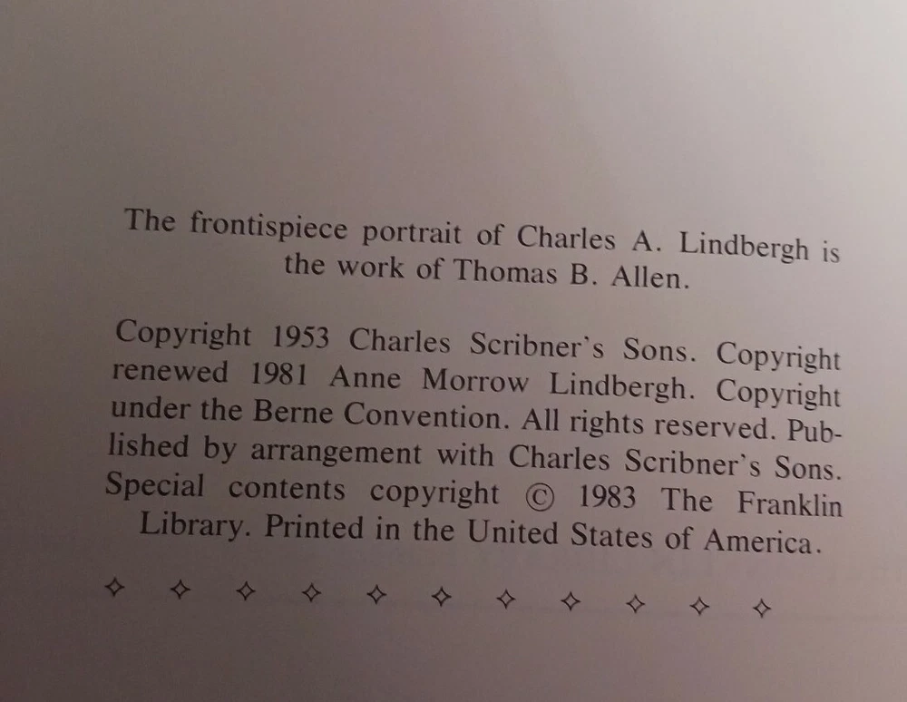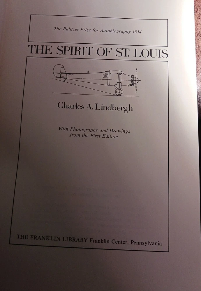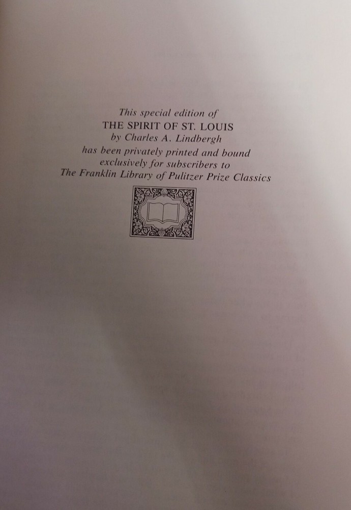 A Spirit Of St. Louis Charles Lindbergh Lb The Franklin Library is in VG condition. This beautiful, heirloom quality, special edition of the Spirit of St Louis was privately printed and Bound for subscribers to the Franklin library of Pulitzer Prize classics. Like the other books in The Collection the book is bound in genuine leather, or animated in 22 karat gold, features satin ribbon page markers, high-quality acid neutral paper and some pages for strength and durability.