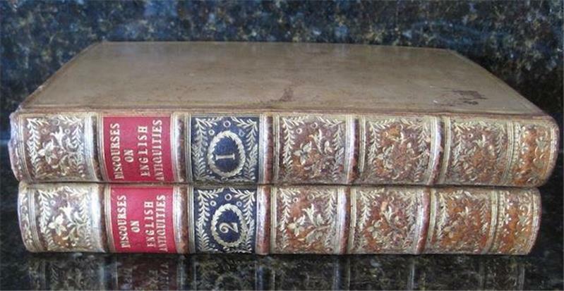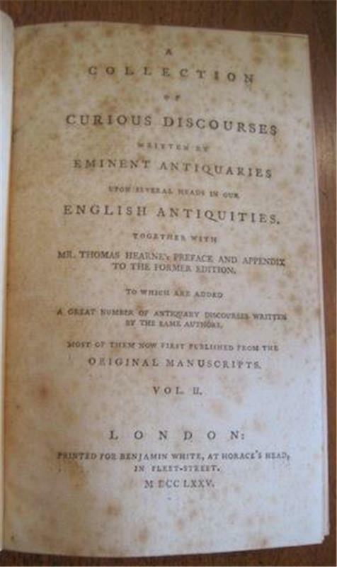 Hill Country Books presents ... A collection of curious discourses written by eminent antiquaries upon several heads in our English antiquities 2 Volumes Author: Thomas Hearne Publisher: Benjamin White at Horace's Head Release Date: 1775-01-01 Seller Category: Ancient Studies~History Qty Available: 1 Condition: Collectible: Very Good Sku: c15-1-45 Notes: 2 volumes 8 vo, full tan morocco leather, wide gilt border on covers, Gilt paneled spines in 7 compartments, leaf wreath design with floral centers. Red leather under title on spine and dark brown leather under volume numbers. Covers have rubbing with light wear to gilt. Corners bumped, hinge cracked in Vol 1, foxing on beginning and ending pages in both volumes. Toe of volume I is chipped and has stain on cover. Volume II cover has a light crazing in the leather but is smooth to touch. Discourses of the first Society of Antiquaries (formed during the late sixteenth century), over sixty discourses and other scholarly works collected, including several on the law and, in particular, on the Inns of Court and Chancery. Volume I has steel cut engraving, foldout of King Edward the Confessor's Chapel at Islip. Mr. Thomas Hearne's preface and appendix to the former edition. Don't forget to check out other great deals in our eBay Store!! Track Page Views With Auctiva's FREE Counter