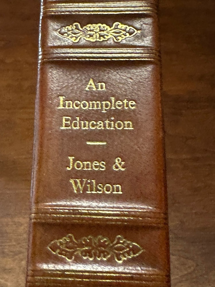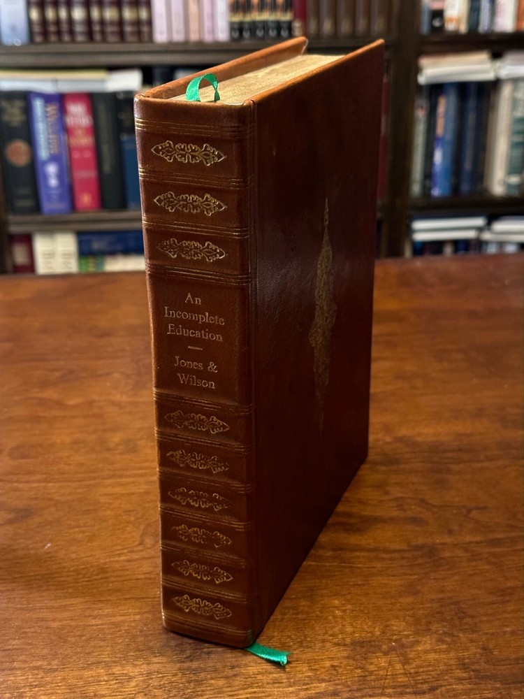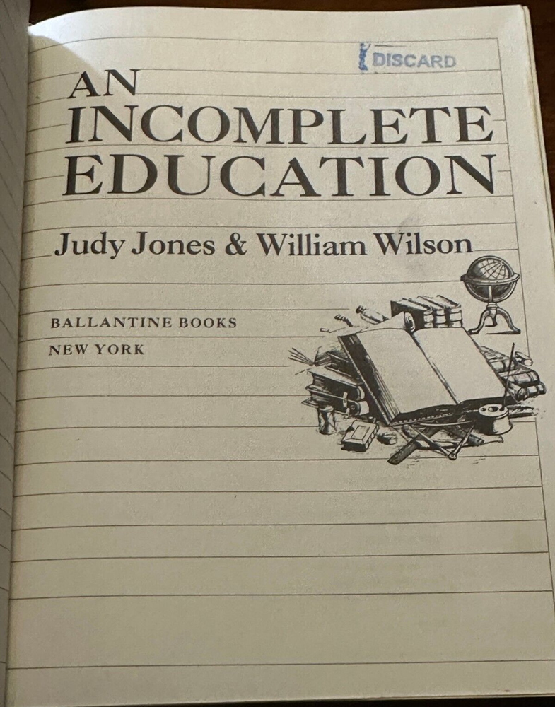 AN INCOMPLETE EDUCATION by: Judy Jones & William Wilson VERY GOOD CONDITION - HARDCOVER - GENUINE LEATHER BOUND - ILLUSTRATED - GILDED PAGES Item Pictured is the One You WILL Receive! No Markings or folds on pages (except library markings) About the Book: Title: An Incomplete Education Author: Judy Jones & William Wilson Publisher: Ballantine Books Special At tributes : Genuine Leather Bound - Illustrated - Gilded Page Edges Format: Hardcover - No Dust Jacket - GENUINE LEATHER BOUND Copyright: 1987 Pages: 656 ISBN: 0-345-29570-6 Dimensions: 7.50 x 9.50 x 1.75 inches