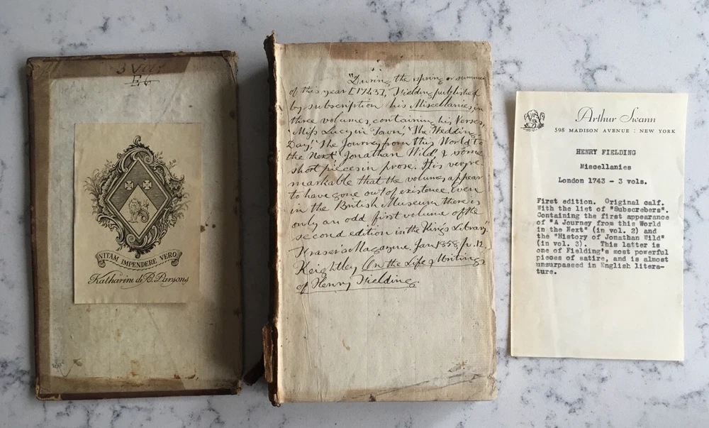 Henry Fielding, Miscellanies (A. Millar: 1743) 3 vols. 6.5/8 inches high Previously acquired from Arthur Swann, New York....