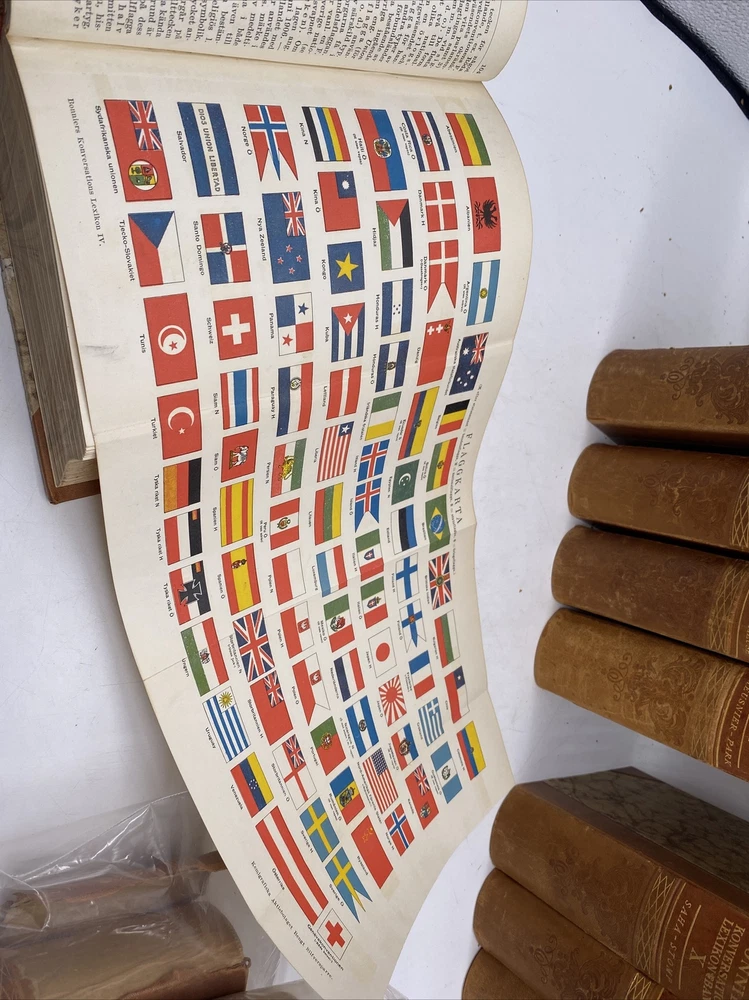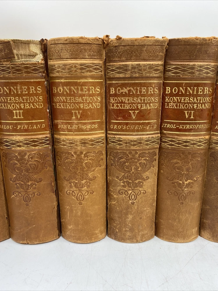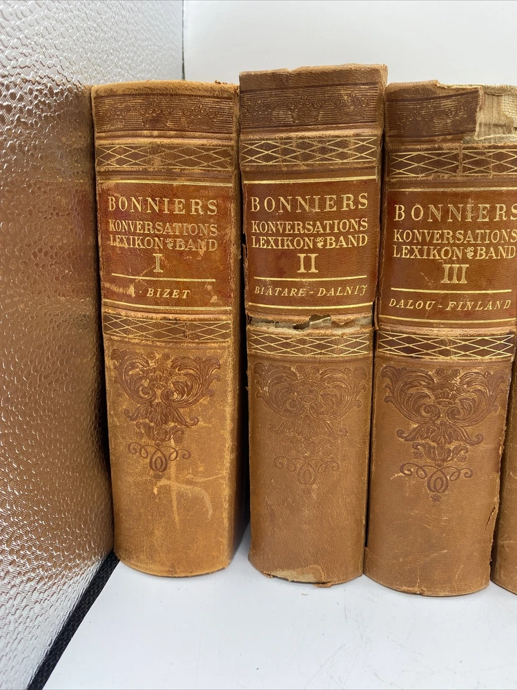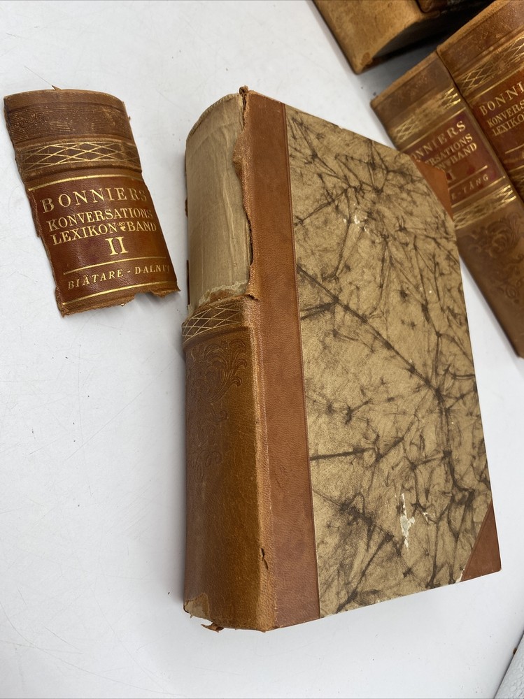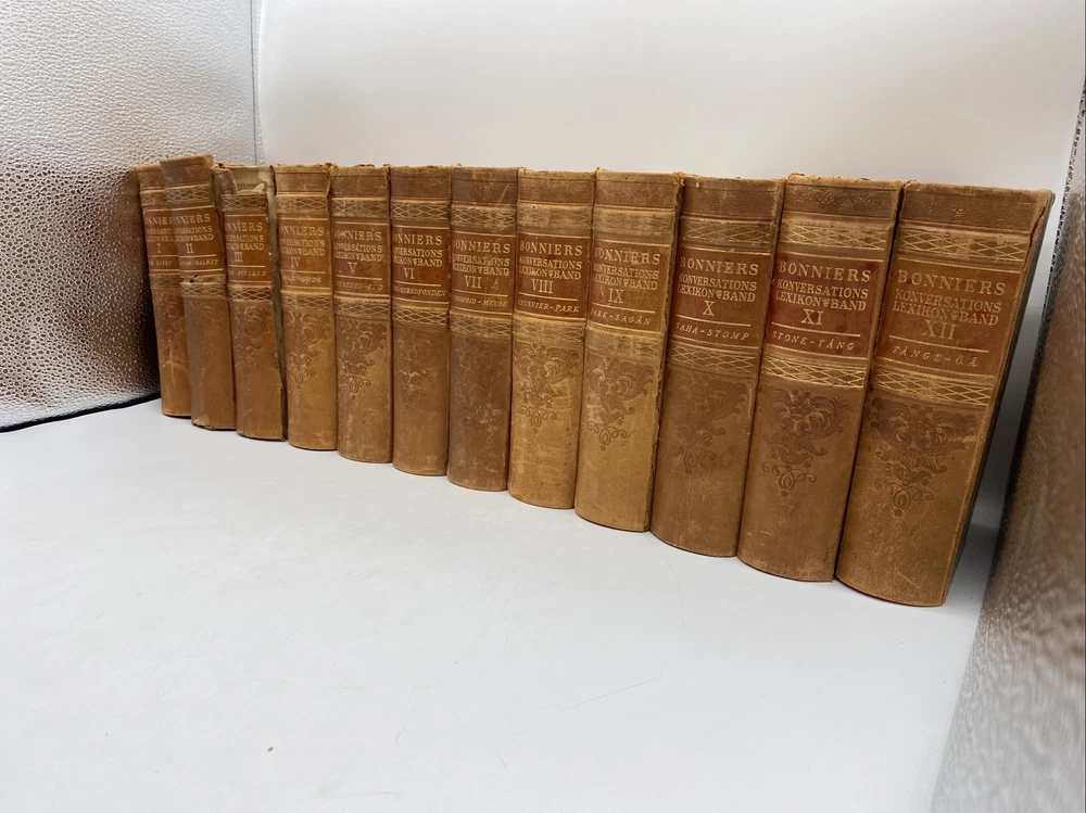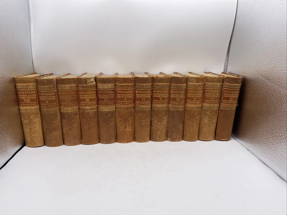 ANTIQUE BOOKS 1922-1928 LEATHER BONNIERS KONVERSATIONS LEXICON 12 VOL SET PUBLISHED IN THE SWEDISH LANGUAGE. THE SPINES AND CORNERS ARE LEATHER AND THE FRONT AND BACK COVERS ARE MARBLE BOARD. THIS IS THE TYPE OF SET OF BOOKS SAID TO BE IN THE OFFICE OF HEADMASTER ALBUS DUMBLEDORE AND WIZARD REMUS LUPIN IN HARRY POTTER AT HOGWARTS CASTLE. PLEASE FEEL FREE TO ASK ANY QUESTIONS AND WE WILL TRY TO ANSWER THEM FOR YOU. SEE OUR OTHER LISTINGS FOR ANTIQUE AND RARE BOOKS. Also, Please see all photos as they are considered part of the description. We ship to the lower 48 states of USA only. Thank you for your interest.