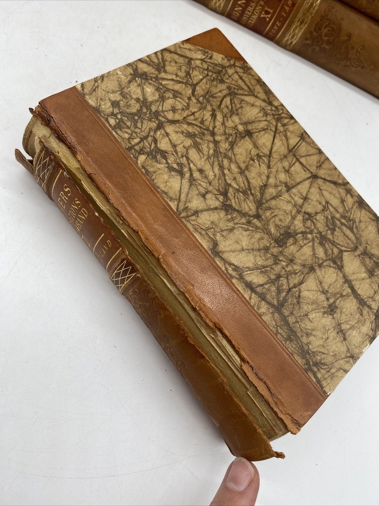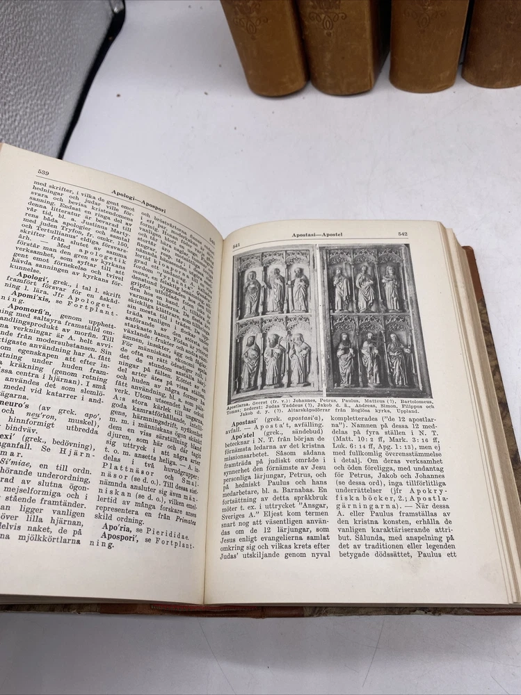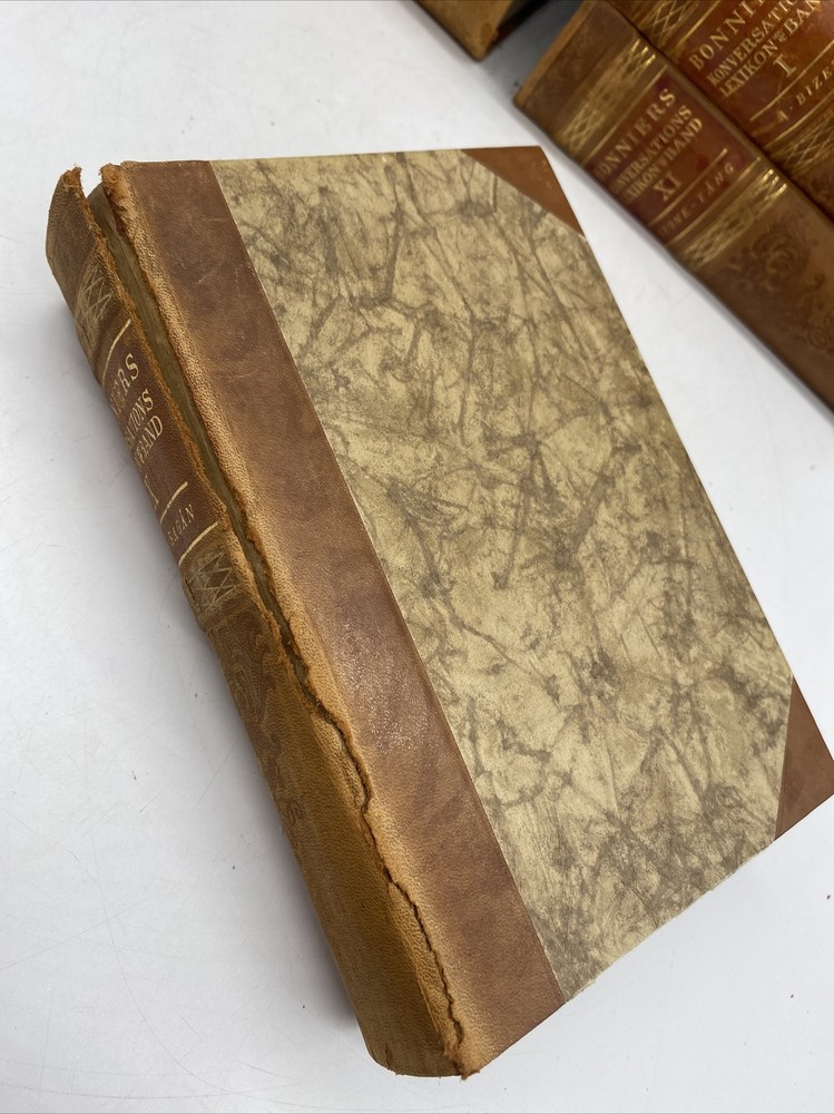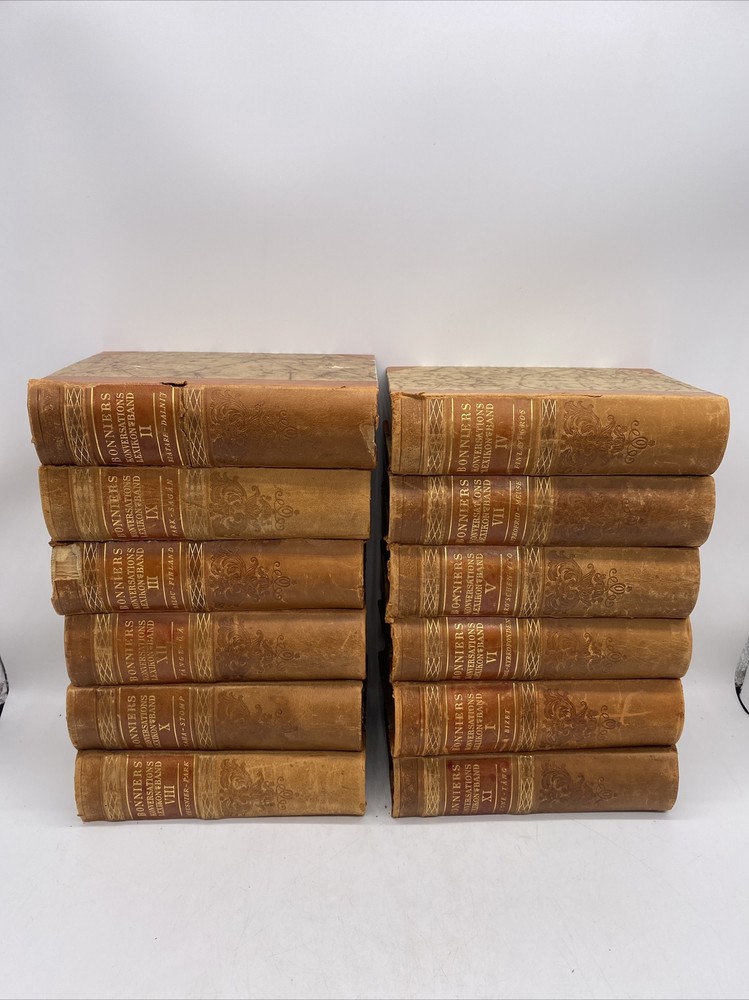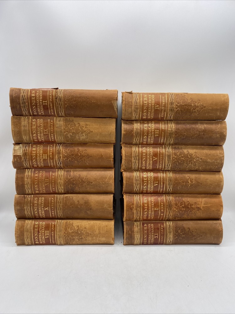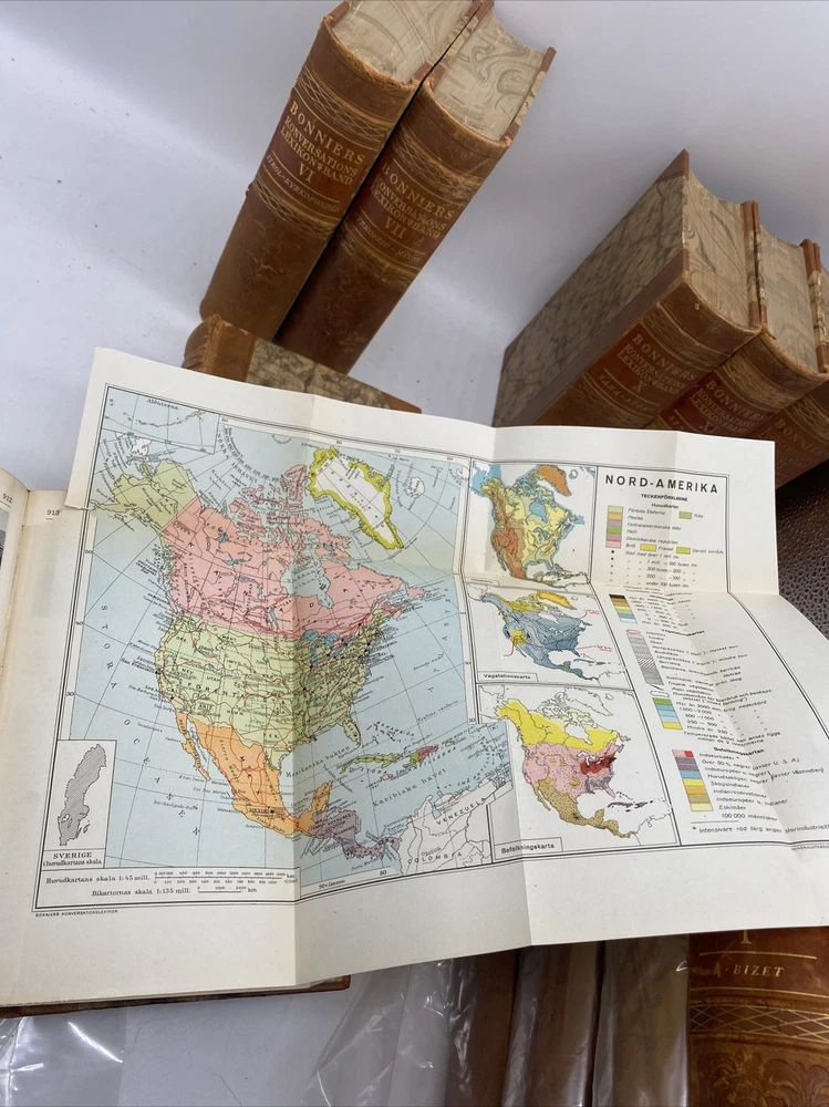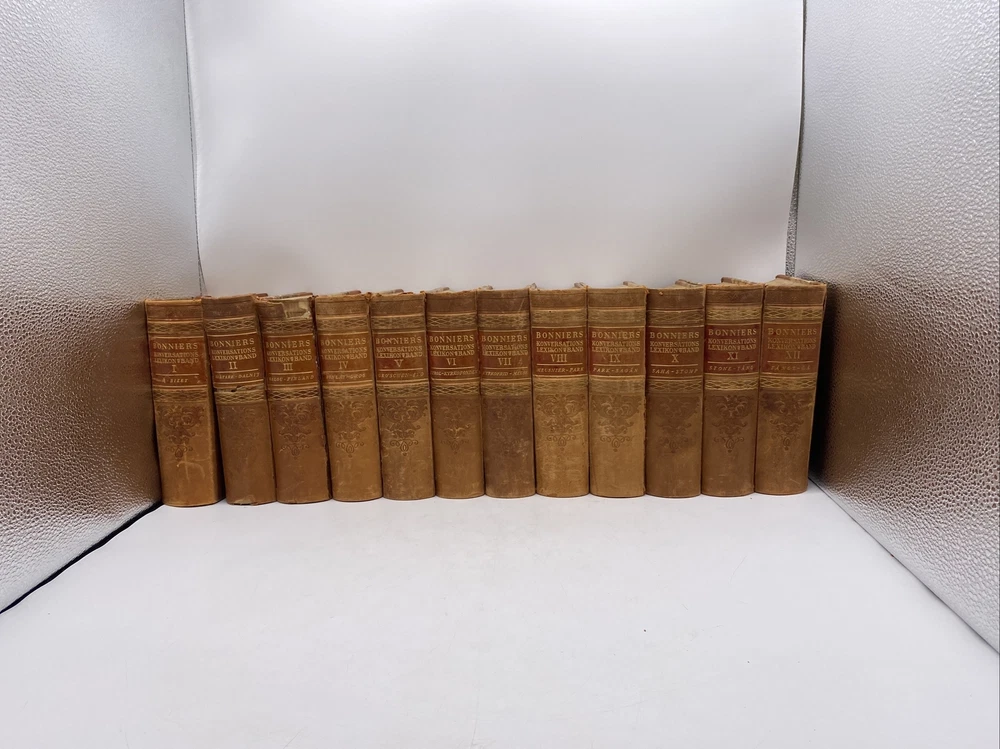 ANTIQUE BOOKS 1922-1928 LEATHER BONNIERS KONVERSATIONS LEXICON 12 VOL SET PUBLISHED IN THE SWEDISH LANGUAGE. THE SPINES AND CORNERS ARE LEATHER AND THE FRONT AND BACK COVERS ARE MARBLE BOARD. THIS IS THE TYPE OF SET OF BOOKS SAID TO BE IN THE OFFICE OF HEADMASTER ALBUS DUMBLEDORE AND WIZARD REMUS LUPIN IN HARRY POTTER AT HOGWARTS CASTLE. PLEASE FEEL FREE TO ASK ANY QUESTIONS AND WE WILL TRY TO ANSWER THEM FOR YOU. SEE OUR OTHER LISTINGS FOR ANTIQUE AND RARE BOOKS. Also, Please see all photos as they are considered part of the description. We ship to the lower 48 states of USA only. Thank you for your interest.
