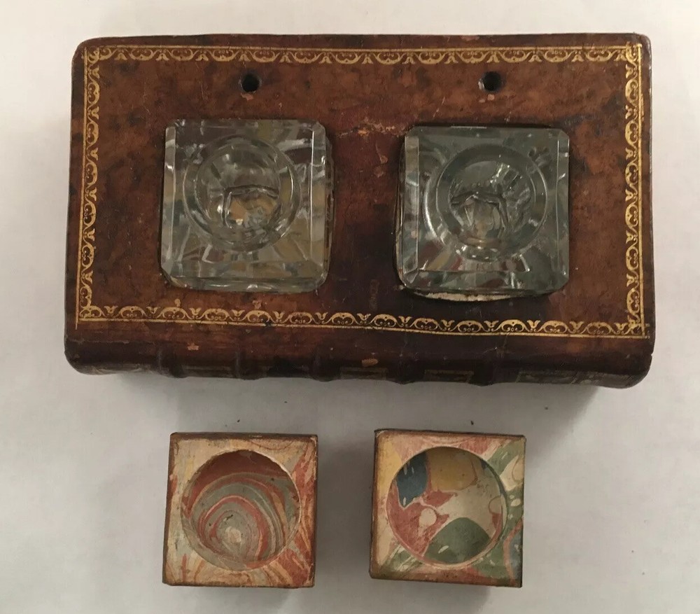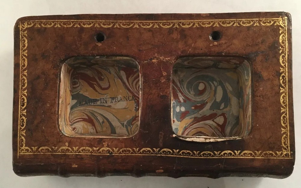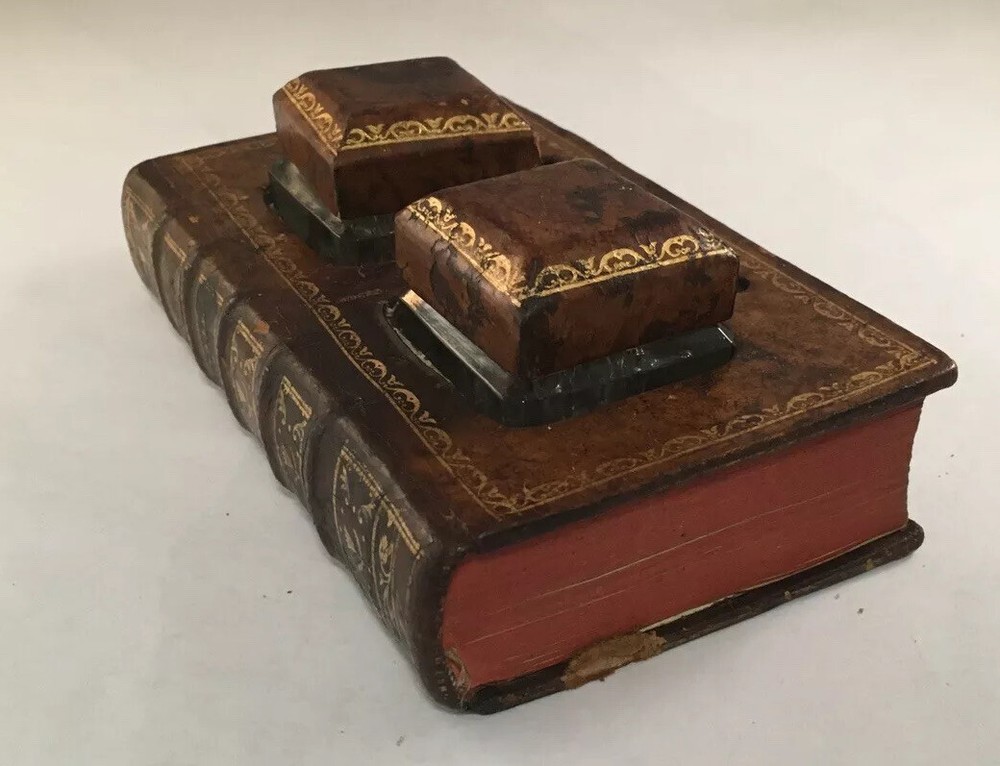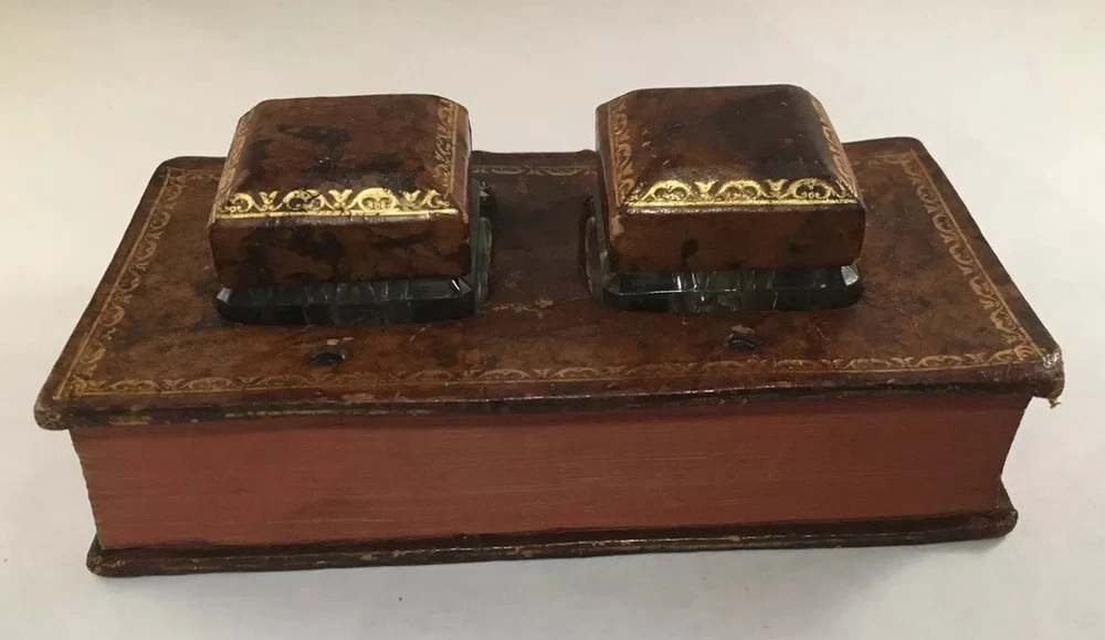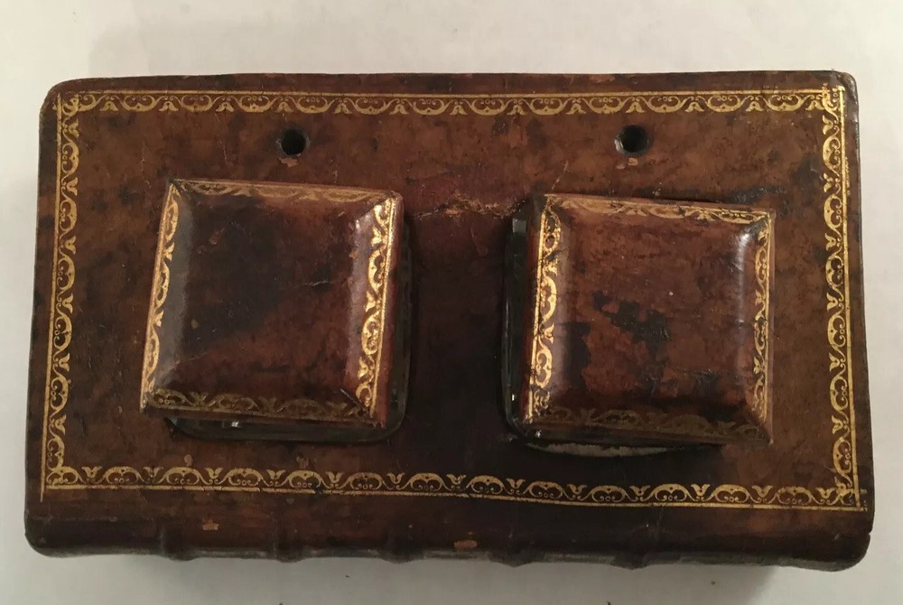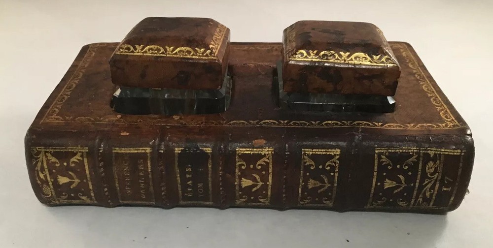A LEATHER BOUND BOOK FORM INKWELL MADE IN FRANCE FROM AN 18TH CENTURY BOOK approximately 7 inches wide...
