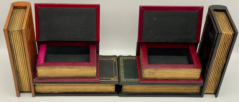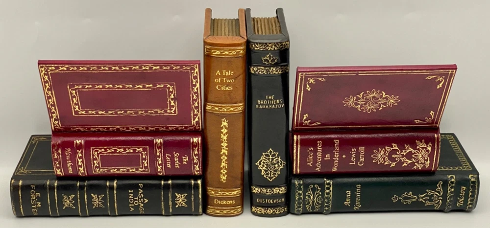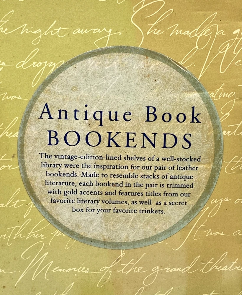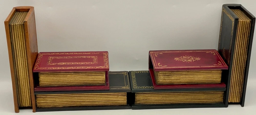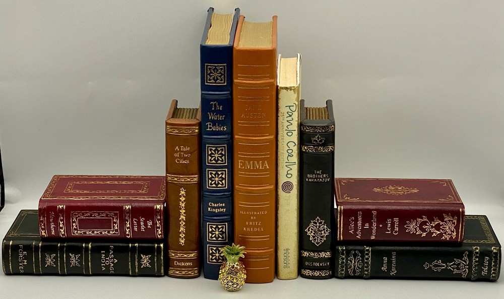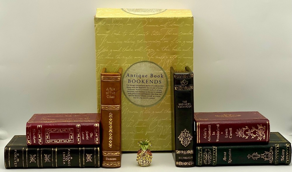 MAKES THE PERFECT GIFT FOR ANY FAN OF VINTAGE LEATHER-BOUND BOOKS like EASTON PRESS, FRANKLIN LIBRARY, ETC. / COOL & UNUSUAL BOOKENDS ** PLEASE READ : Mahalo for taking the time to look at our listing. We truly appreciate it. We always do our BEST to give you the most accurate description of these beautiful books. If, however, you have any SPECIFIC questions about the SIZE of the book, NUMBER of pages, TYPE of leather, SMELL or FEEL of the book, PLEASE email us through EBay’s mail system BEFORE you bid, and we will be HAPPY to give you more information. We want you to be completely happy with your purchase and keep you as our customers for years to come!** DESCRIPTION: Antique LEATHER book BOOKENDS. THIS IS A SCARCE VINTAGE HEIRLOOM BOOKENDS WITH LAVISH DEEP GILT STAMPINGS TO THE BOARDS AND SPINE with A SECRET TRINKET BOX ! IT IS ONE OF THE MOST HIGHLY-PRIZED & MOST BEAUTIFUL BOOKENDS YOU CAN FIND. COMES WITH ORIGINAL BOX. ALL BOOKS SHOWN IN THE PICTURES ARE FOR DEMONSTRATION PURPOSES, ONLY. THEY ARE NOT INCLUDED with BOOKENDS! 🍍 NOT INCLUDED... 😃 ABOUT THE BOOK: The vintage-edition-lined shelves of a well-stocked library were the inspiration for this pair of leather bookends. Made to resemble stacks of antique literature, each bookended in the pair is trimmed with gold accents and features titles from some favorite literary volumes, as well as a secret box on each bookend for your favorite trinkets / precious souvenirs. CONDITION: Set is in LIKE NEW condition for its age — was in box for many, many years and just removed to let them air out and for pictures. Box has only very minor wear (SEE PICS FOR BETTER DETAILS). SHIPPING: FREE TO US ADDRESSES ONLY. INTERNATIONAL $ based on location. WE SHIP PRIORITY MAIL & PACK VERY WELL. Please check out our listings of Easton Press, Franklin Library, Limited Editions Club, First Edition Library, Folio Society, International Collectors Library, and Heritage Press editions. WE DO COMBINE SHIPPING IF YOU PURCHASE MORE THAN ONE COPY. Mahalo for looking at our listings! By bidding/purchasing this item, you are helping a very grateful family who sends you our WARMEST ALOHA & MAHALO!