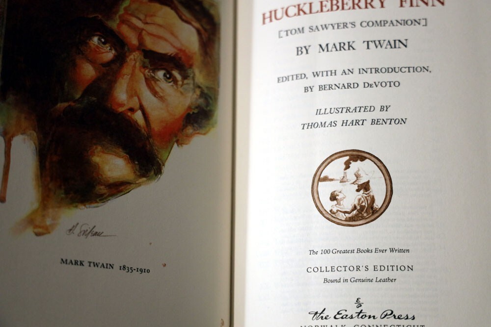 Description Adventures of HUCKLEBERRY FINN by Mark Twain. Leather-bound collectible book published by EASTON PRESS. Illustrated by Thomas Hart Benton. Collector's Edition. Copyright 1994. Light cover wear, binding secure, ownership sticker at front endpaper. Books will be packed securely for safe shipment. Books will ship via USPS Media Mail, unless otherwise requested. If you would like to upgrade to an expedited shipping method, please contact me for a quote. Please view the photos and contact me with any specific questions. ZZ1 **Please contact me with any questions prior to bidding. Check out my other listings now!** ***Please note: If you are bidding on a used or antique book... We do our best to accurately describe each book and identify any flaws it may have. If you have specific questions regarding its condition, please never hesitate to ask. Unfortunately, we cannot always inspect each page, and therefore grading is from visual inspection and browsing through the book. Unless stated otherwise, our books will contain signs of wear and age which is normal within the vintage/antiquarian category. We offer primarily used, vintage and antique books. Our books are stored in a dry, 100% smoke-free environment . We will always mention if a book has a noticeably unpleasant odor, however if you have a particularly sensitive sense of smell, we cannot recommend that you purchase any antique or vintage books. Payment Paypal Accepted. Shipping FREE USPS Media Mail shipping anywhere in the U.S. **International Buyers please contact me for a shipping quote prior to purchase.** Return Policy We consider All Sales to be Final. Returns Accepted for Full Refund of Purchase Price only if item arrives significantly not as described. Shipping & Handling costs will not be refunded under any circumstances. Please be sure that this is the item you are looking for prior to bidding. If you have any questions about the content of an item, condition of an item or a question about any of our policies please do not hesitate to ask. Feedback If you were pleased with your purchase and experience with us please leave a feedback comment.