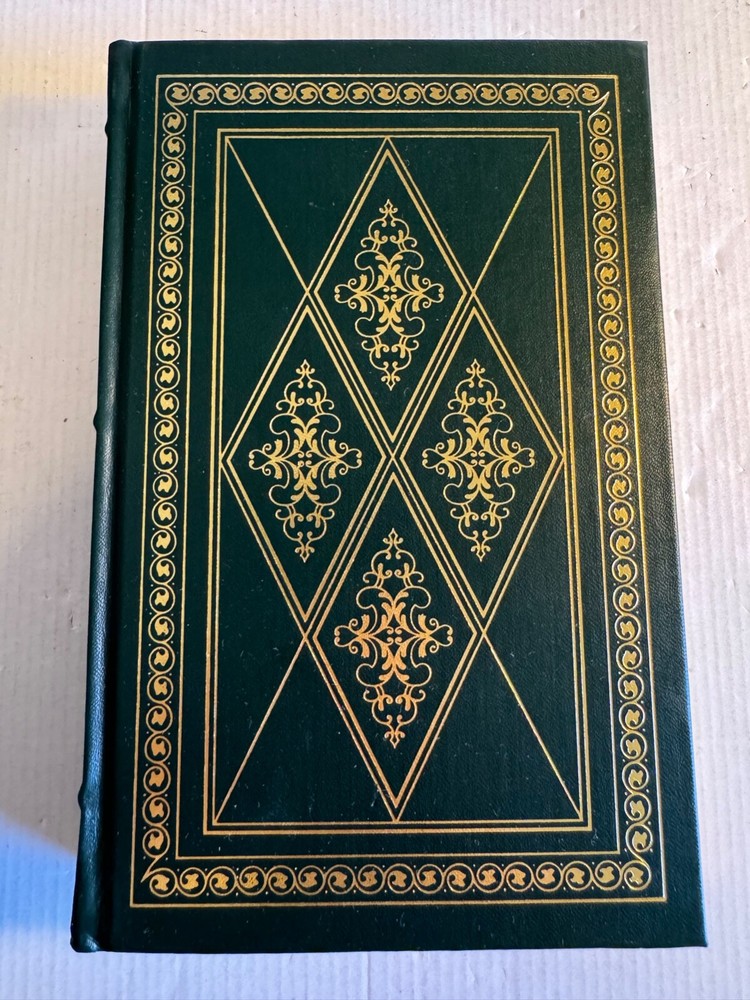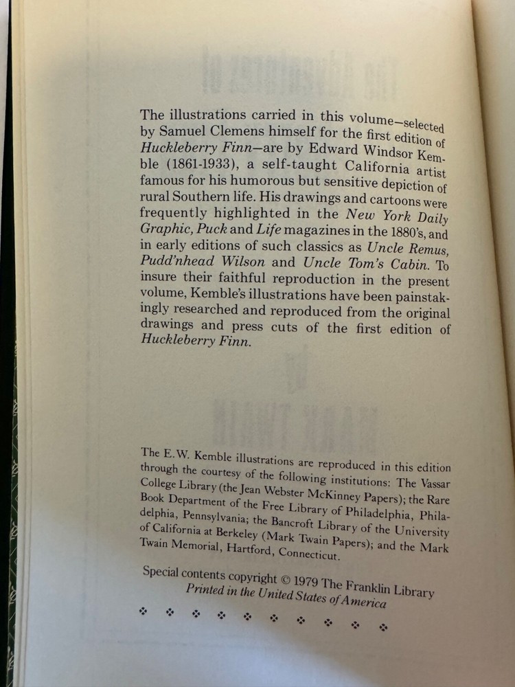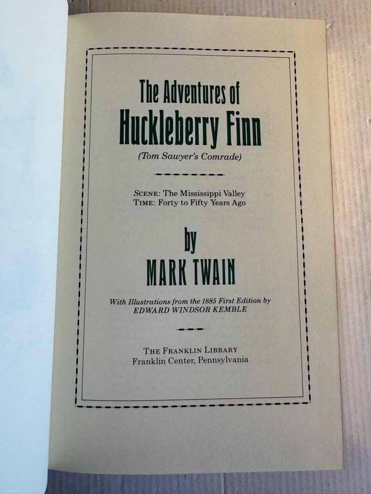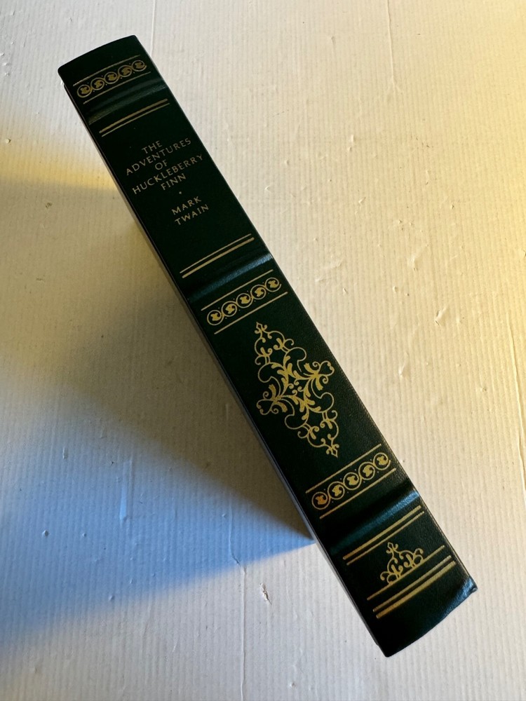 A nice vintage hardcover copy of The Adventures of Huckleberry Finn by Mark Twain (Franklin Library, 1979). This copy has leather binding and gold edges. Condition Notes: “Very Good” condition: Looks and feels unread, all pages are crisp and unmarked with no writing/highlighting/underlining, clean page blocks with faint scuffs, minimal wear to board edges/corners, glossy covers - All books ship from a nonsmoking home - The books you see are the books you will receive Shipping - Shipping will be via USPS Media Mail. I usually ship with books wrapped in bubble wrap inside padded envelopes or small boxes. - I am happy to combine shipments. Please contact me for a shipping quote if you are interested in multiple items. If you win more than one auction, please wait for a new invoice with a shipping adjustment before paying.