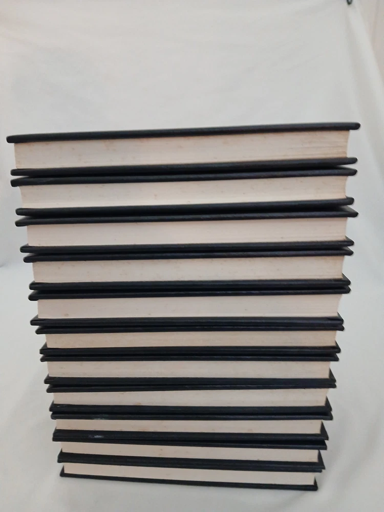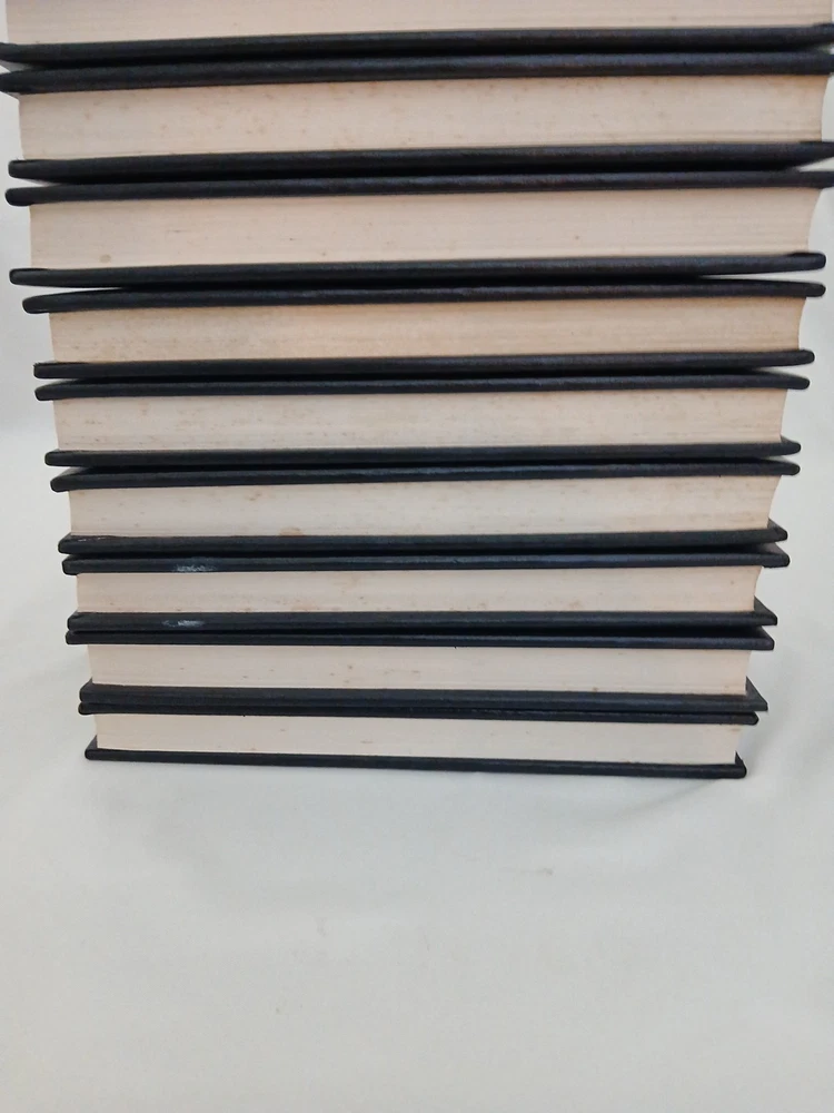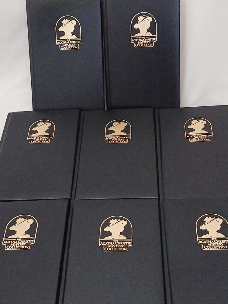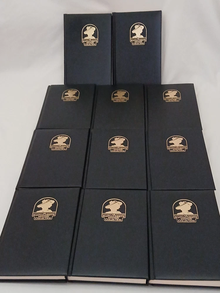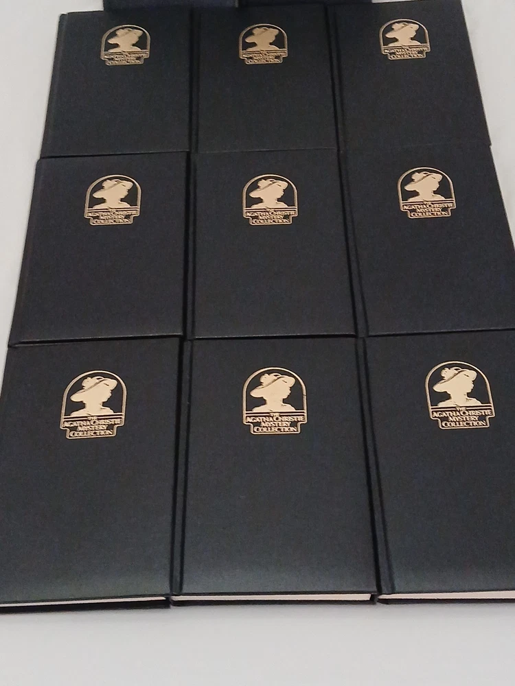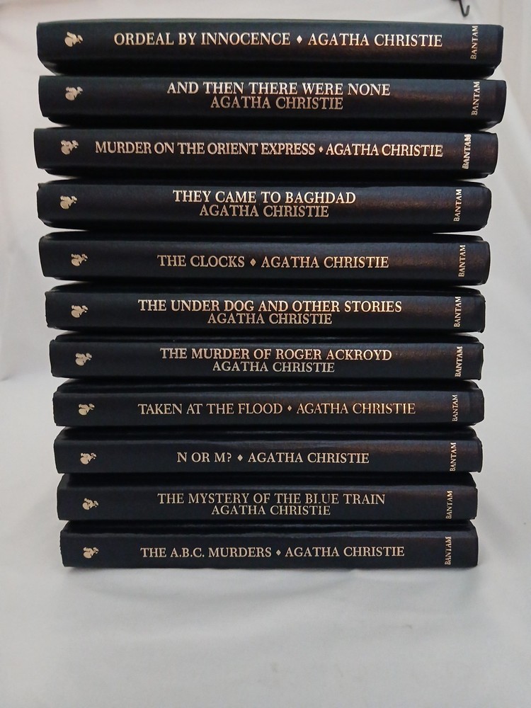 The Agatha Christie Collection Lot of 11 HC Bantam Black Leatherette. 1. Murder on the Orient Express 2. N or M? 3. The Under Dog and other stories 4. Taken at the Flood 5. The Murder of Roger Ackroyd 6. The Clocks 7. They Came to Baghdad 8. The A.B.C. Murders 9. Ordeal By Innocence 10. And Then There Were None 11. The Mystery of the Blue Train The faux leather is in very good condition and the books don't seem to have been read much if at all. They do have some spots/stains on ends/edges of paper so please view the pictures.