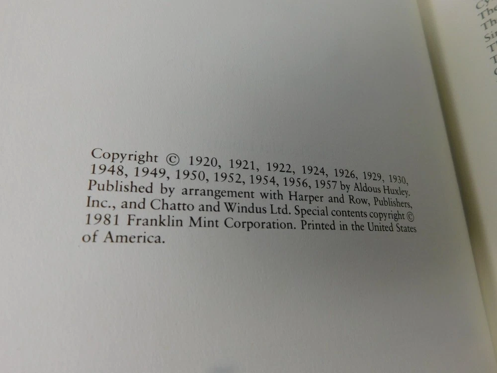 For sale is the leather cover book Aldous Huxley Collected Short Stories. Part of The Franklin Library Limited series. Used and has a scuff to upper corner but in overall good condition. Please look over pictures for condition details. FREE shipping via USPS with tracking. The item pictured is the exact item I am selling and that will be shipped to winner. AzulyOro56
