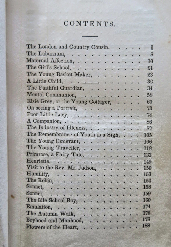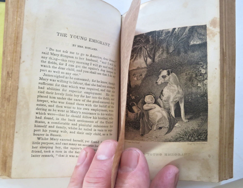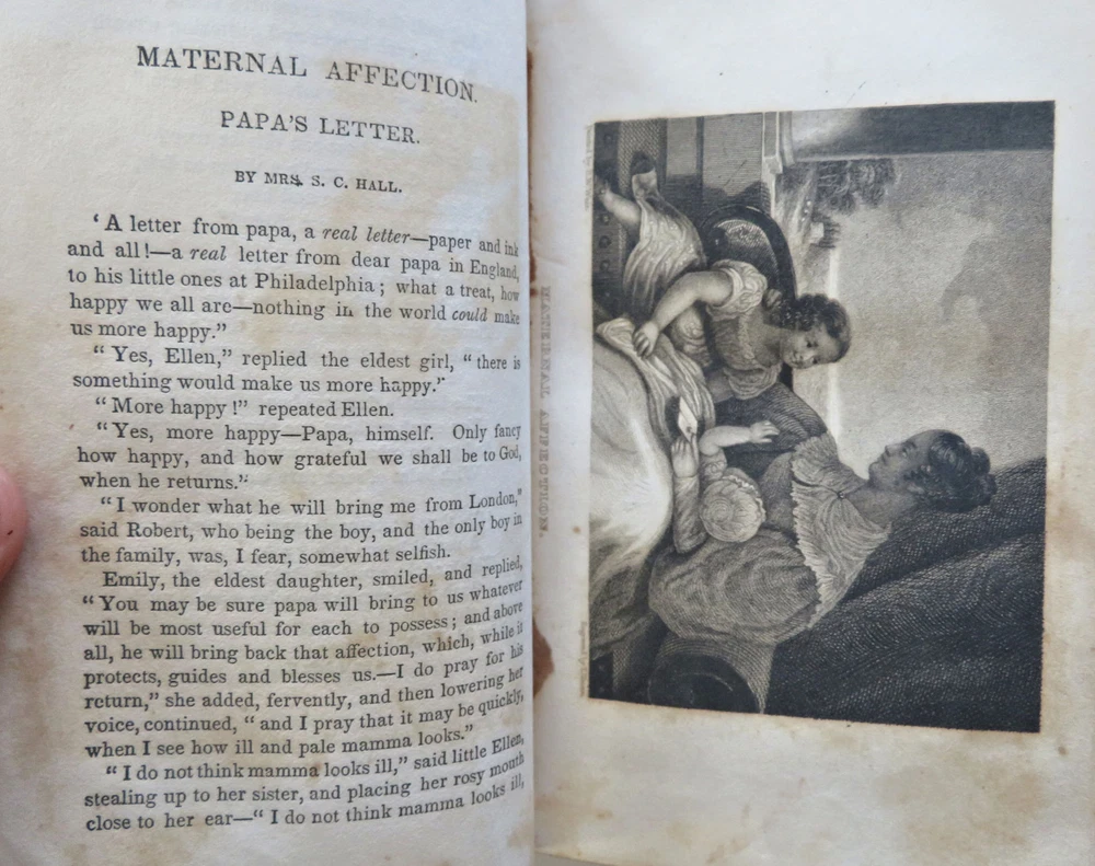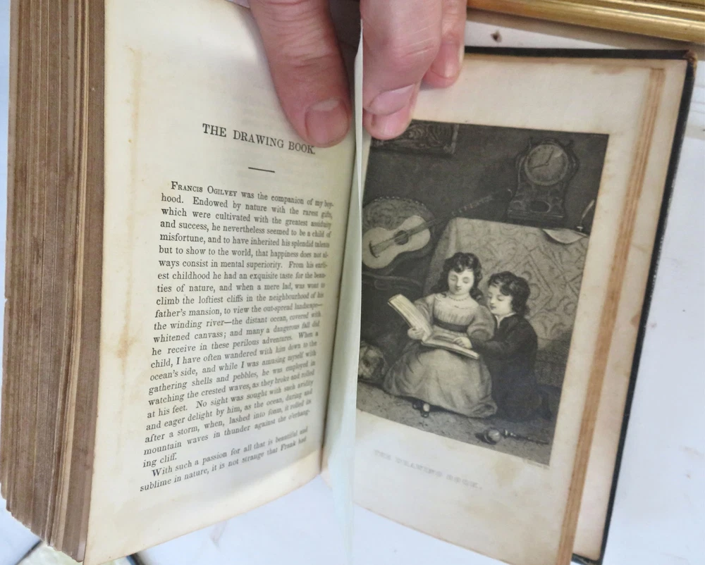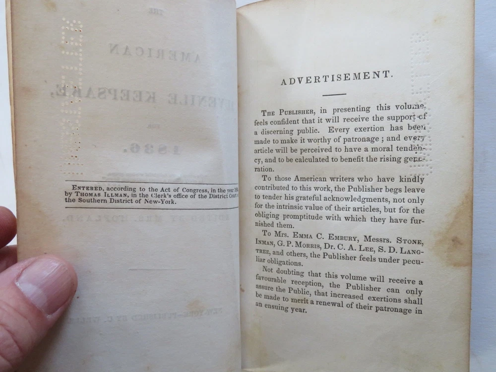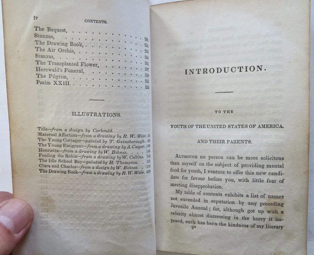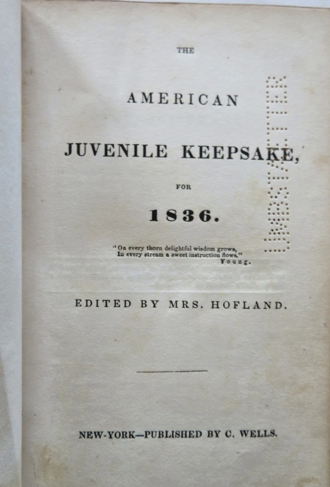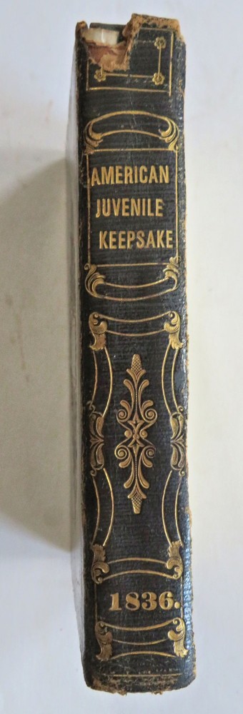American Juvenile Keepsake Poetry Collection 1836 fine gilt leather gift book American Juvenile Keepsake Poetry Collection 1836 fine gilt leather gift book (Old Books, 19th Century Books, Leather Books, Gift Books, Juvenile Books, Poetry). The American Juvenile Keepsake for 1836. Published 1835, New York by C. Wells. 250 [252] pages. Text in English. Engraved half title protected by original tissue guard, with nine charming steel engraved plates (mostly by Illman). A rather early American juvenile annual in a splendid gift binding which is in need of restoration but remains attractive. Attractive antiquarian full leather binding, smooth spine, gilt title lettering, gilt cover & spine decorations, all edges gilt. Book is physically old and shows some signs of handling and time. Binding well age worn but still appealing, front cover detached , chipping to spine head, remains overall very attractive as an object. Text block paper is gently age toned as typical, internally book remains mostly clean, tight and sound. A book which has been taken care of but may/ does not look like new. Still attractive on the shelf. Book displays a pleasing and unique age patina and is in rather nice antiquarian condition, any age flaws seem easy to overlook or forgive. Please review photos for more detailed attempt to present this book as it survives. We often over-describe any flaws that many sellers would not even bother to mention since most people would overlook them as minor and unworthy of comment. Many people tell us the books they receive from us are nicer in person than they appears on the screen. We want you to be clear about what you are buying, so we take numerous photos and try to describe it openly and honestly. Book Measures c. 6 1/4" H x 3 3/4" W. [B11876].