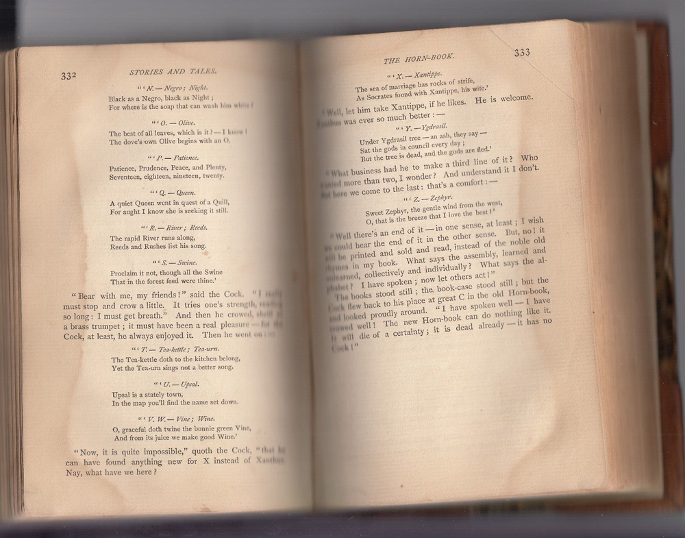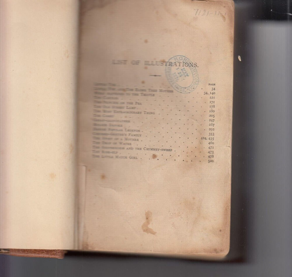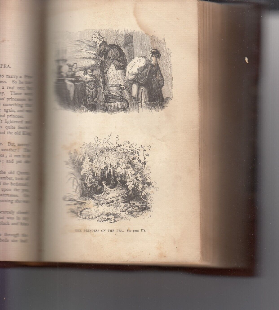 Andersen's Stories and Tales, Vol. II, H.O. Honghton & Co. (1870). Companion volume to the first, entitled "Wonder Stories Told for Children". This very RARE original edition includes extensive and detailed notes from the author's own journals, describing the origin and succession of many of his best-loved stories. This 150+ year old book shows significant signs of age and wear, including some deterioration of the leather-bound cover, foxing and staining on most of the pages, and creases in the hinges. The binding is secure however; the text is readable, and the detailed illustrations are fairly clear. The publisher's date stamp appears on one page, but there are no other ink or pencil markings. Your purchase helps support the Lexington Public Library (Lexington, KY). Shipped from Lexington every business day.