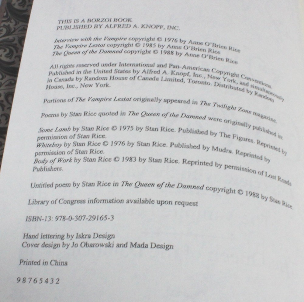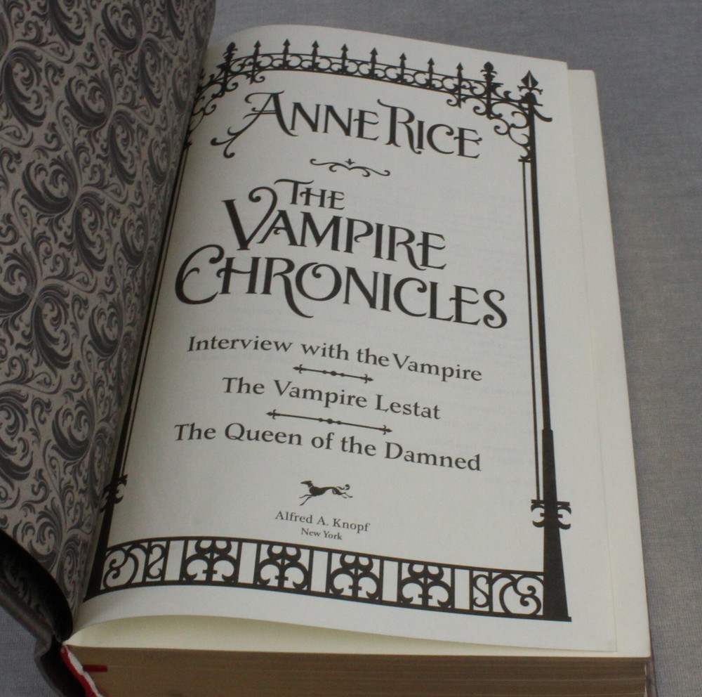 Here is THE VAMPIRE CHRONICLES by Anne Rice. It is a compilation of the first 3 Vampire books together in 1 volume. See detailed info below. It measures about 9.5 x 6 x 2.5 inches. Excellent condition. Pages are crisp and clean with gilt edges. The only tiny imperfection is an edge ding on the back as pointed out in the last photo. Interview with the Vampire (1976) Louis de Pointe du Lac tells a young reporter the story of how he had been made a vampire in 18th-century New Orleans by Lestat de Lioncourt. In creating and sheltering the child vampire Claudia, Lestat and Louis had unknowingly set tragedy in motion. The Vampire Lestat (1985) This book chronicles Lestat's own origins, as he resurfaces in the modern world and attempts to find meaning by exposing himself to humanity in the guise of a rock star. This attracts the attention of the ancient vampire Marius de Romanus, and culminates in the accidental awakening of Akasha, the ancient Egyptian queen and first vampire, who has been immobile for millennia and safeguarded by Marius. The Queen of the Damned (1988) Lestat has awakened Akasha, the first of all vampires, who has in her thousands of years of immobility, contrived an idealized way to achieve world peace, by killing almost all males and destroying all other vampires. She is herself destroyed by the vampire witch Mekare, who has awakened and returned after 6,000 years to fulfill a promise to destroy Akasha at the moment she poses the greatest threat. A Borzoi book is a book published by the Borzoi imprint, which was founded by Alfred A. and Blanche Wolf Knopf. The term "Borzoi" is used to describe a wide range of Knopf books published in the 20th century. Characteristics of Borzoi books Known for their quality, distinctive format, and fine bindings Designed to be treasured for their handsome design as much as their prose Feature the Borzoi logo on every title page and casing Notable Borzoi books *The photos are of the actual item you will get. *We pack safely, ship fast and can usually combine shipping. *All items are in stock and ready to mail quickly. *Everything we sell is smoke-free. *We accept multiple payment options thru eBay's managed payments. *We use eBay International Shipping to most countries. *We appreciate your order!