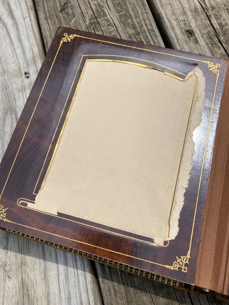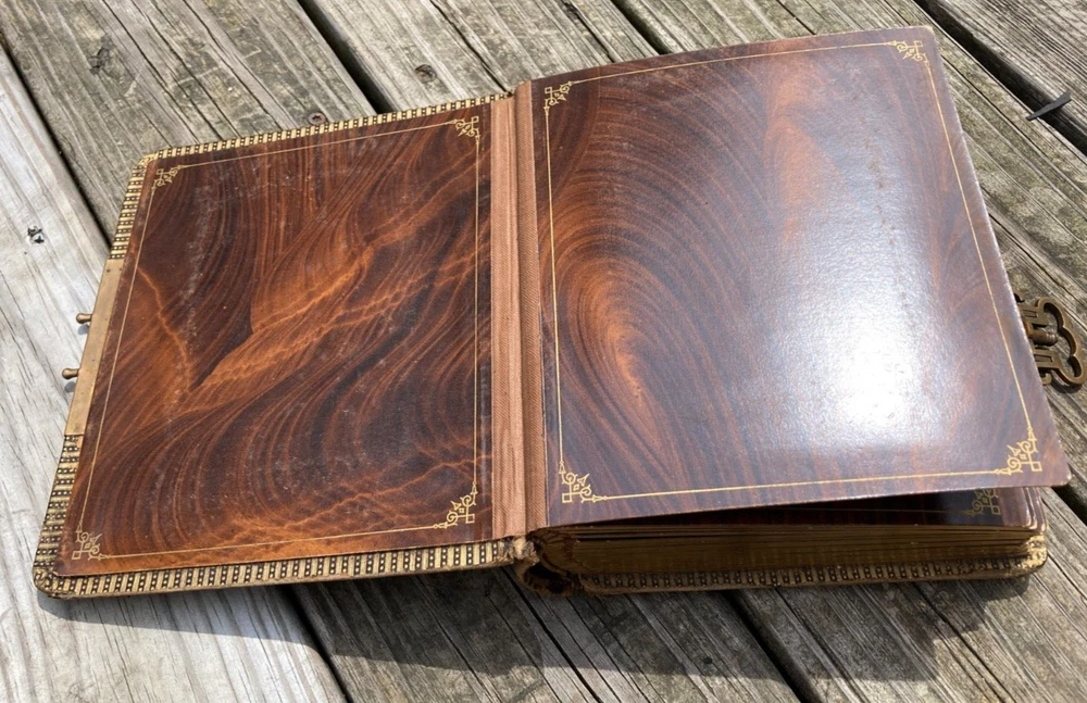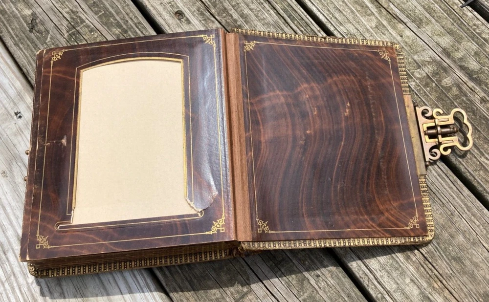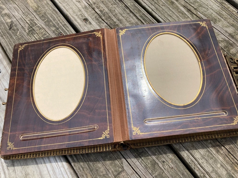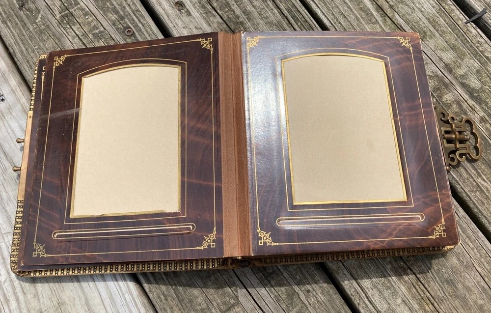 Antique Late 1800s Leather-Bound Photo Album with Ornate Metal Clasp Size of photo album is 7" W x 8 1/2" H x 2 1/2" thick. Brown leather cover embossed with design with gold embellishment in some of the decoration on front cover. Reads "Album" on spine in gold. Photo album holds large cabinet cards size 4x6. 18 pages in album. 2 photos to a page, so holds 36 photos. Photo openings on pages are rectangle format with arched top and some are oval. There are some tears around openings of some of the photo pages. Pages are very thick cardboard with wood grain looking finish and gold ornate border decoration. Page edges are gold. Leather cover is worn, as seen in photos. Binding is still ok. Not super tight, but also not falling apart. Very ornate metal clasp. It is spring loaded to adjust to thickness of album. Please see all photos for accurate condition. Smoke free home. I do accept returns within 30 days of receiving the item. Buyer to pay return shipping fees. Item must be in same condition as received to get full refund (minus shipping fees paid.) If there is a problem with the item, please message me to see if I can resolve it. Please Note: NEW INSURANCE POLICY NOTE: If an item is damaged during shipping it is now the buyer's responsibility to file the claim with the USPS. USPS will want to see the damaged goods before approving any claim. That requires the buyer to take all items and packaging to their local post office for inspection or send appropriate proof to carrier per their instructions. Sorry for the inconvenience. I package my items well so that there is a good chance that they will arrive to you unharmed. Unfortunately, if your item does arrive and was damaged during shipping then you need to follow the instructions above. I use USPS for all packages. I try to describe all of my items the best I can and provide ample photos showing condition. Please message me if you need additional photos or have questions. Thank you for looking at my item! Item #852