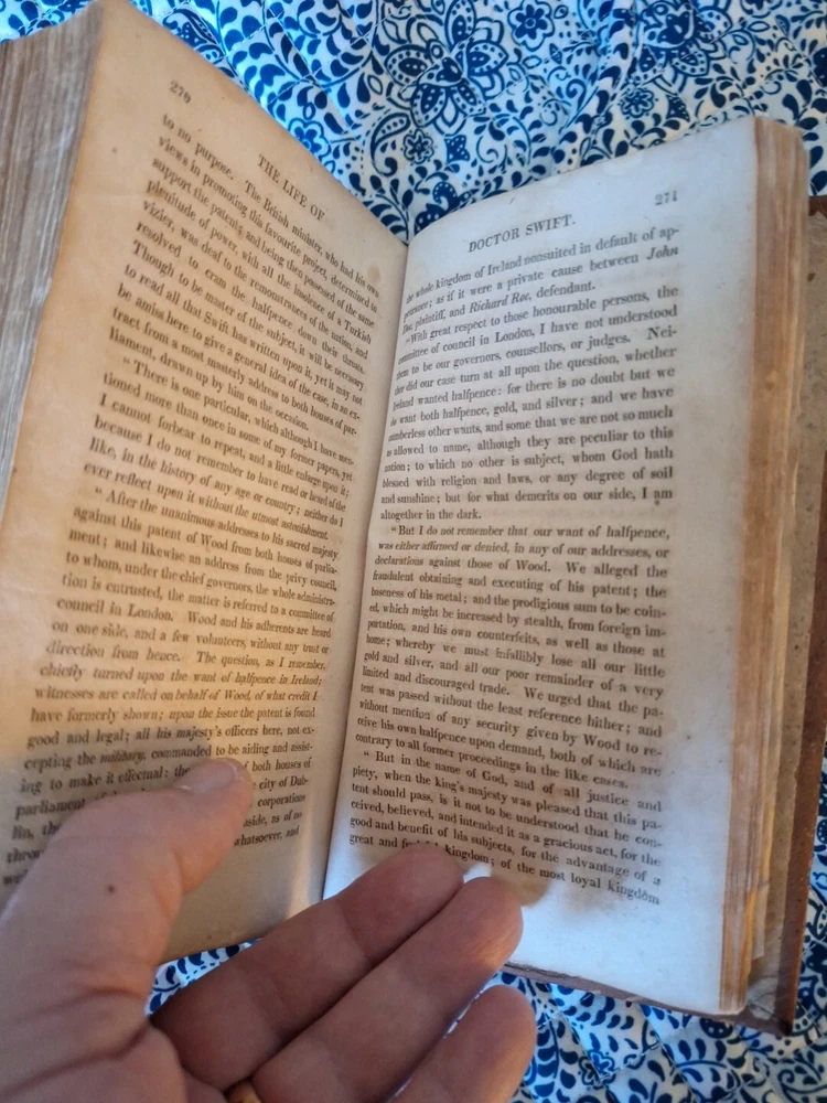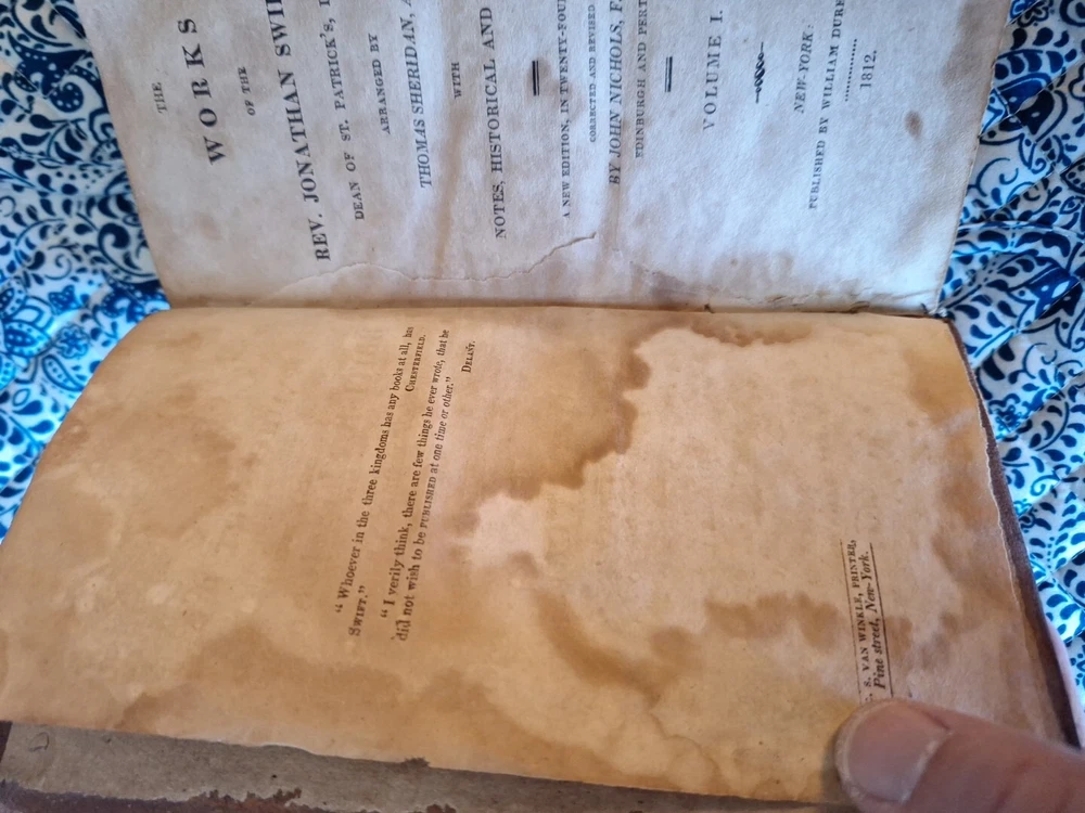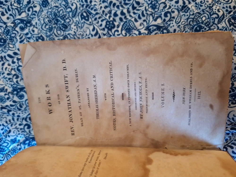 This is an antique leather-bound book titled "Swift's Works Volume 1" by Jonathan Swift, among others. Published in 1812 in New York by C S Van Winkle, Printer. The book contains a collection of essays in English. It is an original edition and was printed in the United States. Nice old 213 year old book,has foxing through out the book,but is readable, spine is tight,is very tipped, needs to be pressed out,Thank you very much for checking out my listing