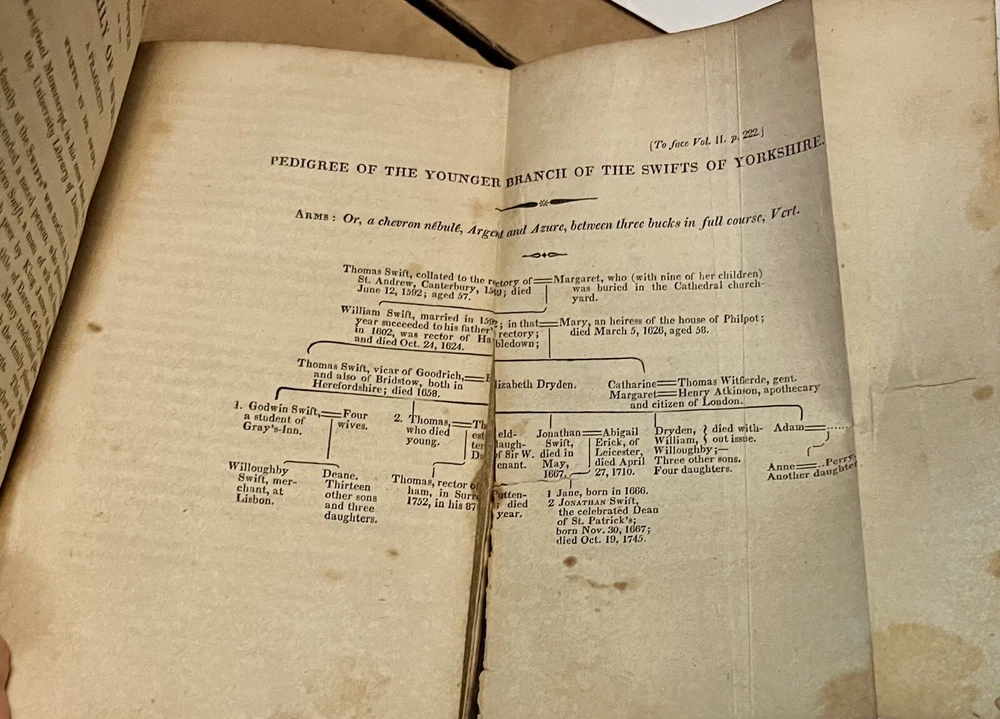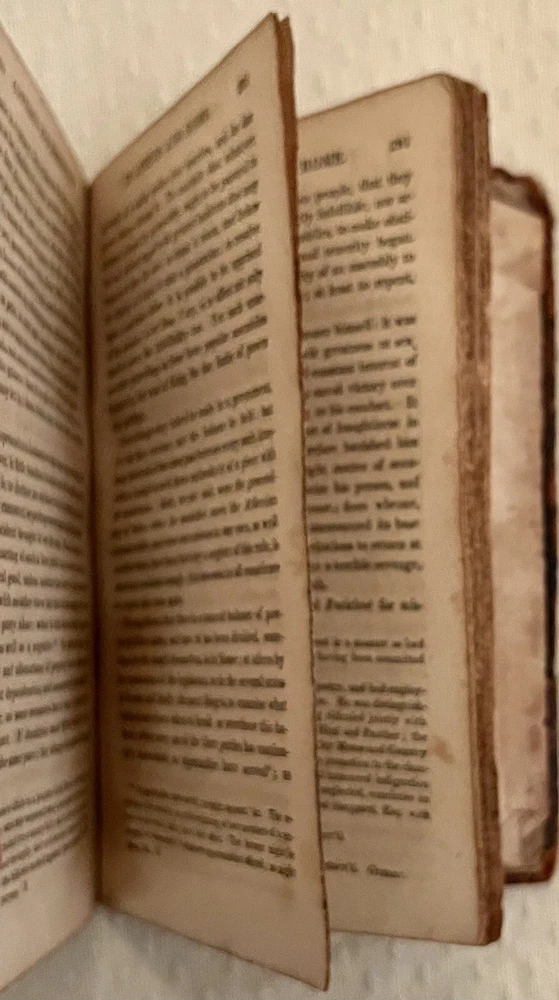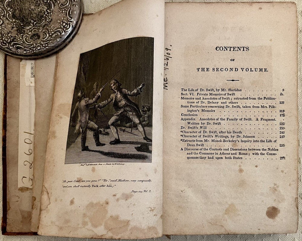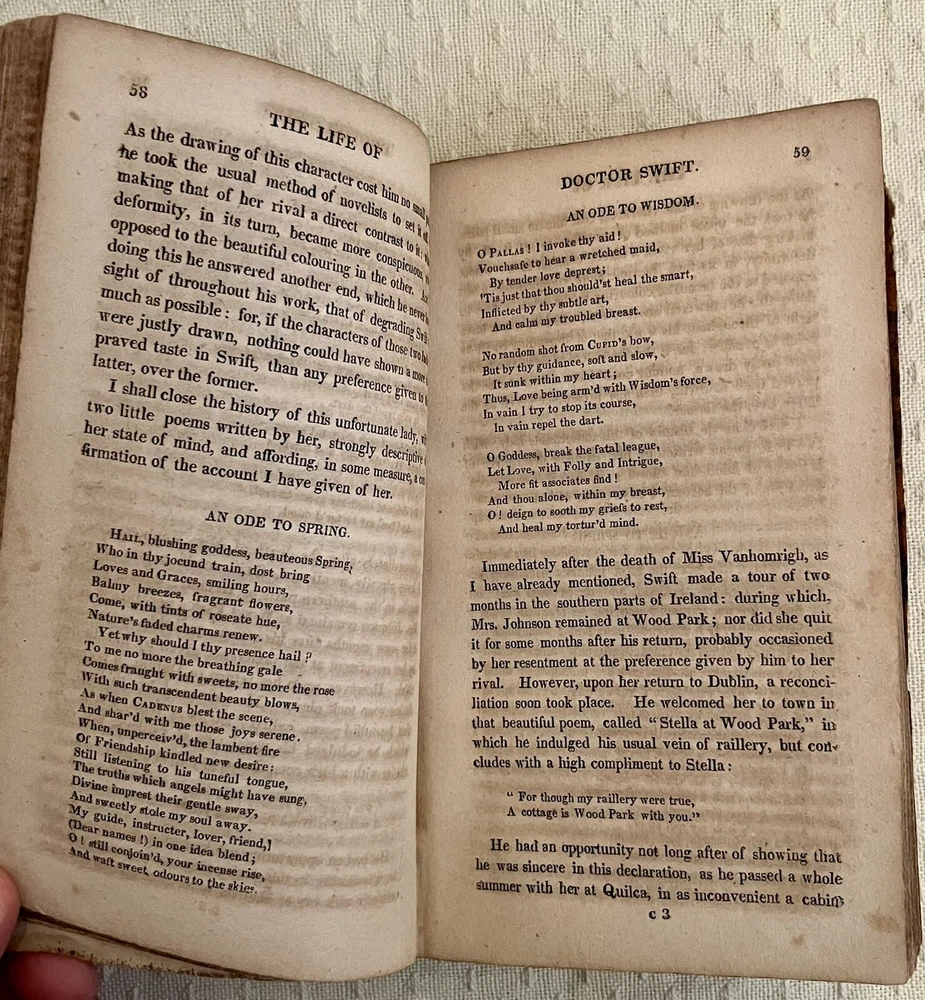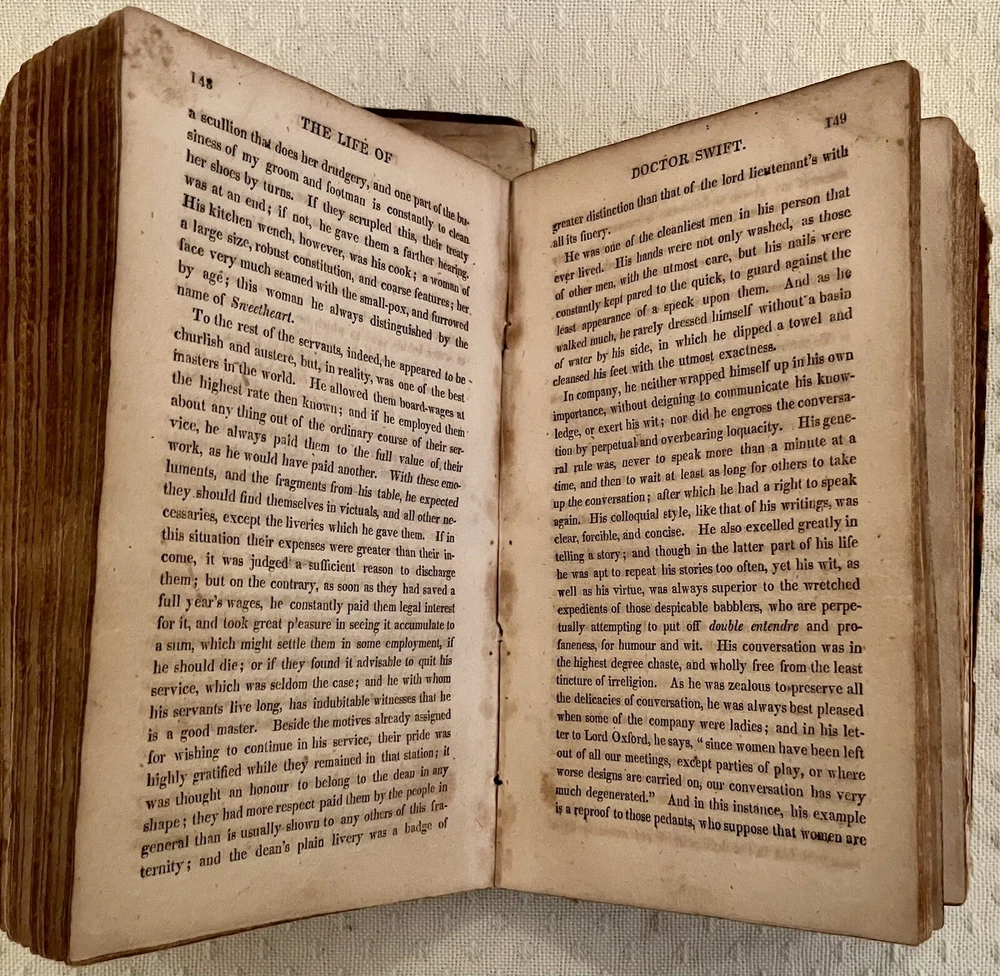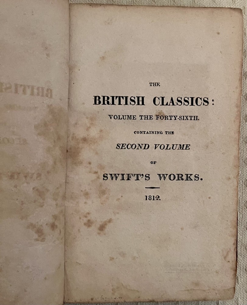 Antique book - one book only: second volume of Swift’s Works, 46th volume of British Classics, 1812, CS Van Winkle, New York, leather, 4 1/4” x 6 7/8”, 328 pages, former library book, complete to my knowledge. Please view the photo of contents to see all the authors. Condition is fair - boards detached, some bumps/chips/rubs on boards and on the spine, first blank page detached, some tears on fold out family tree, some yellowing and foxing, some soiling.