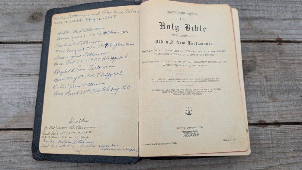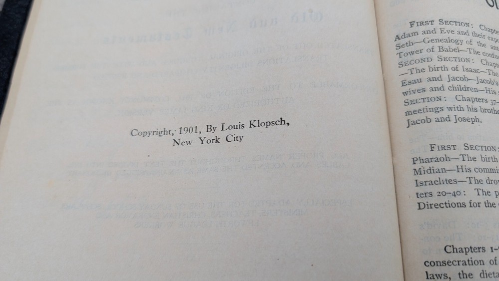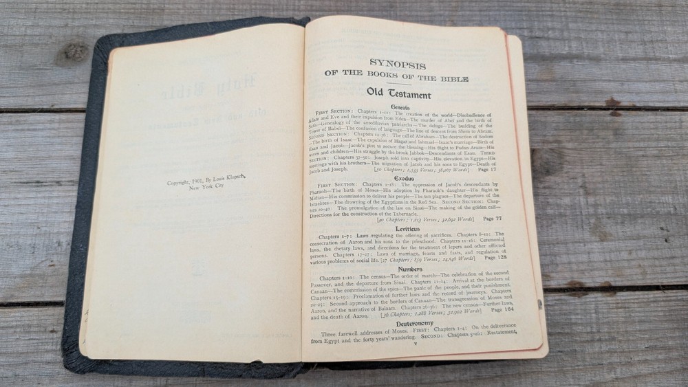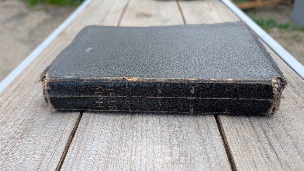 This antique 1901 Holy Bible is a King James Version, published by Louis Klopsch in New York City . It features a black leather-bound cover, gold-stamped spine, and large face Bourgeois type . Printed exclusively for Kress Stores , this edition is specially designed for Sunday-school scholars, ministers, and Christian teachers . This Bible includes Old and New Testament scriptures , a synopsis of the books of the Bible , and a record section where previous owners have inscribed family history details. The leather cover and binding show wear consistent with age, adding to its vintage character and authenticity . A rare collector’s item , this Bible is perfect for antique book collectors, religious scholars, and history enthusiasts . Key Features: Antique 1901 King James Version Holy Bible Black leather-bound cover with gold-stamped spine Published by Louis Klopsch, New York City Printed for Kress Stores Large Face Bourgeois type for easy reading Includes Old & New Testaments, book synopses, and family history records Condition: This Bible is in aged vintage condition , with visible wear on the leather cover, binding, and edges . The pages are intact but show signs of handling and age-related discoloration . The family records page contains handwritten entries, adding to the historical significance of this piece. Did You Know? Louis Klopsch, the publisher of this Bible, is best known for introducing the red-letter edition of the Bible in 1899 , highlighting the words of Jesus Christ in red ink. His innovation remains a widely used feature in modern Bibles.