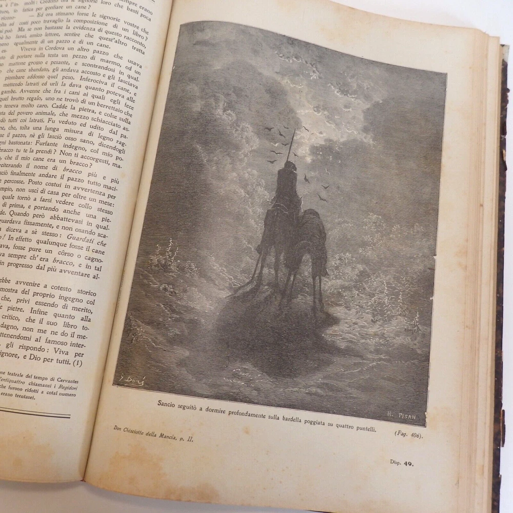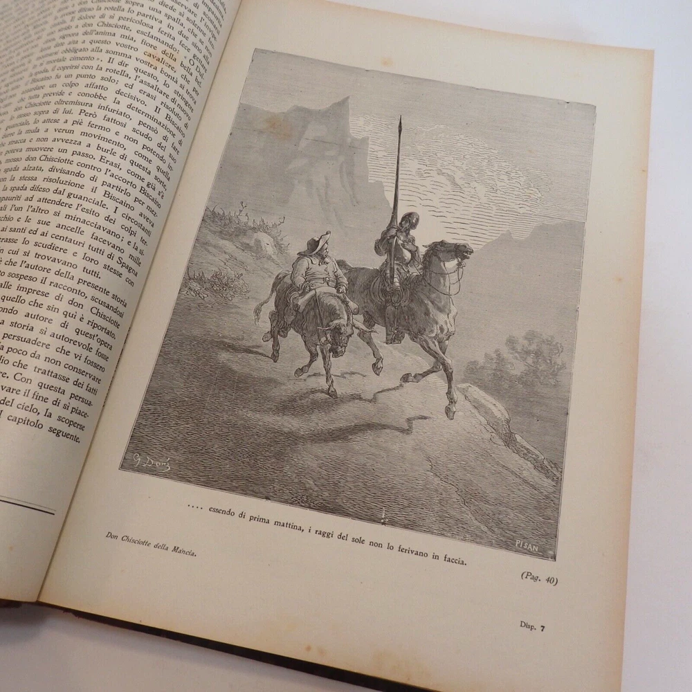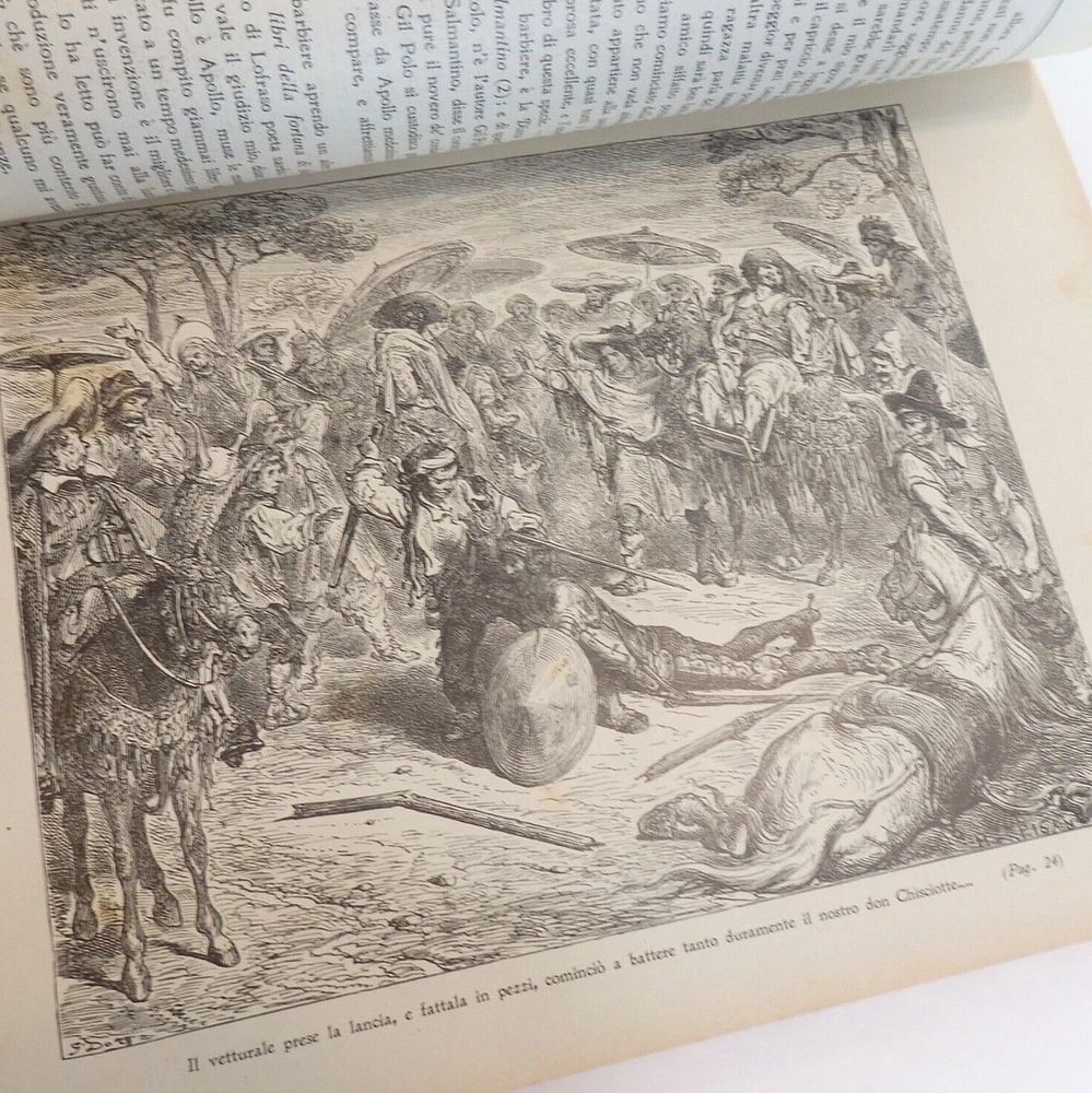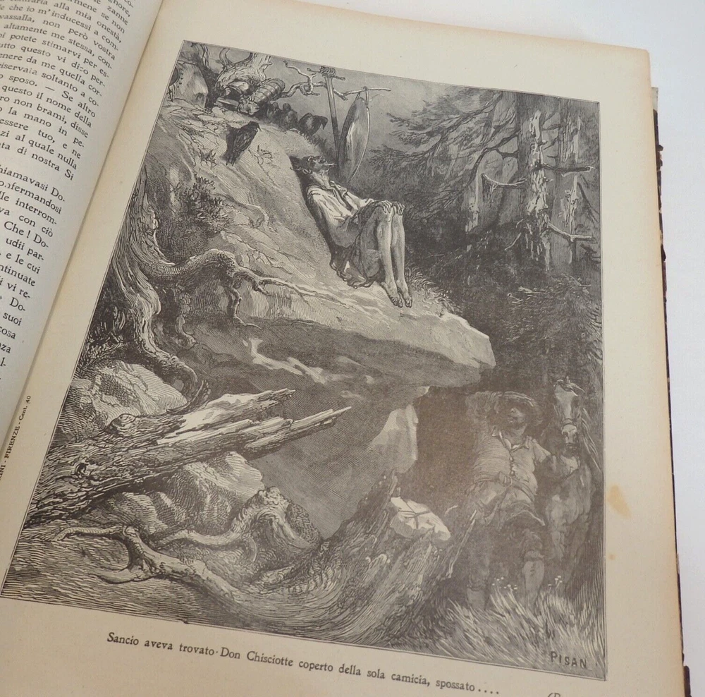 The famous Doré illustrated edition of Cervantes, in Italian. This is a lovely copy of this splendidly illustrated edition published in 1925. Gustave Dore is one of the most popular and greatest of all illustrators of Don Quixote. Doré went from being virtually unknown to being one of the most famous illustrators in the world. This edition of 808 pages has over 100 superb full page illustrations by Gustav Dore, whose depictions of the knight and his squire, Sancho Panza, have become so famous that they have influenced subsequent readers, artists, and stage and film directors' ideas of the physical "look" of the two characters. These pictures are romantic, dramatic, and very beautiful. Dore's original drawings were drawn in the 1800s were done as wood engravings. I accept returns. #BB
