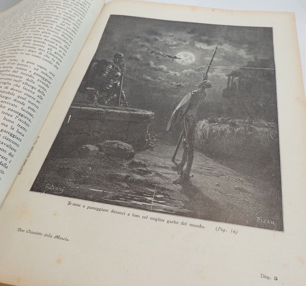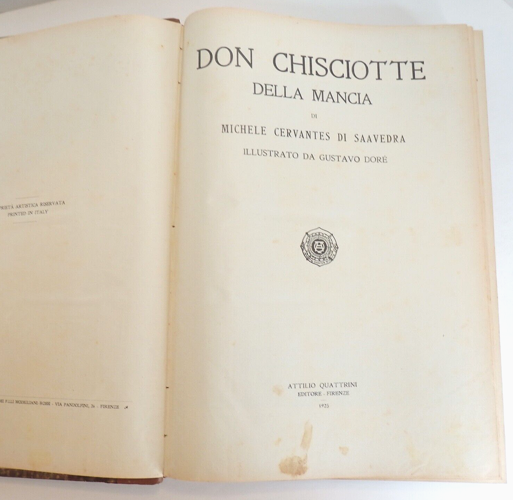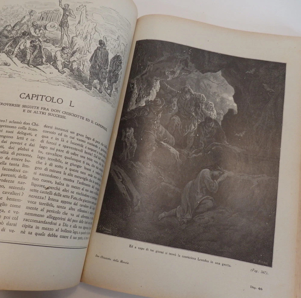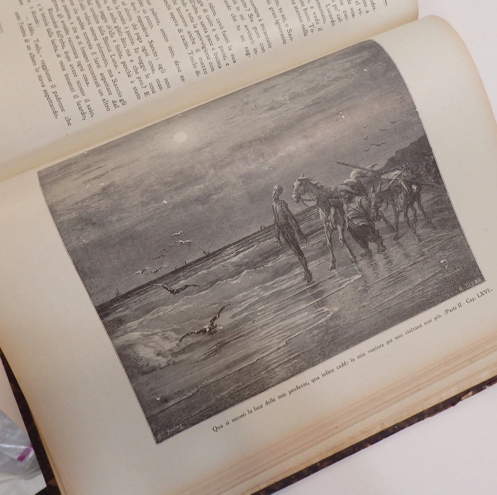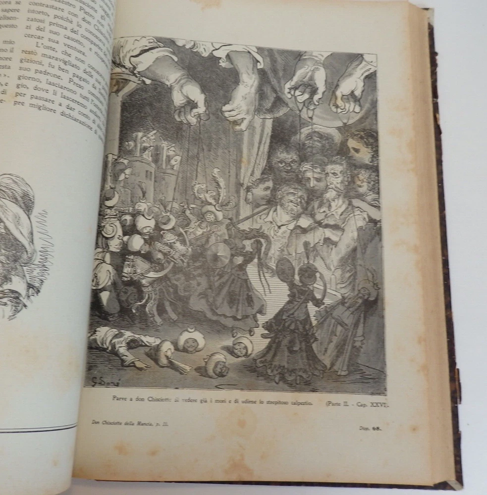 The famous Doré illustrated edition of Cervantes, in Italian. This is a lovely copy of this splendidly illustrated edition published in 1925. Gustave Dore is one of the most popular and greatest of all illustrators of Don Quixote. Doré went from being virtually unknown to being one of the most famous illustrators in the world. This edition of 808 pages has over 100 superb full page illustrations by Gustav Dore, whose depictions of the knight and his squire, Sancho Panza, have become so famous that they have influenced subsequent readers, artists, and stage and film directors' ideas of the physical "look" of the two characters. These pictures are romantic, dramatic, and very beautiful. Dore's original drawings were drawn in the 1800s were done as wood engravings. I accept returns. #BB